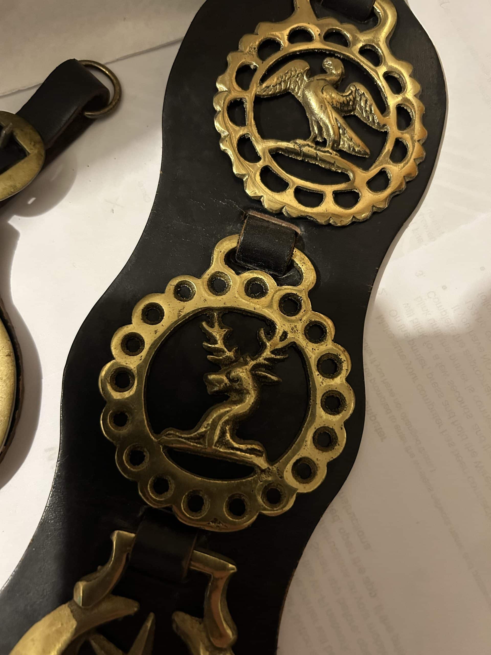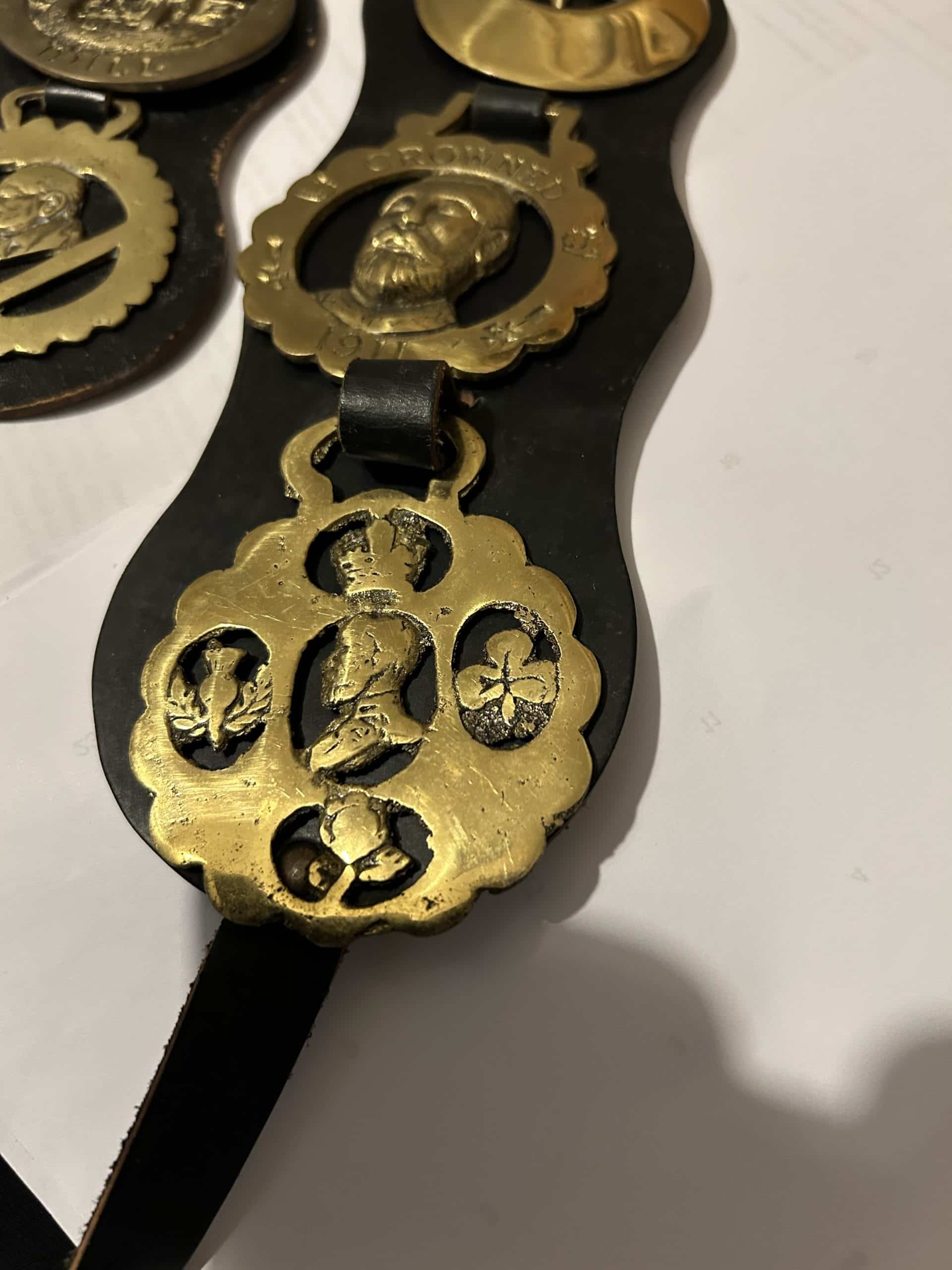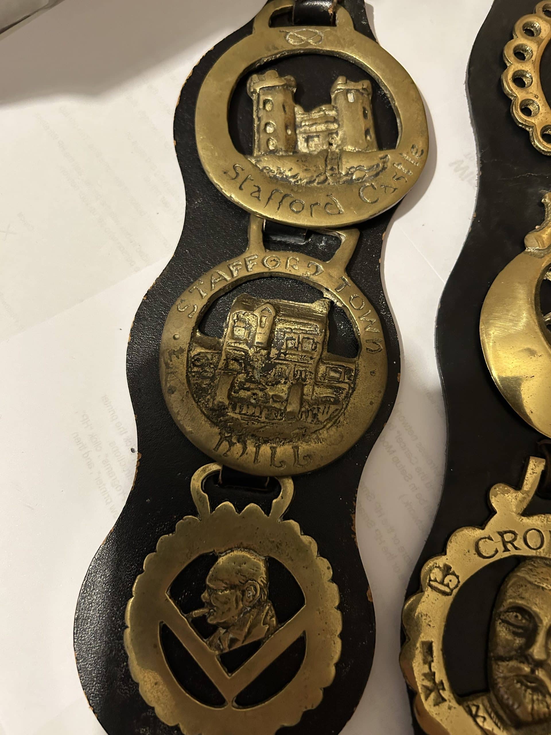 Horse Brasses on two straps one with 3 brasses and one with 5