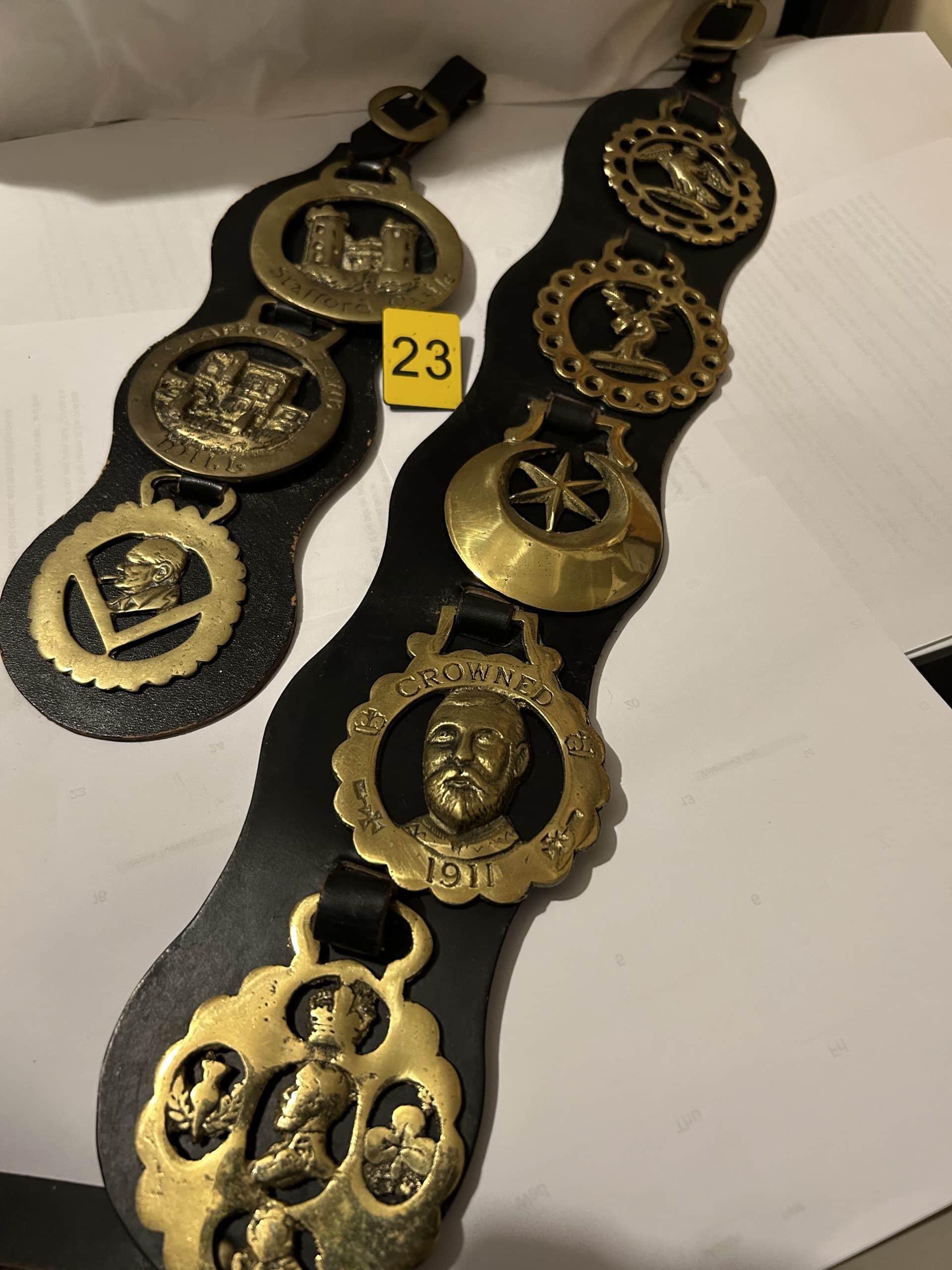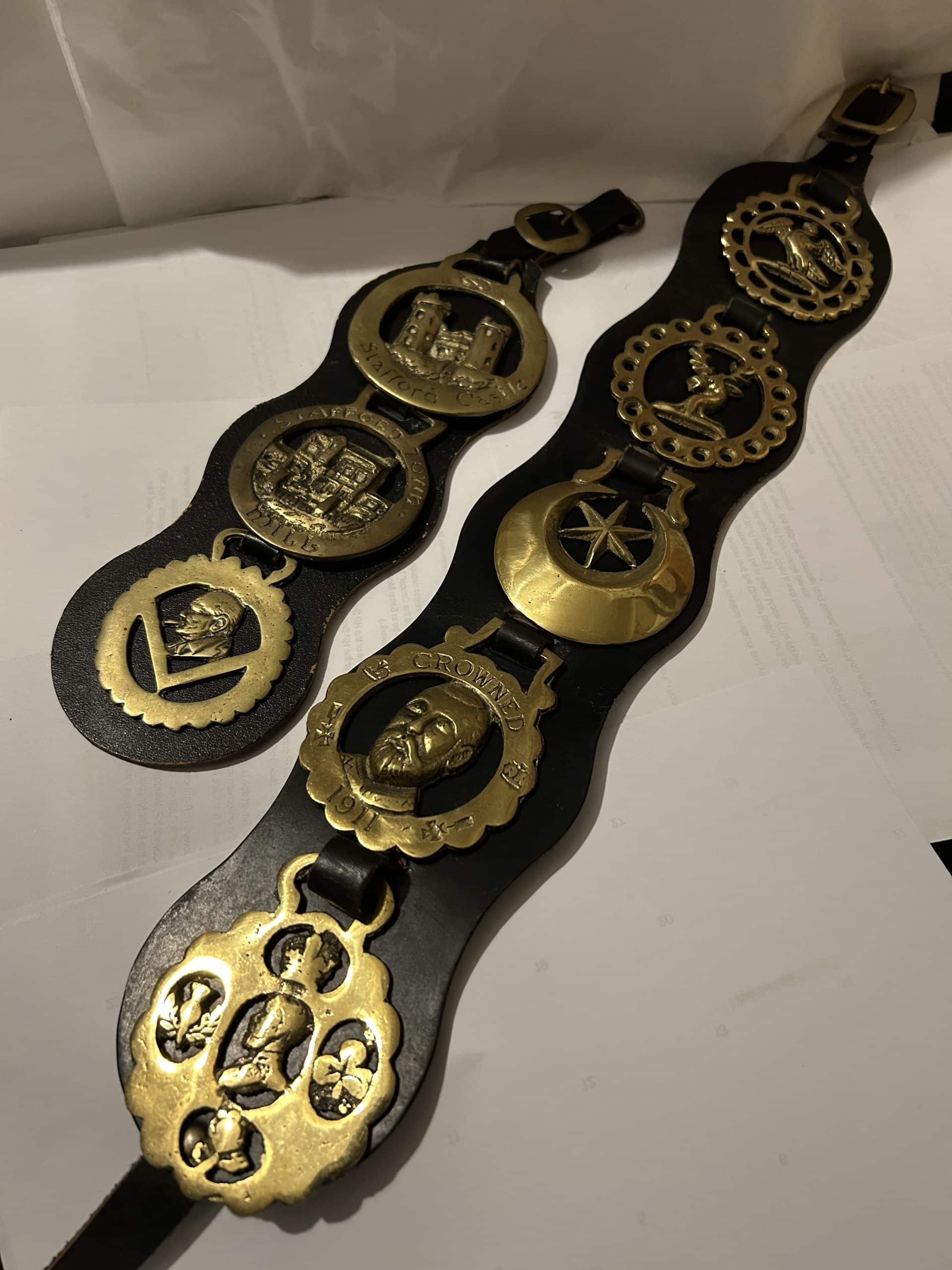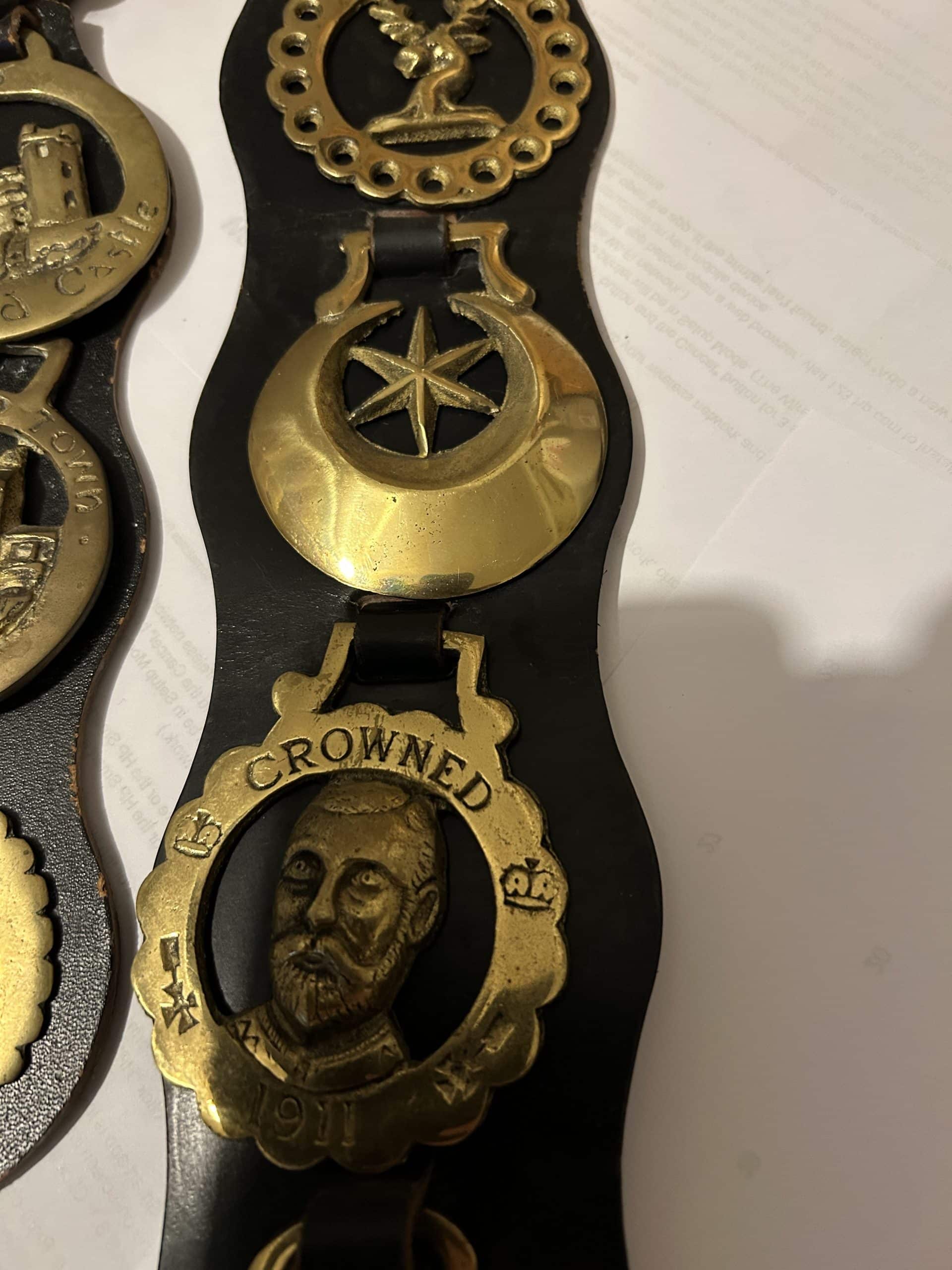 Horse Brasses on two straps one with 3 brasses and one with 5