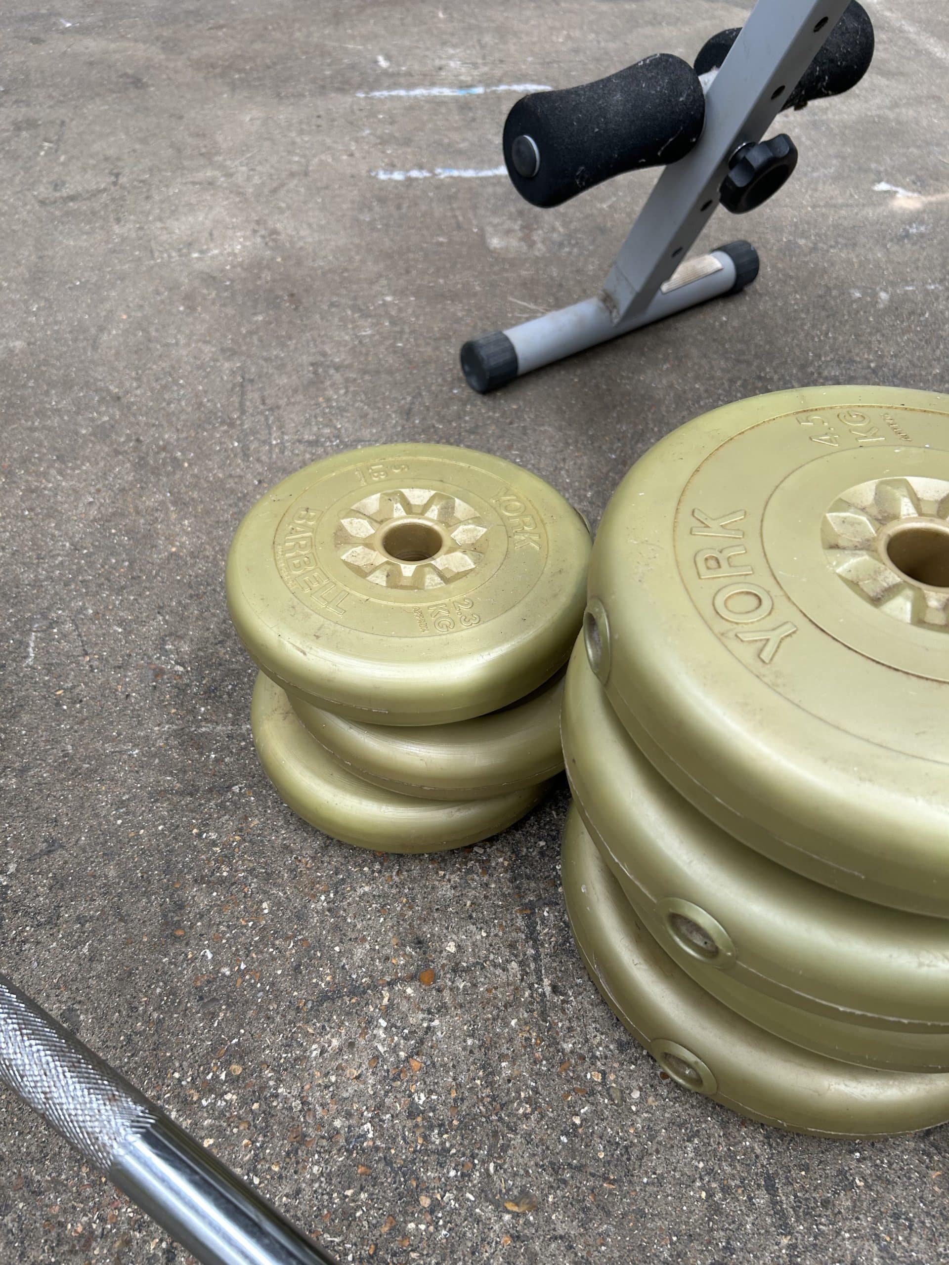 Tilly’s Auction (Part 2)| Item description: | Exercise bench, quantity or weights, barbell bar and dumbbell bars, weights 6 x 4.5kg, 6 x 2.3kg, 4 x 1.1kg (no locking collars for bars) |