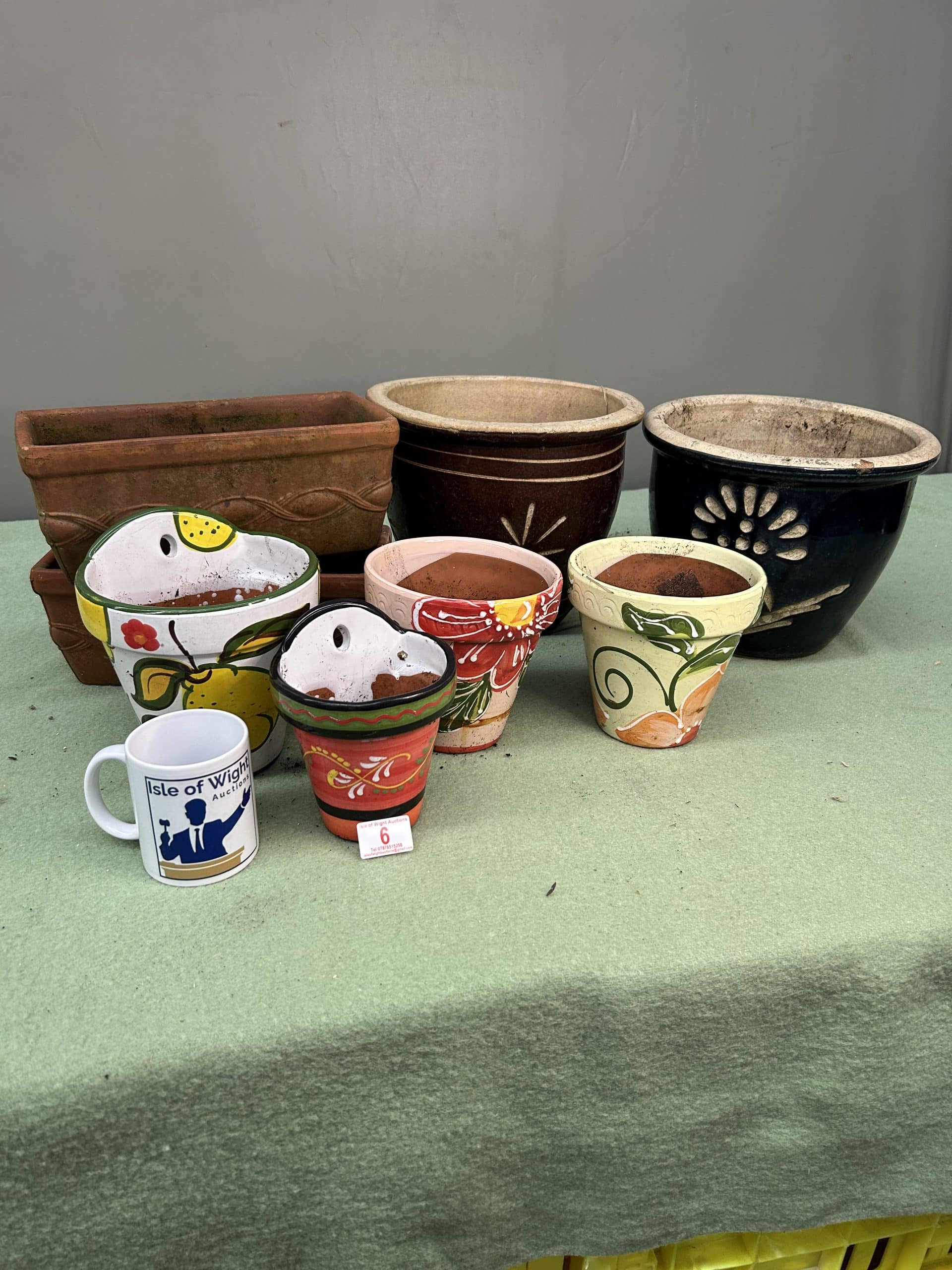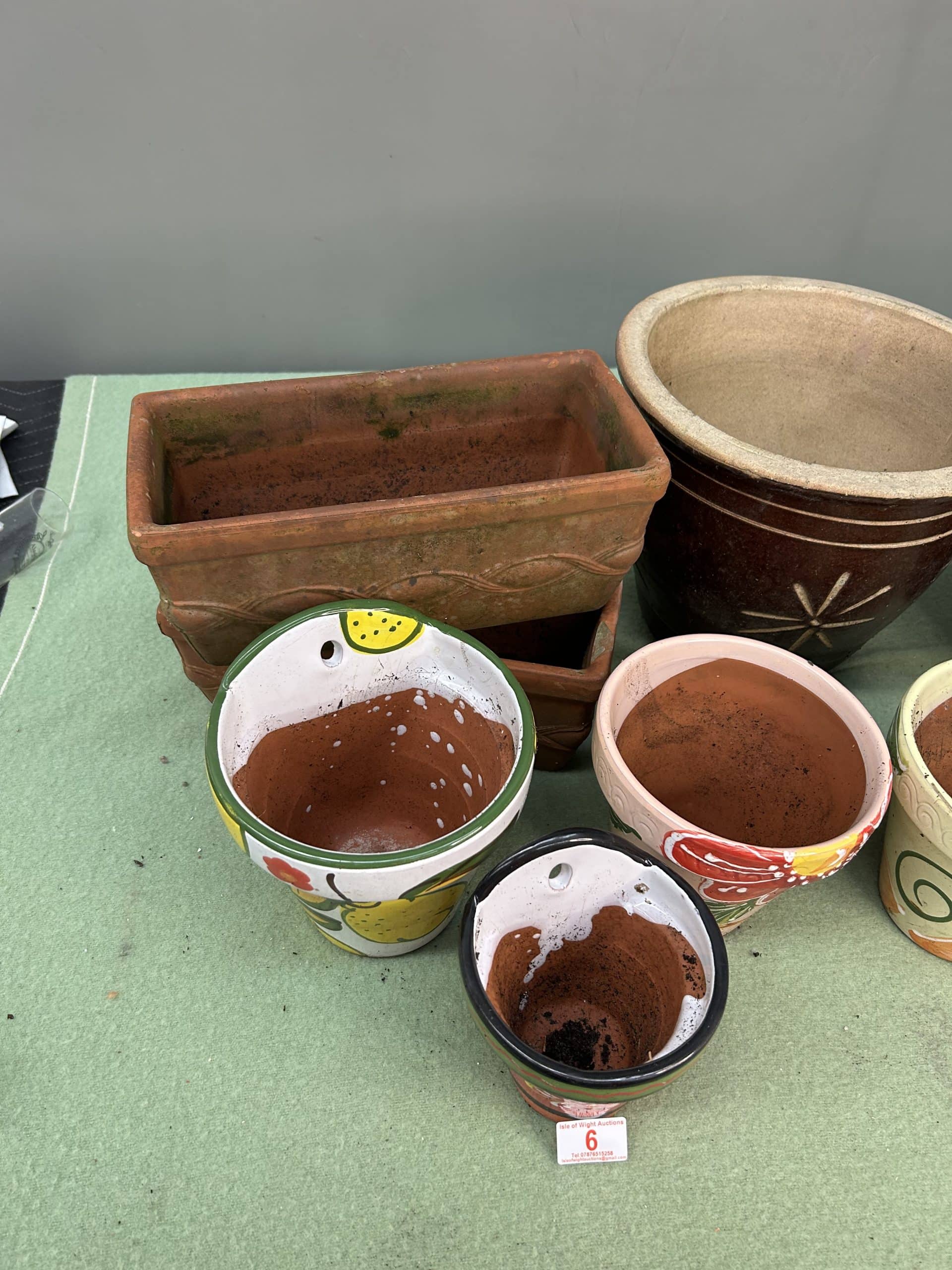 Various pots 2 larger pots, 2 terracotta troughs, 4 William Morris style (2 are wall pots)