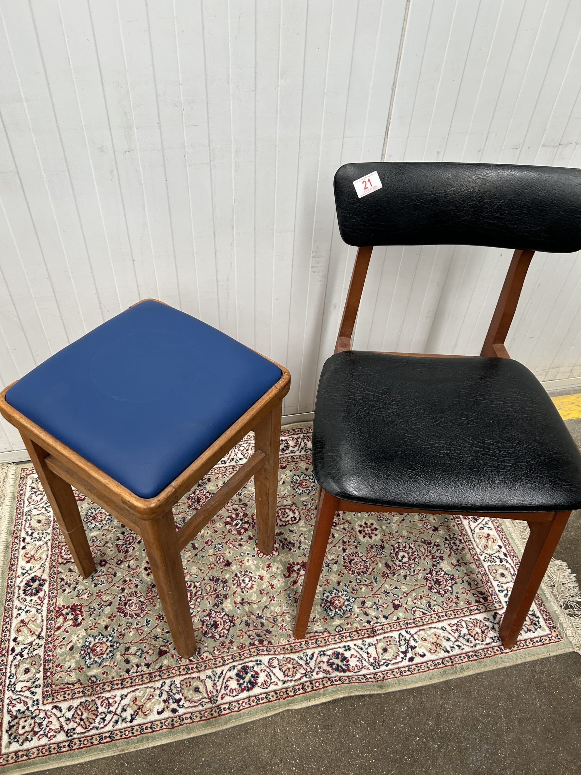 Tilly’s Auction (Part 2)| Item description: | Retro Mid Century Dining Chair black vinyl upholstery plus Kitchen Stool (carpet not included) |