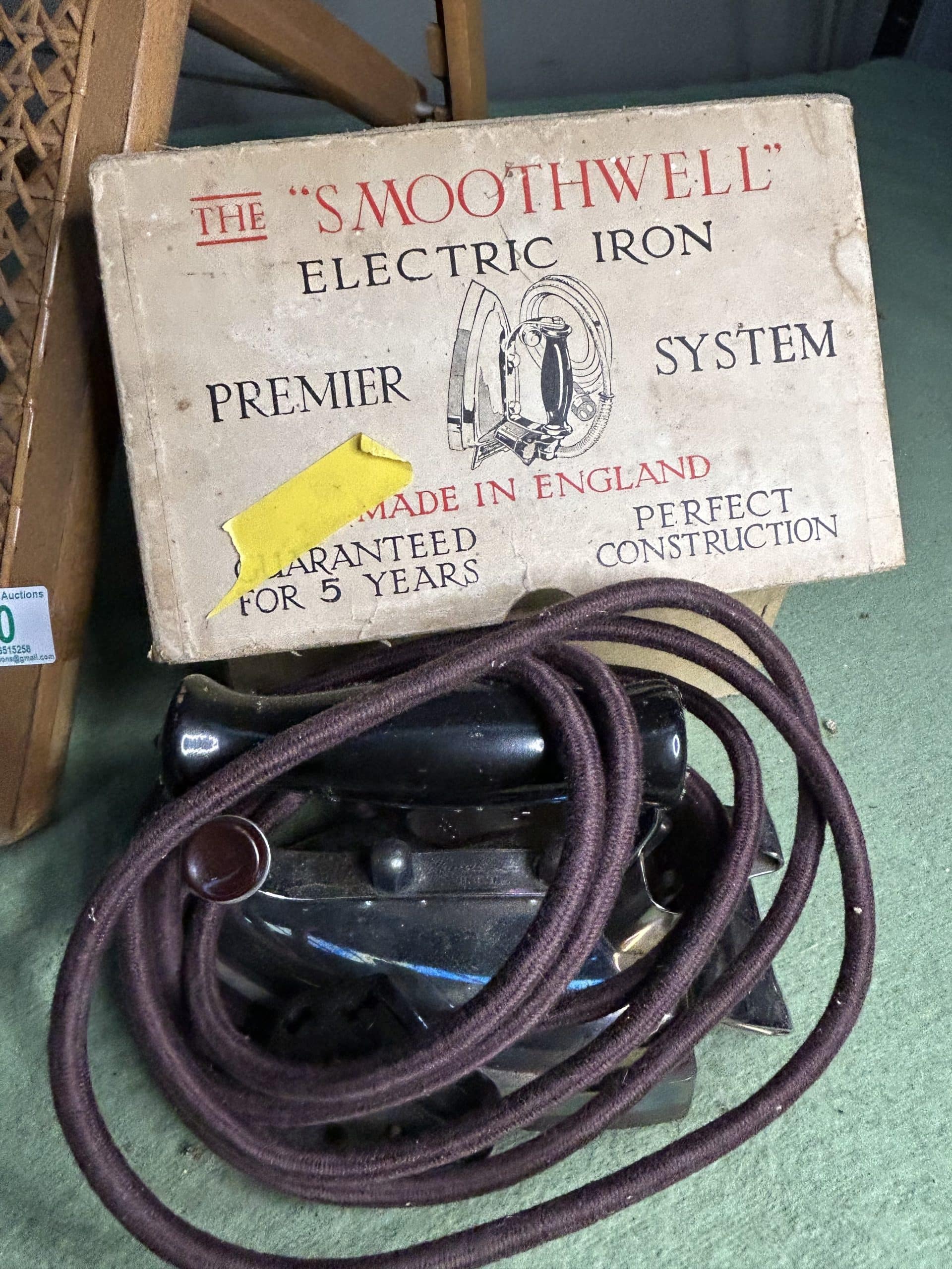 Mixed Lot includes adjustable cane back rest and two vintage travelling irons untested