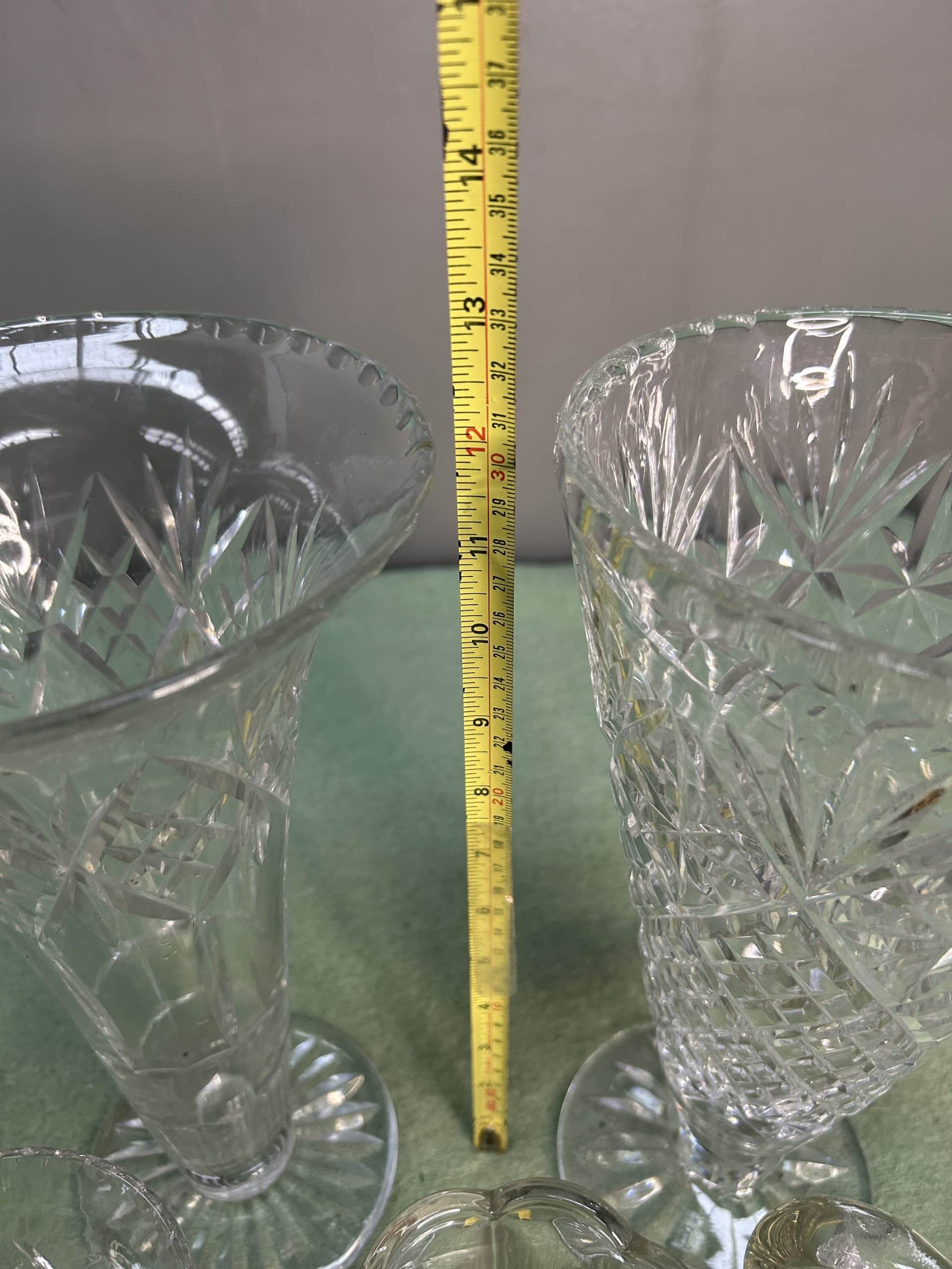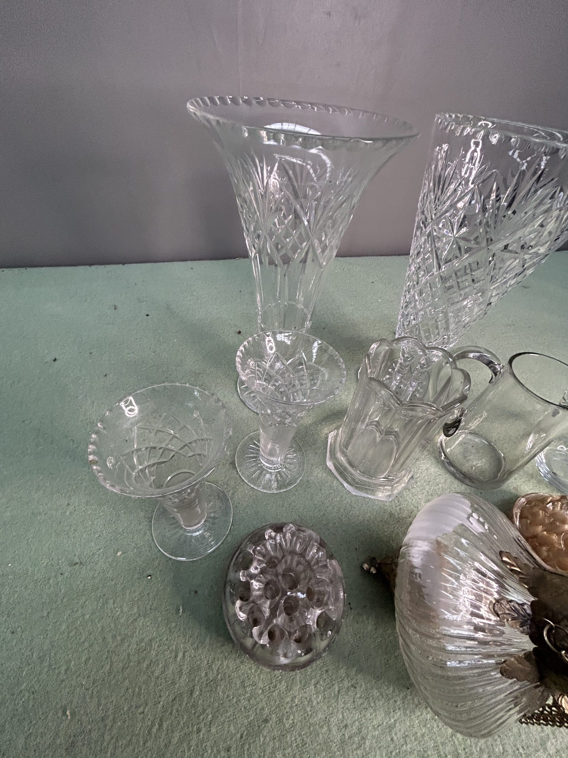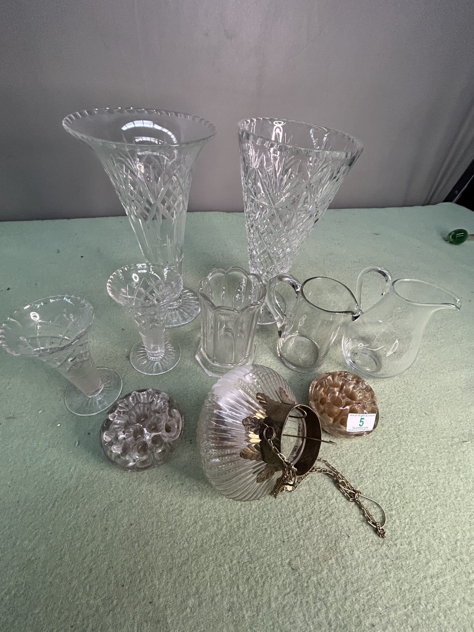 Sam’s Auction| Item description: | Mixed lot of glassware including two tall cut glass vases, two smaller posy vases, two jugs, two glass dome flower frogs and a hanging fancy glass tea light holder |