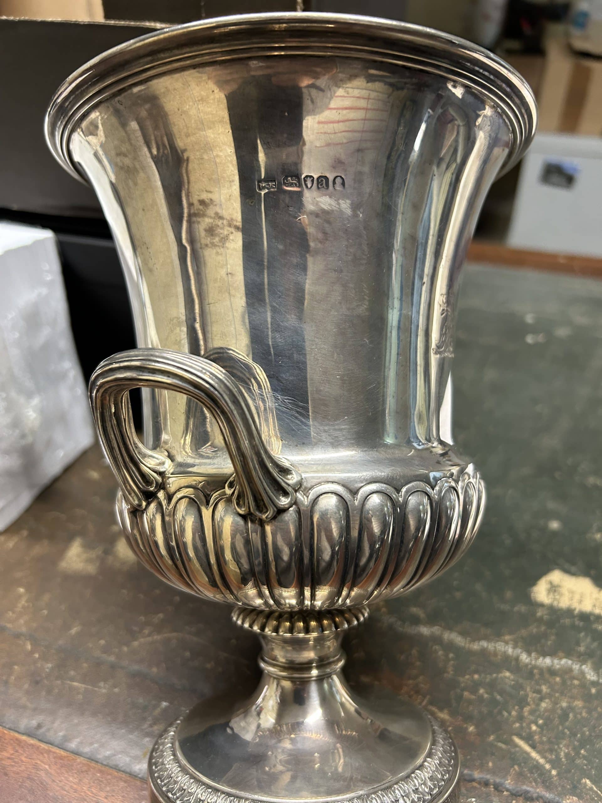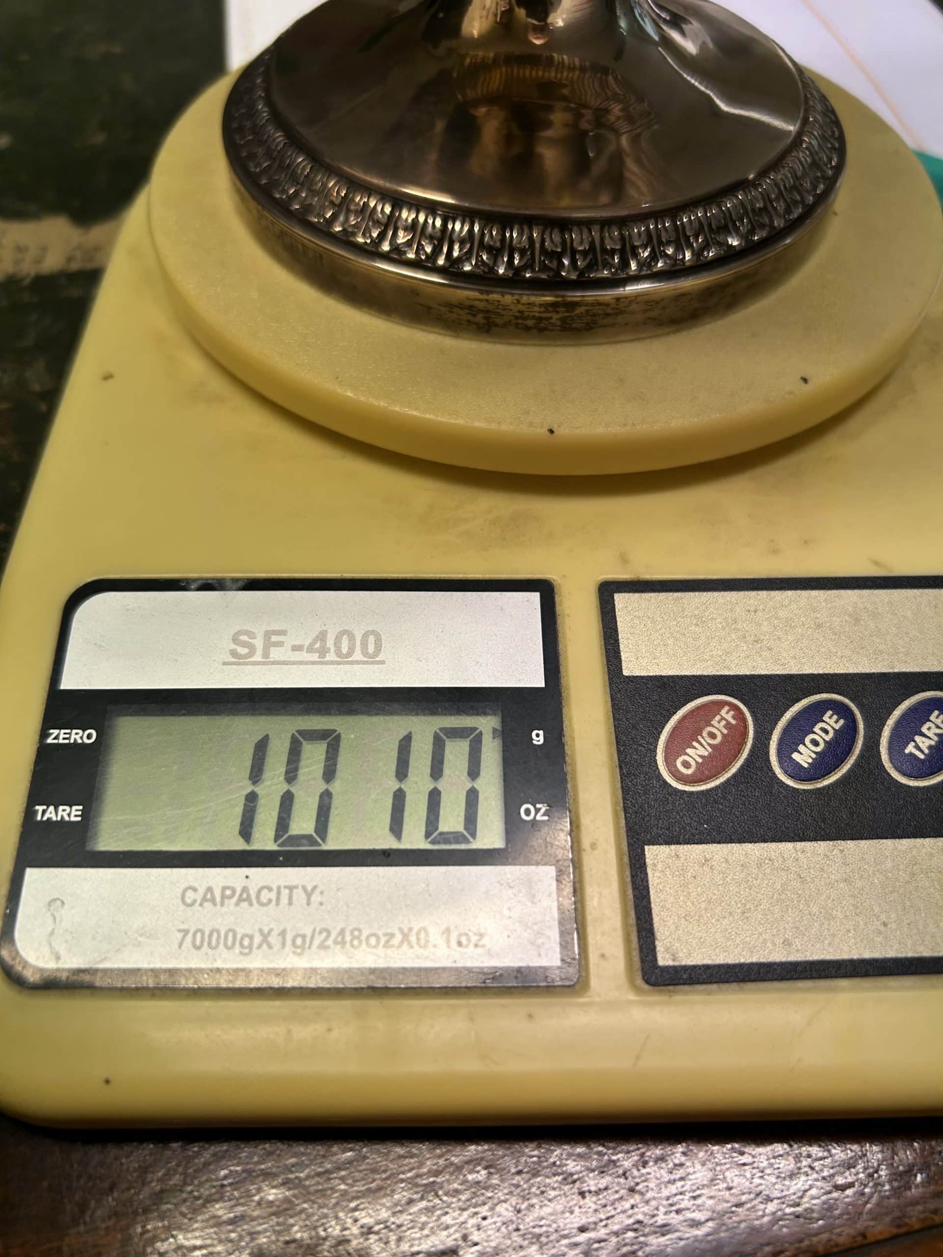 Sam’s Auction| Item description: | Mixed lot includes silver vase / urn, two glass perfume bottles with silver neck rings, two different designs of flower stick pins 6 yellow flowers and 5 pink flowers NB: The weight is just the urn without the wire top |