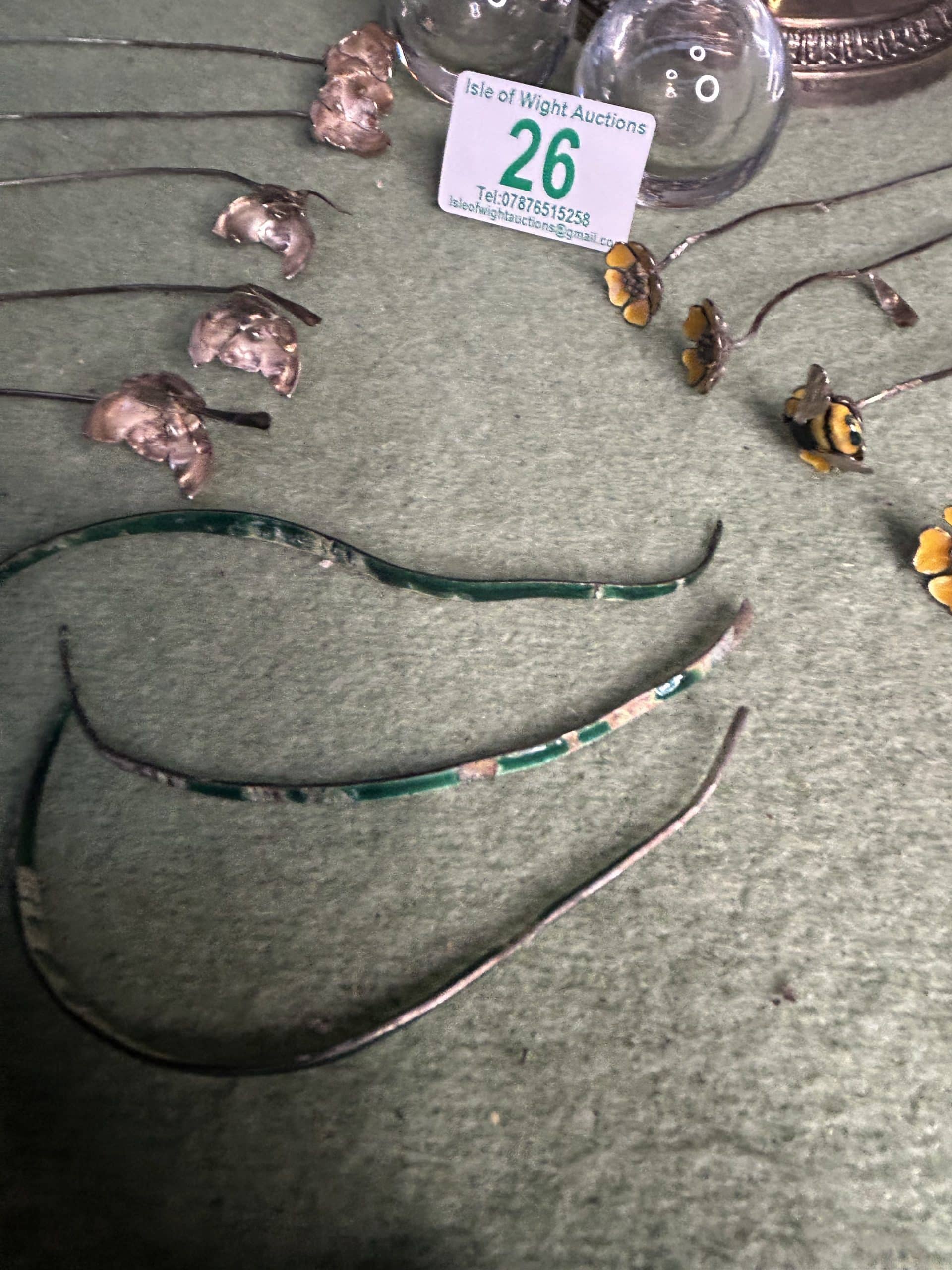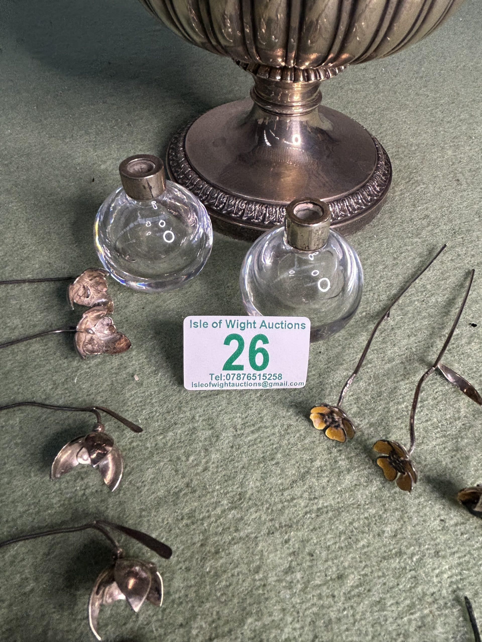 Sam’s Auction| Item description: | Mixed lot includes silver vase, two glass perfume bottles with silver neck rings, two different designs of flower stick pins 6 of each |