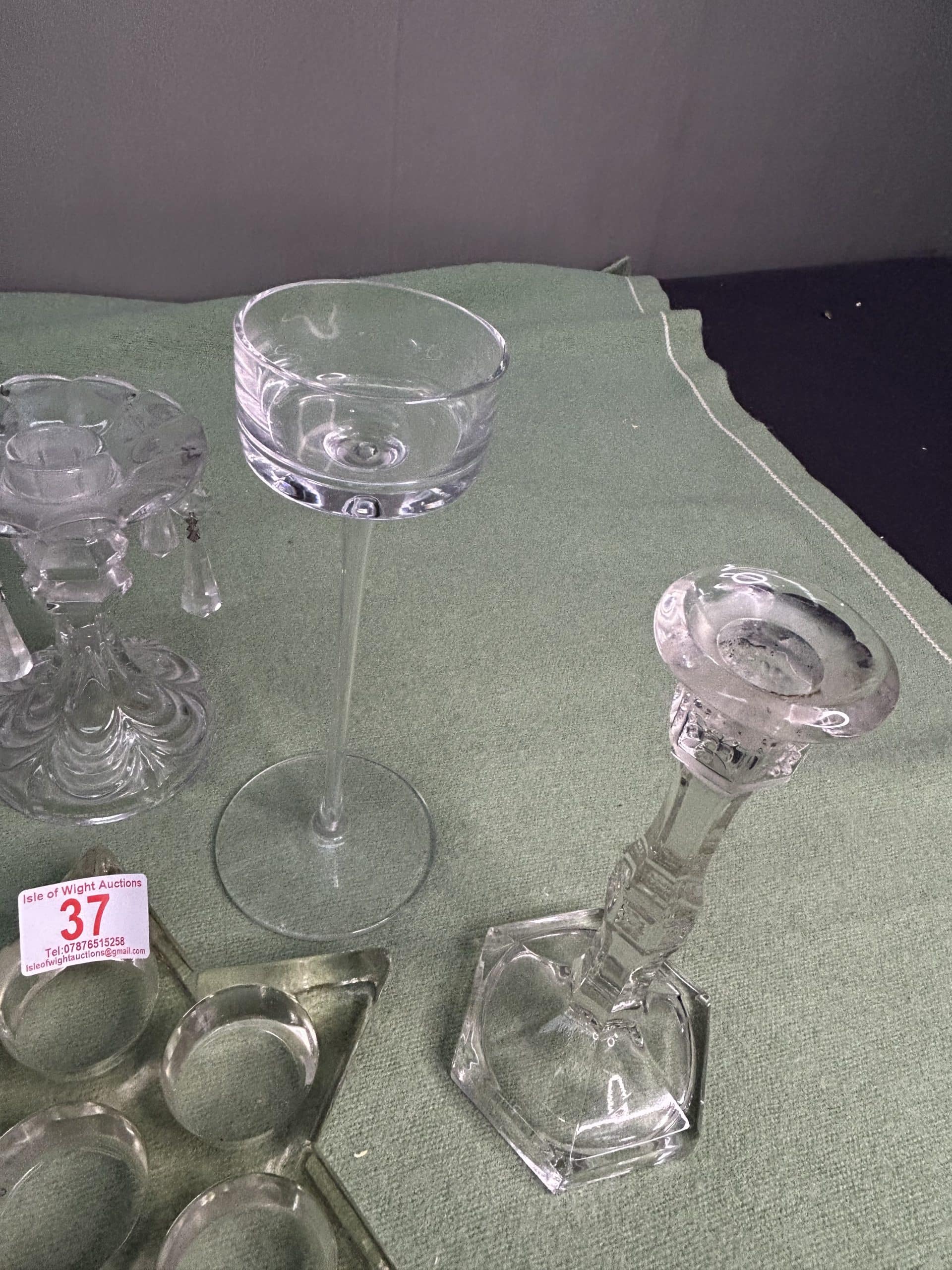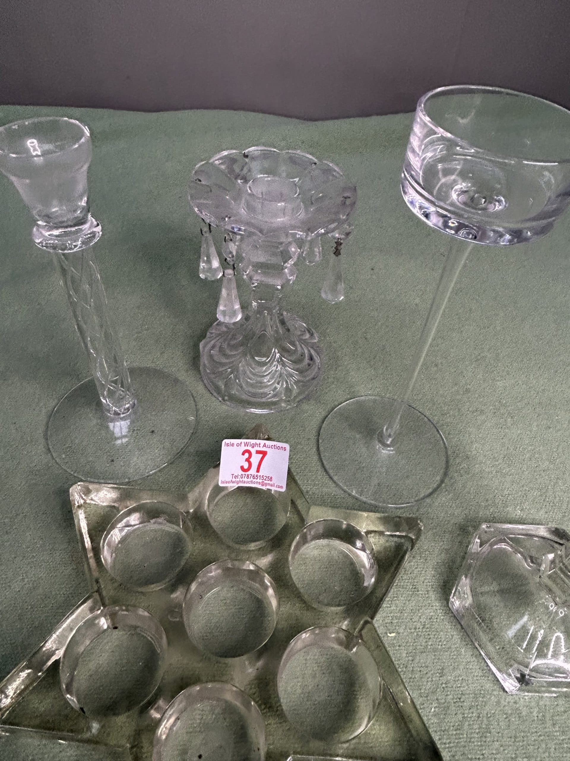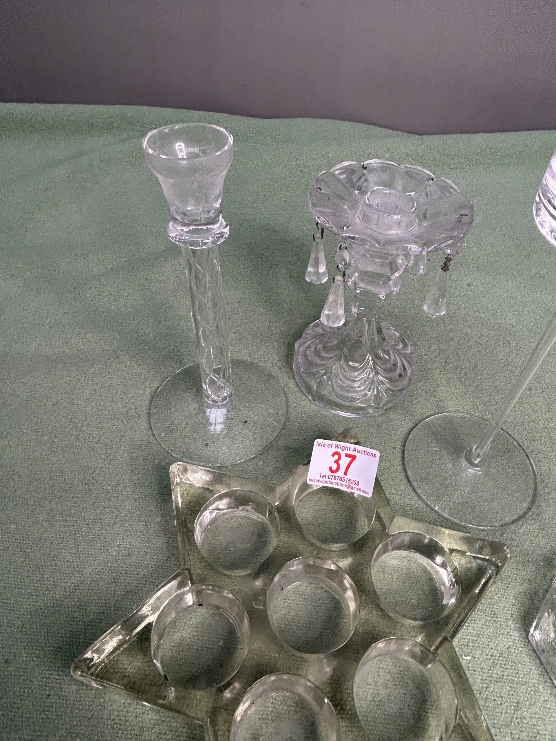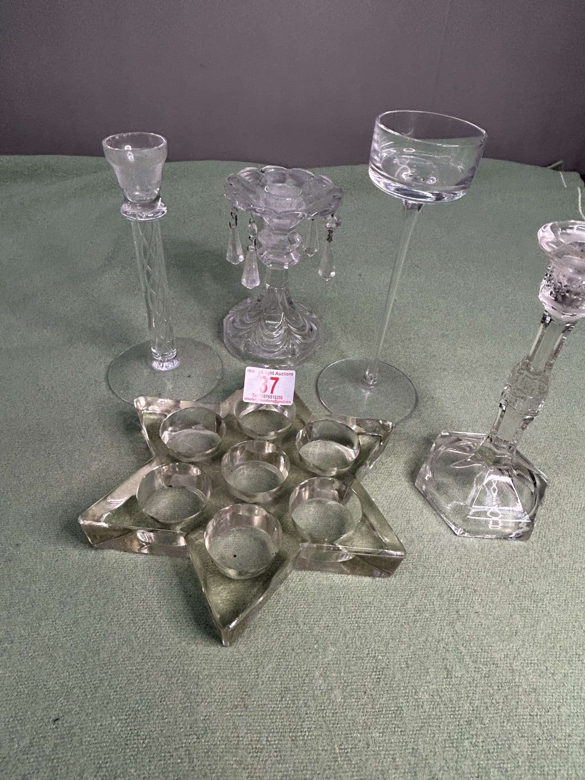 Downsizing Auction| Item description: | Collection of vintage glass or crystal candlestick holders, tea light holder and decorative pieces with drops |