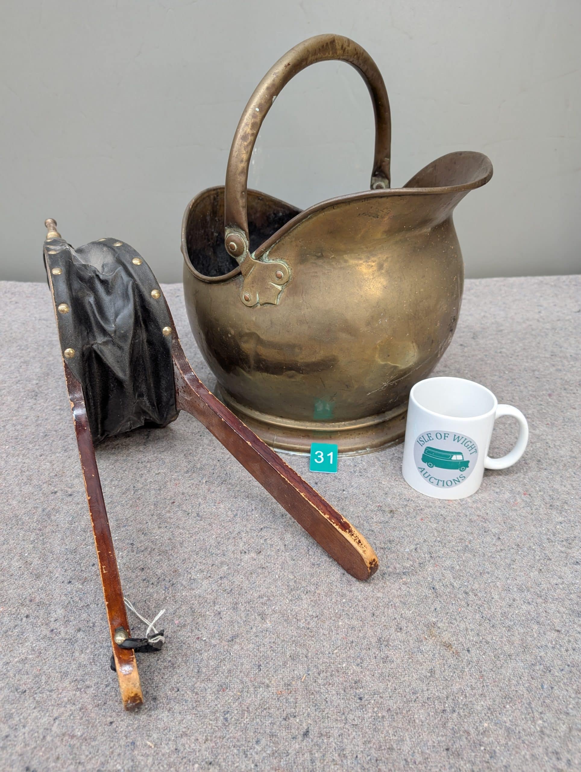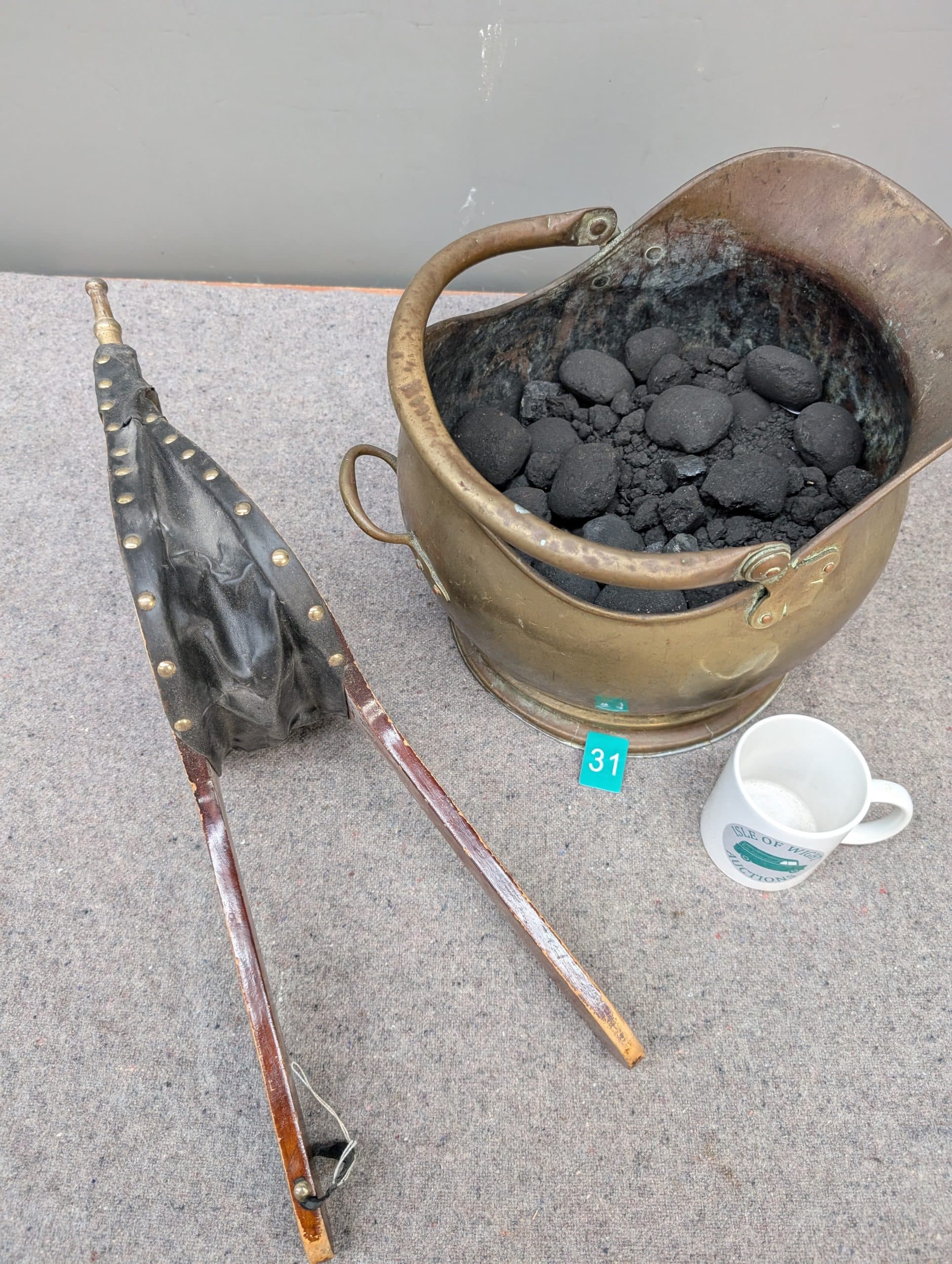 Dolly’s Auction| Item description: | A brass coal bucket and bellows. |