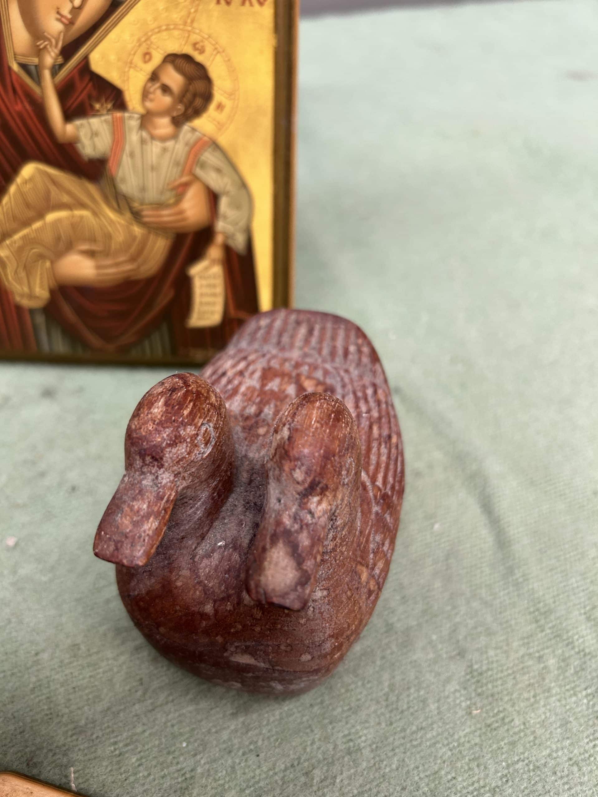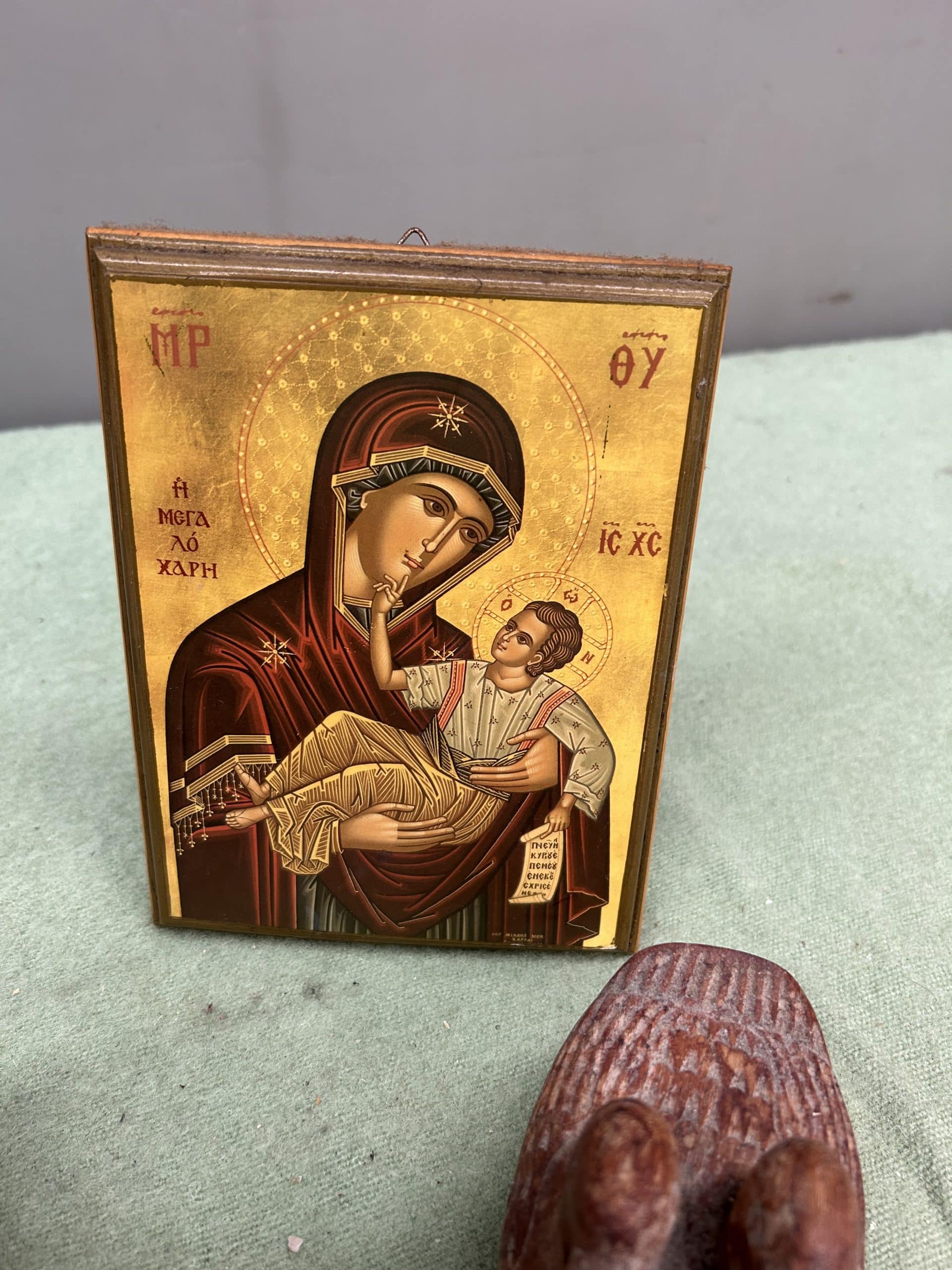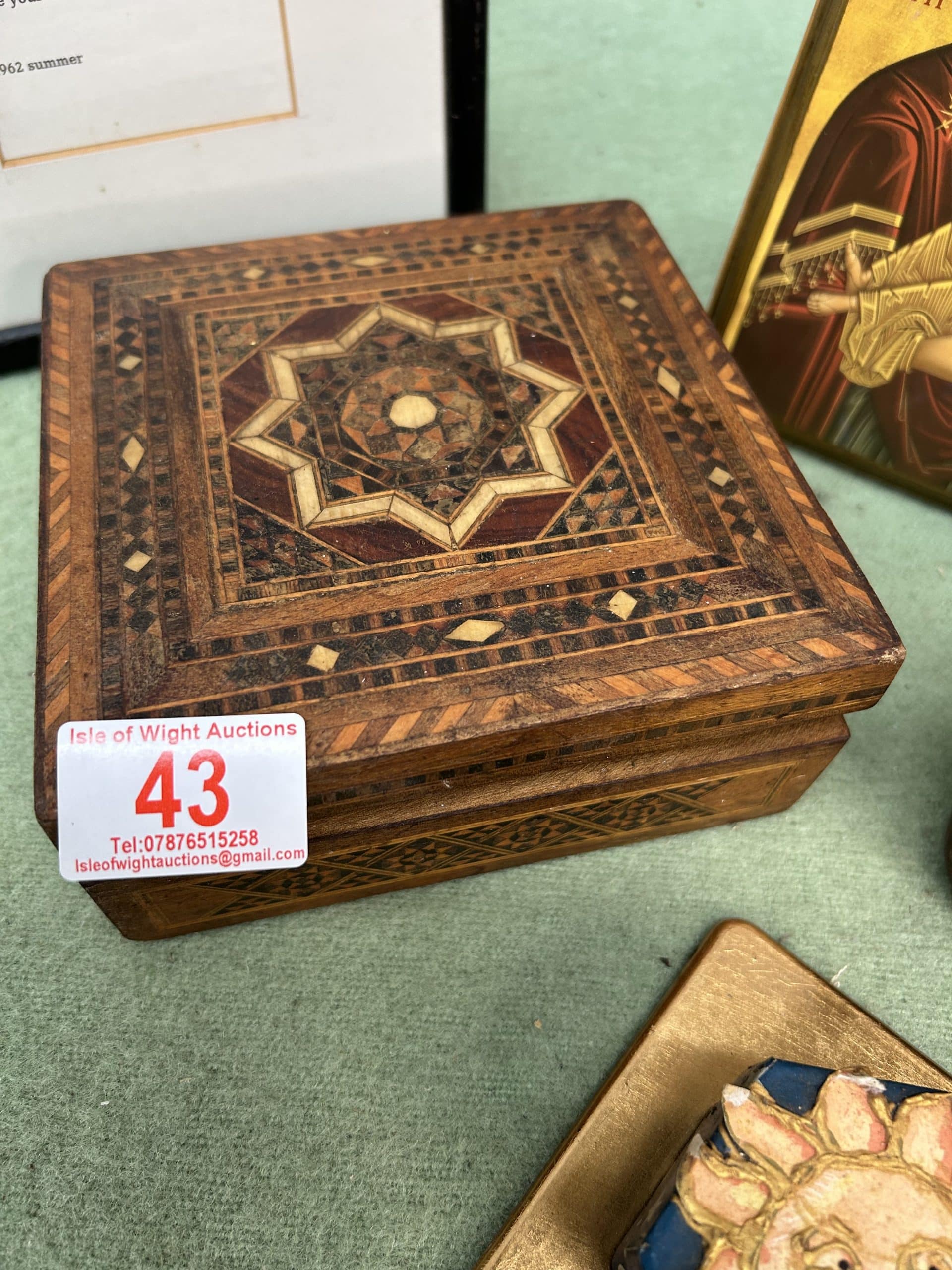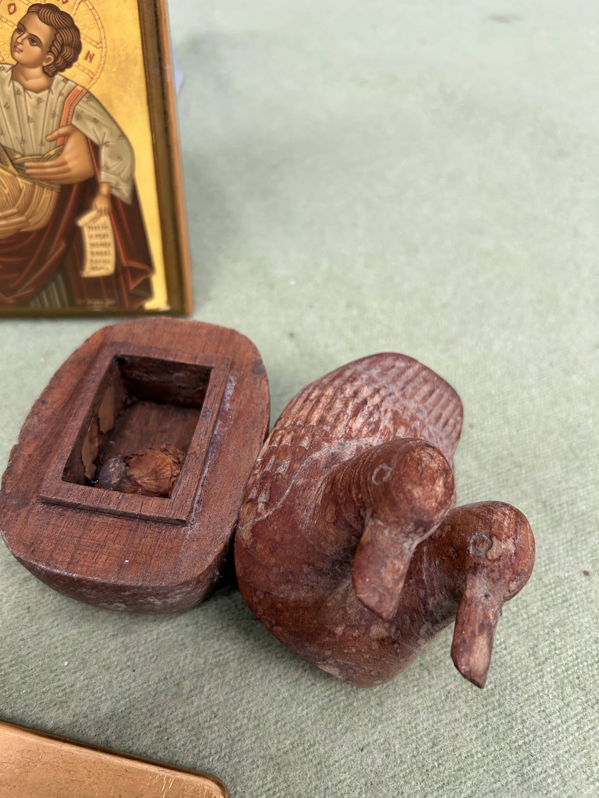 Tilly’s Auction (Part 2)| Item description: | Mixed Lot includes poem in frame, marquetry type box, mother and child photo in frame, carved wooden duck, gold tile and sun box |