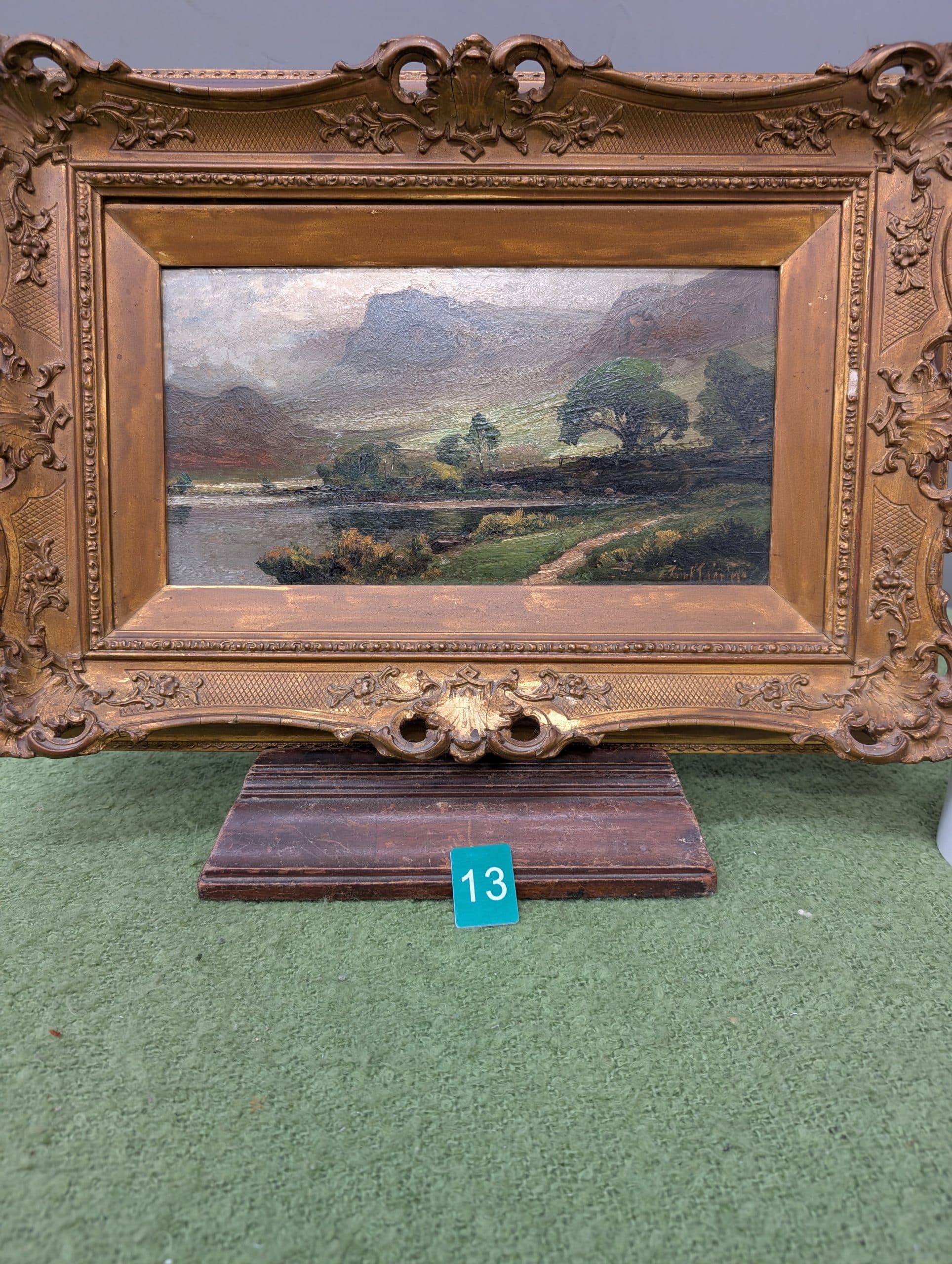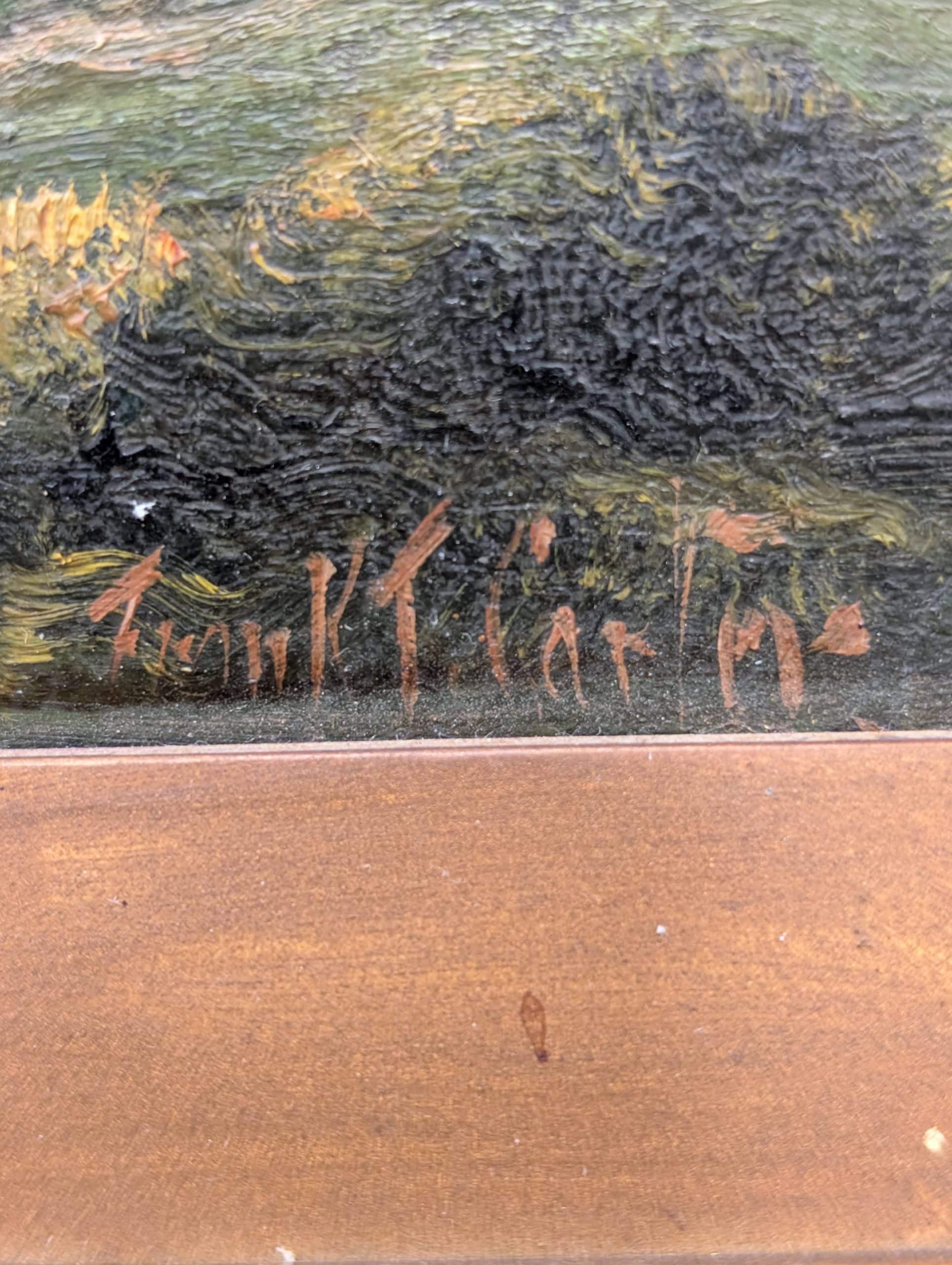 A framed, vintage, landscape painting, oil on board, 19" long x 13" wide.