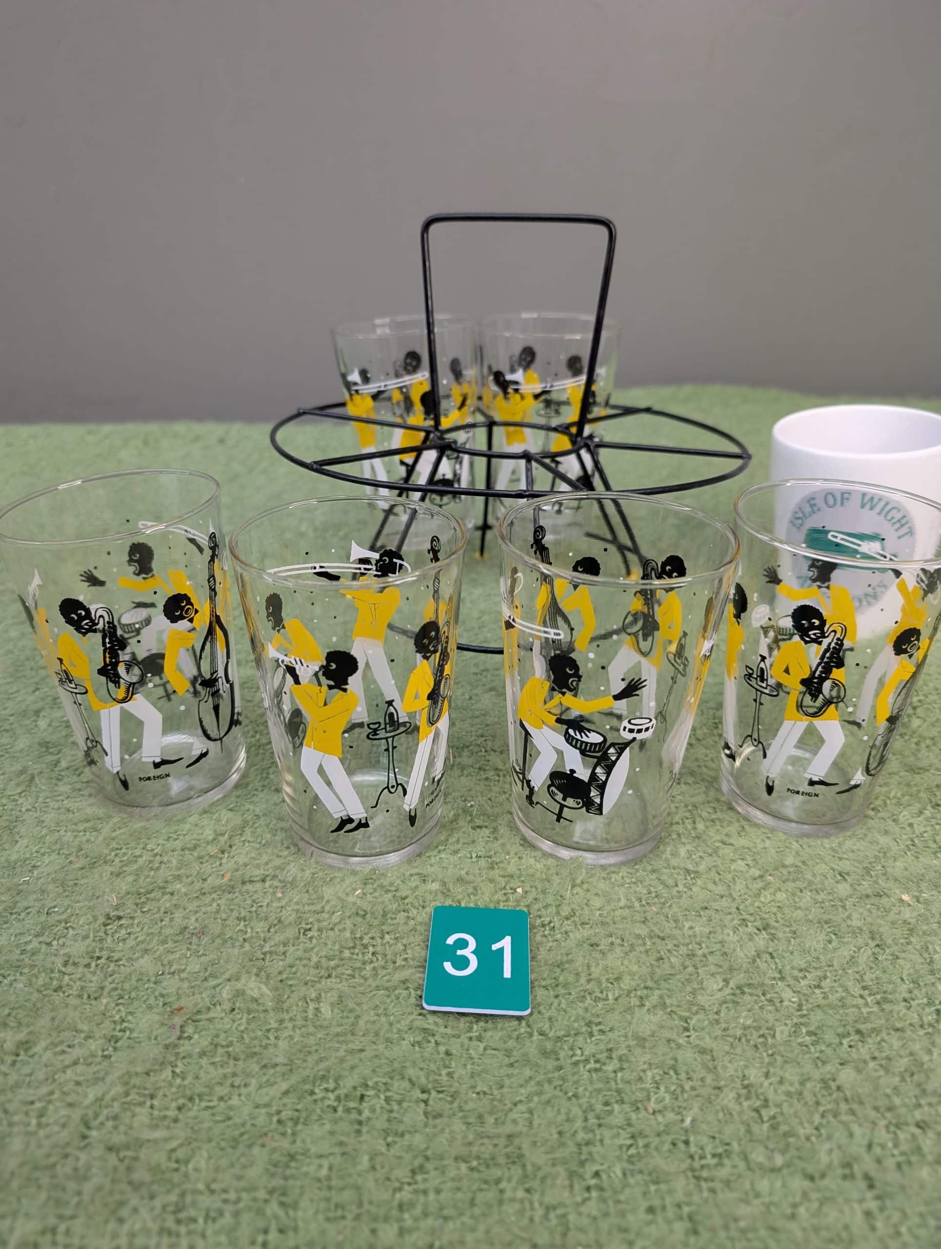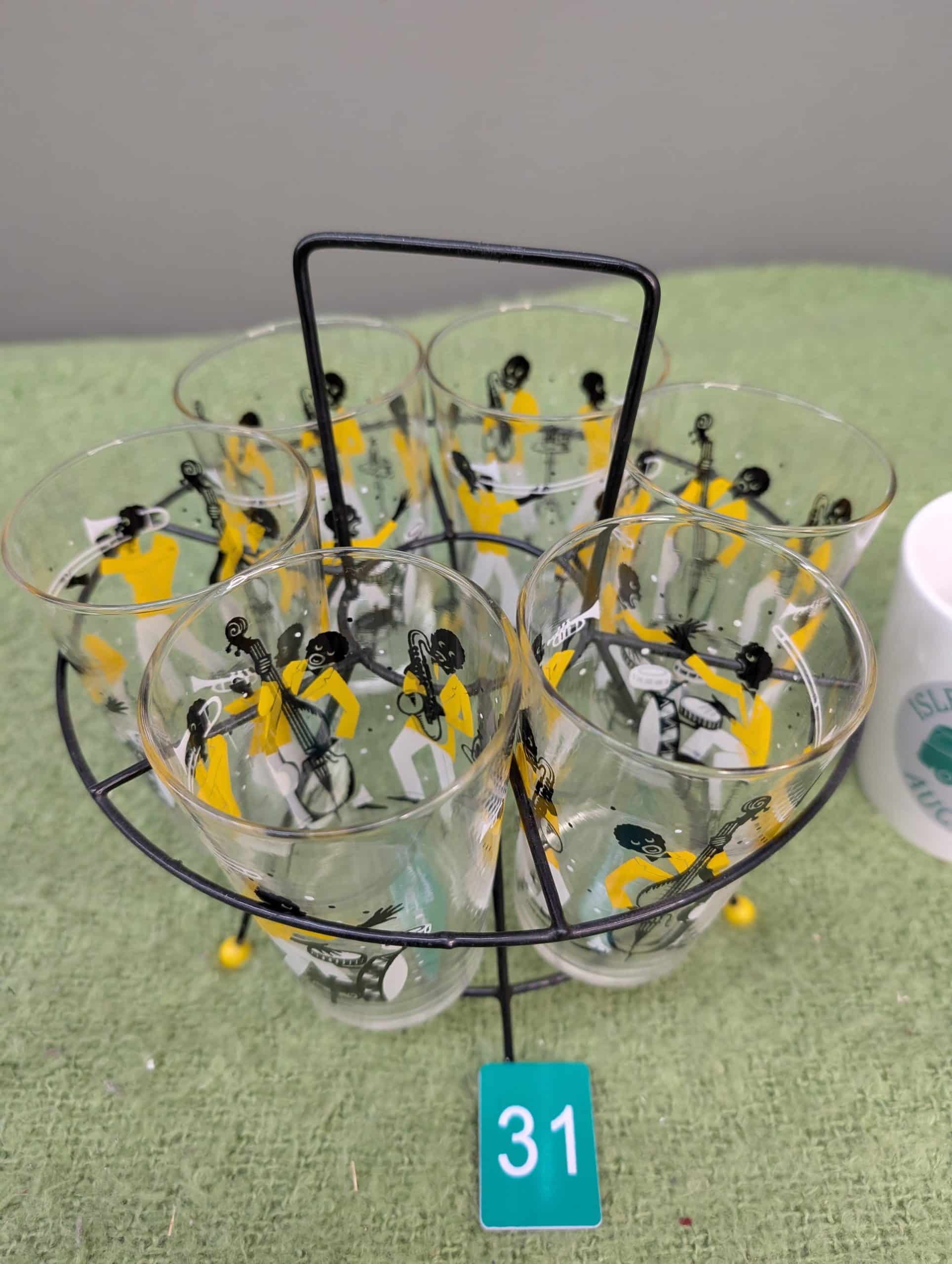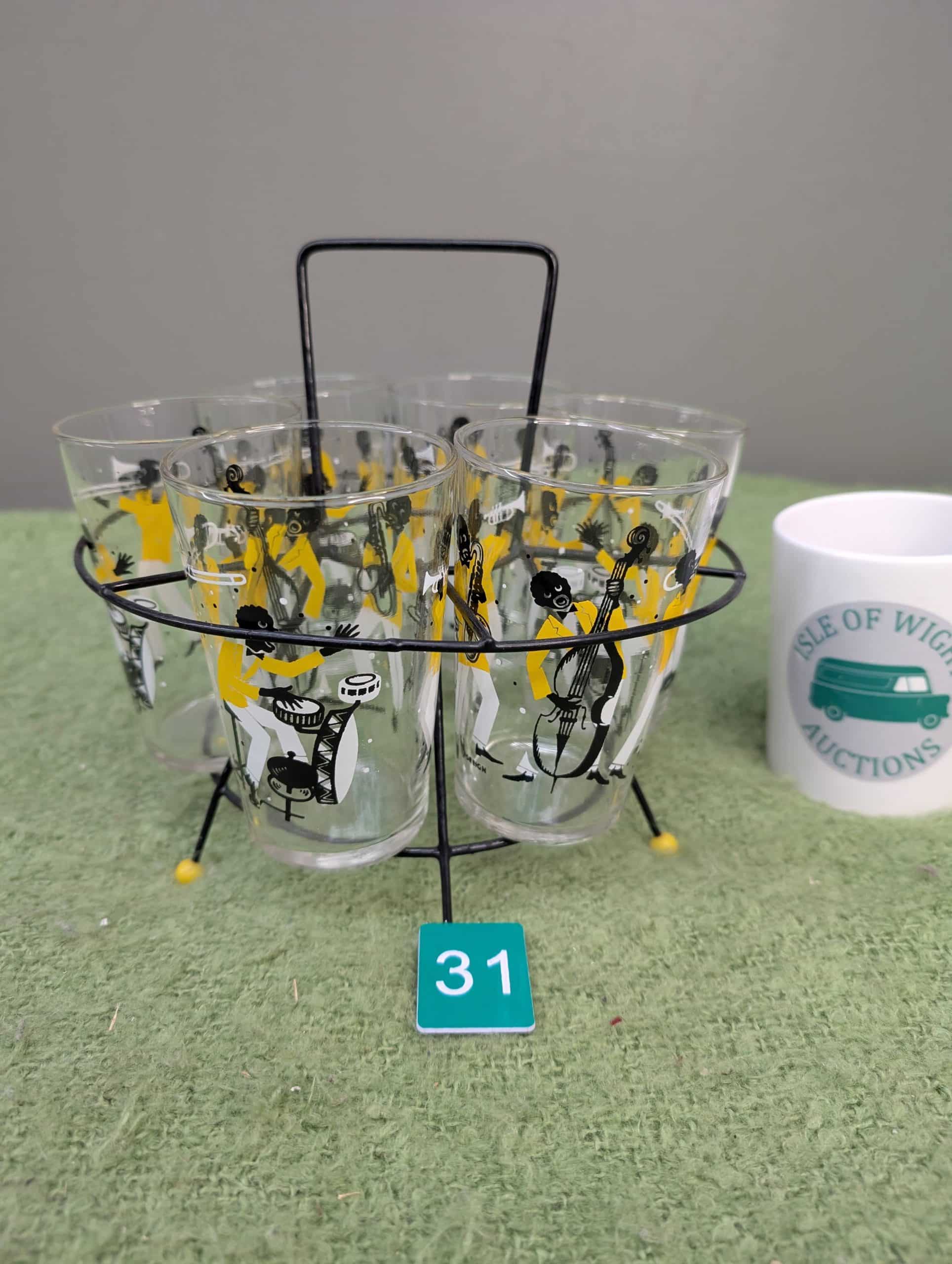 Mrs Bakers Auction| Item description: | Six, 1970's glasses in a rack. |