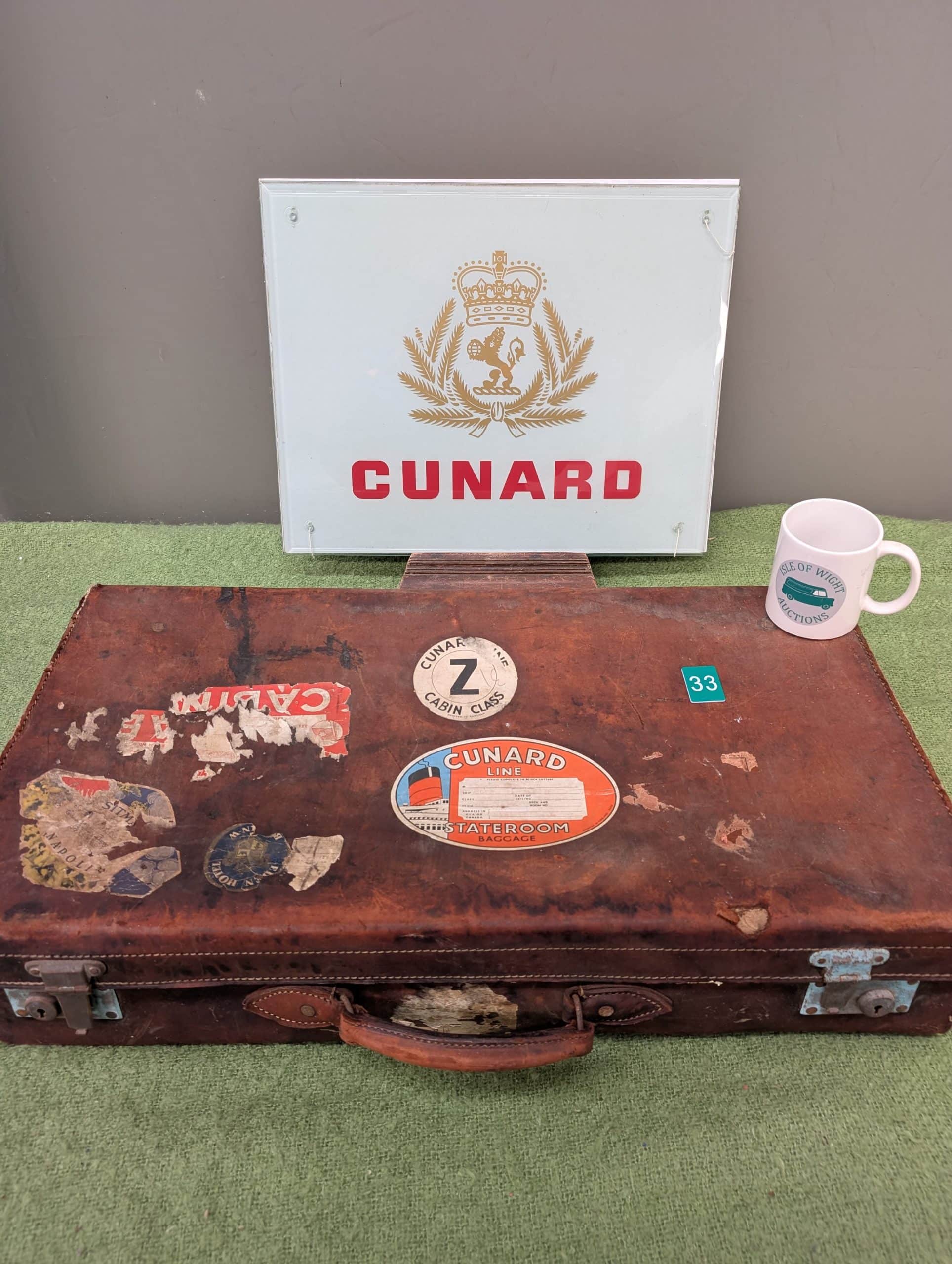 The Last Auction of 2025| Item description: | A vintage suitcase with Cunard stickers and a Cunard glass sign. |