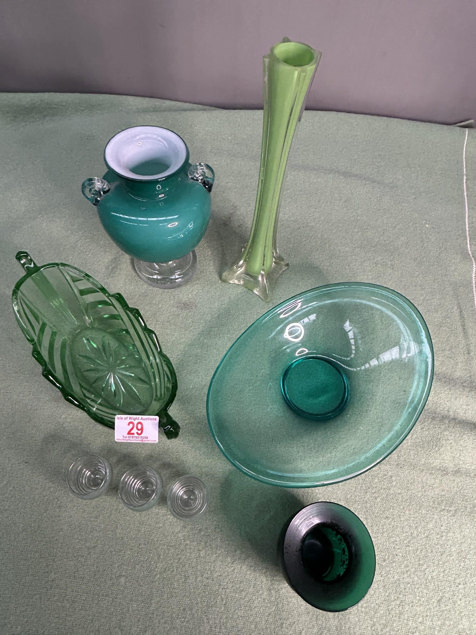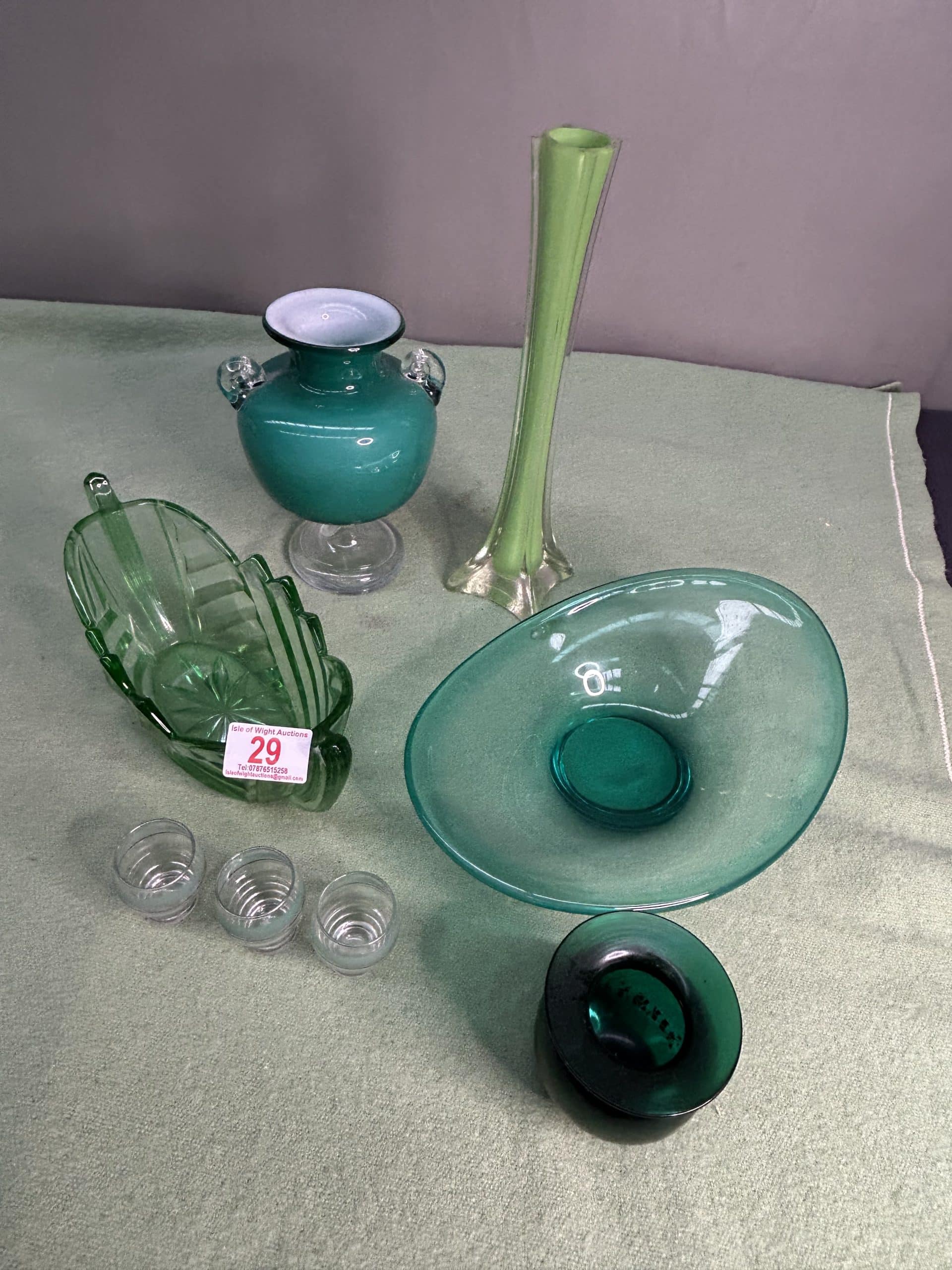 Downsizing Auction| Item description: | Collection of various mid century shades of green glass pieces all in good order, eight pieces |
