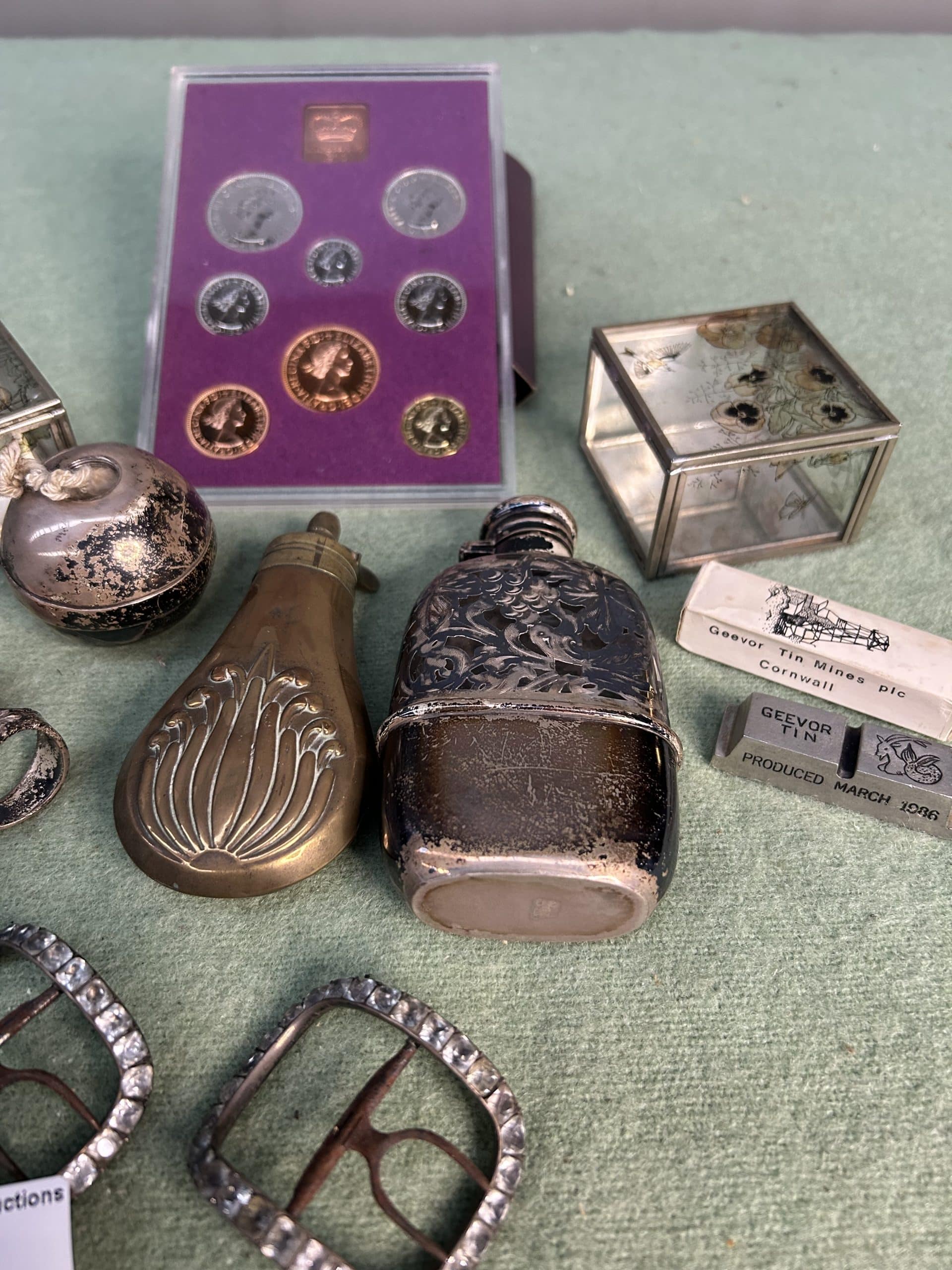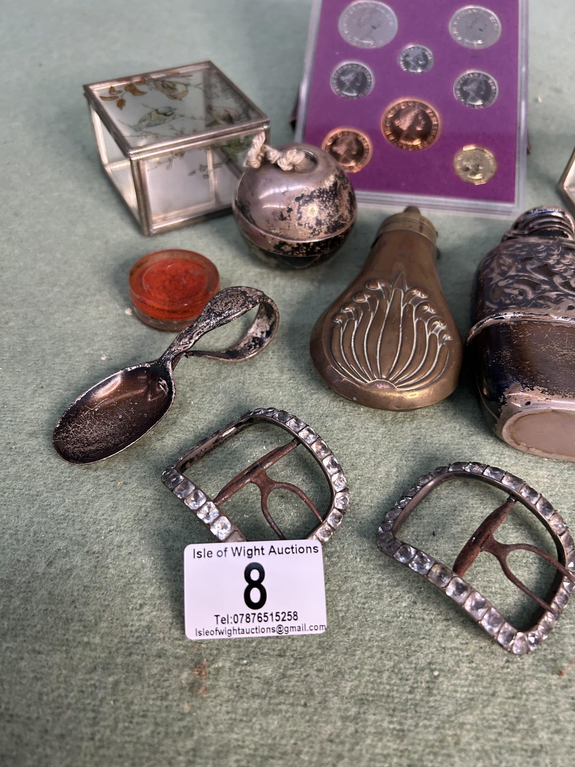 Mixed lot including Georgian era shoe buckles, glass trinket boxes, various metalware