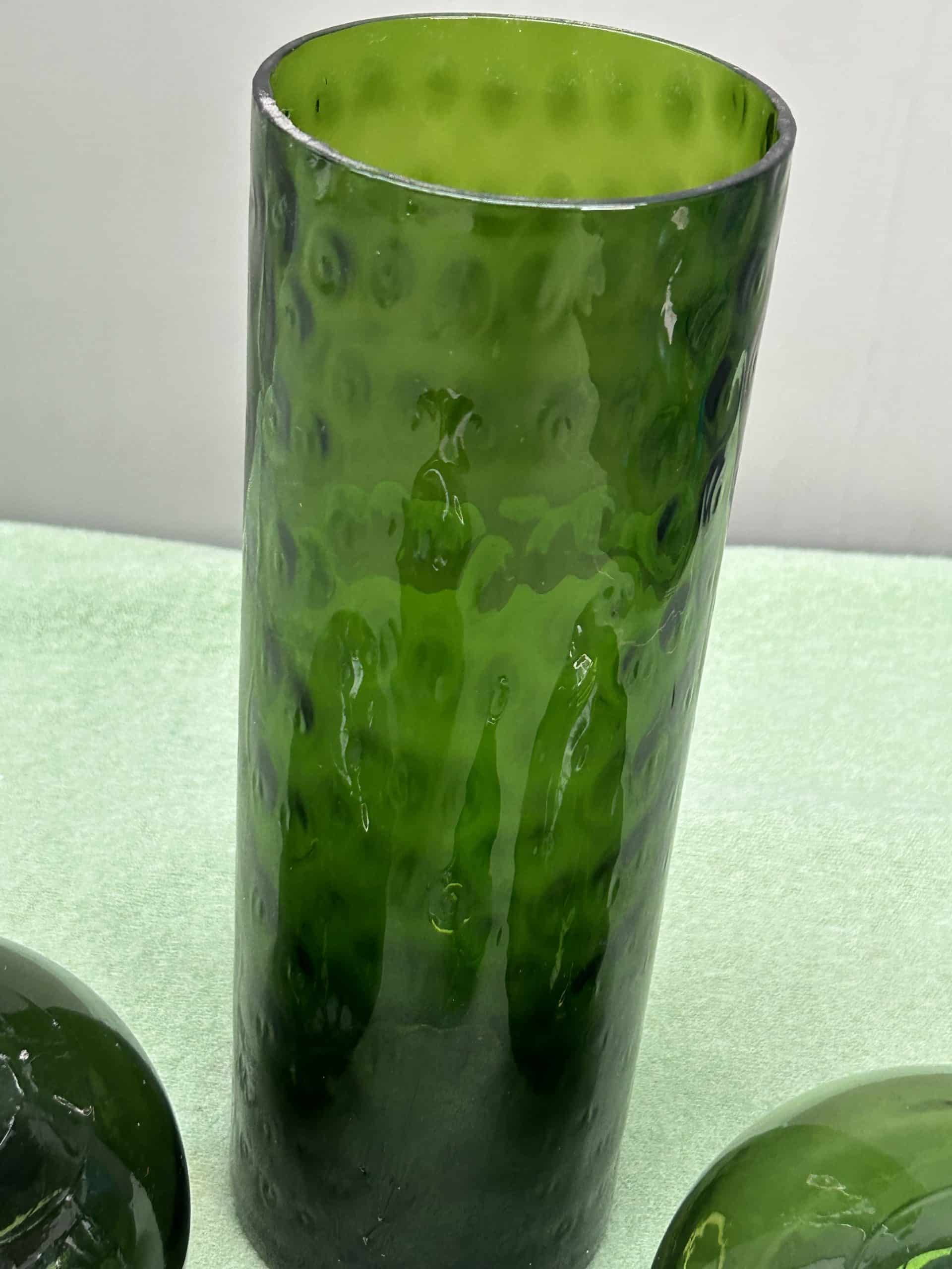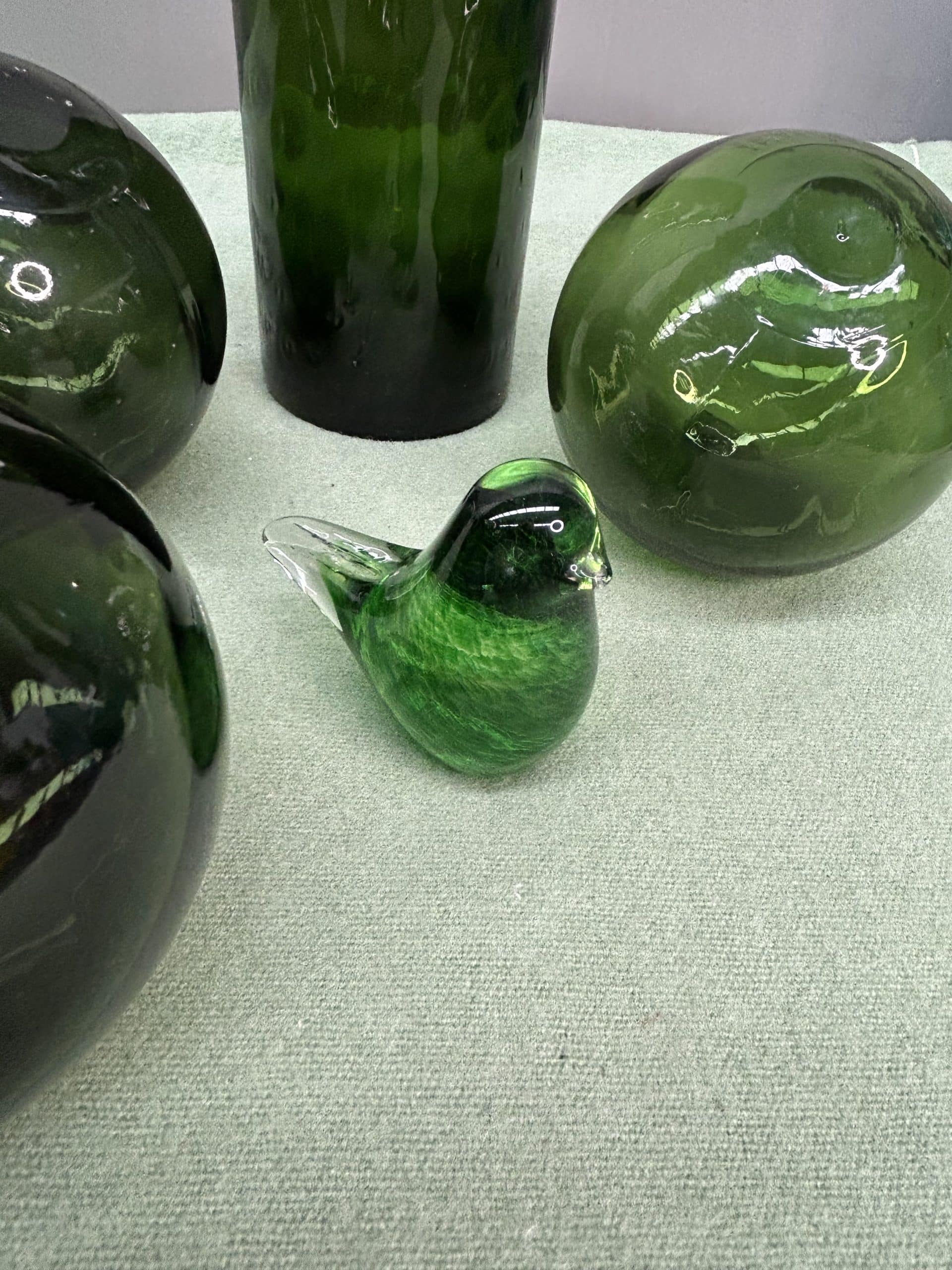 Downsizing Auction| Item description: | Vintage Green glassware, includes cylindrical vase, three decorative spheres and a glass bird figure |