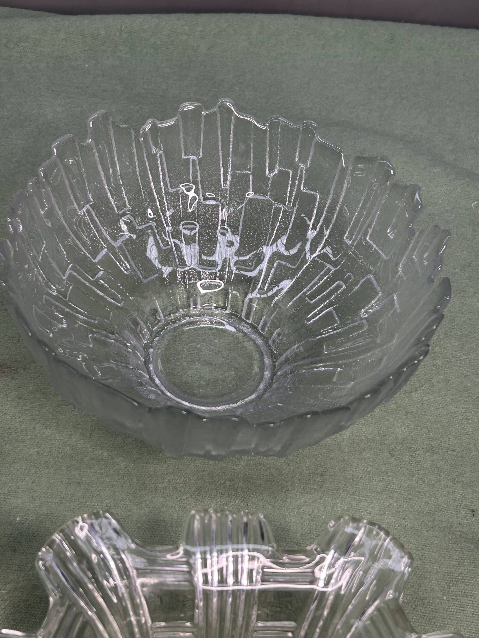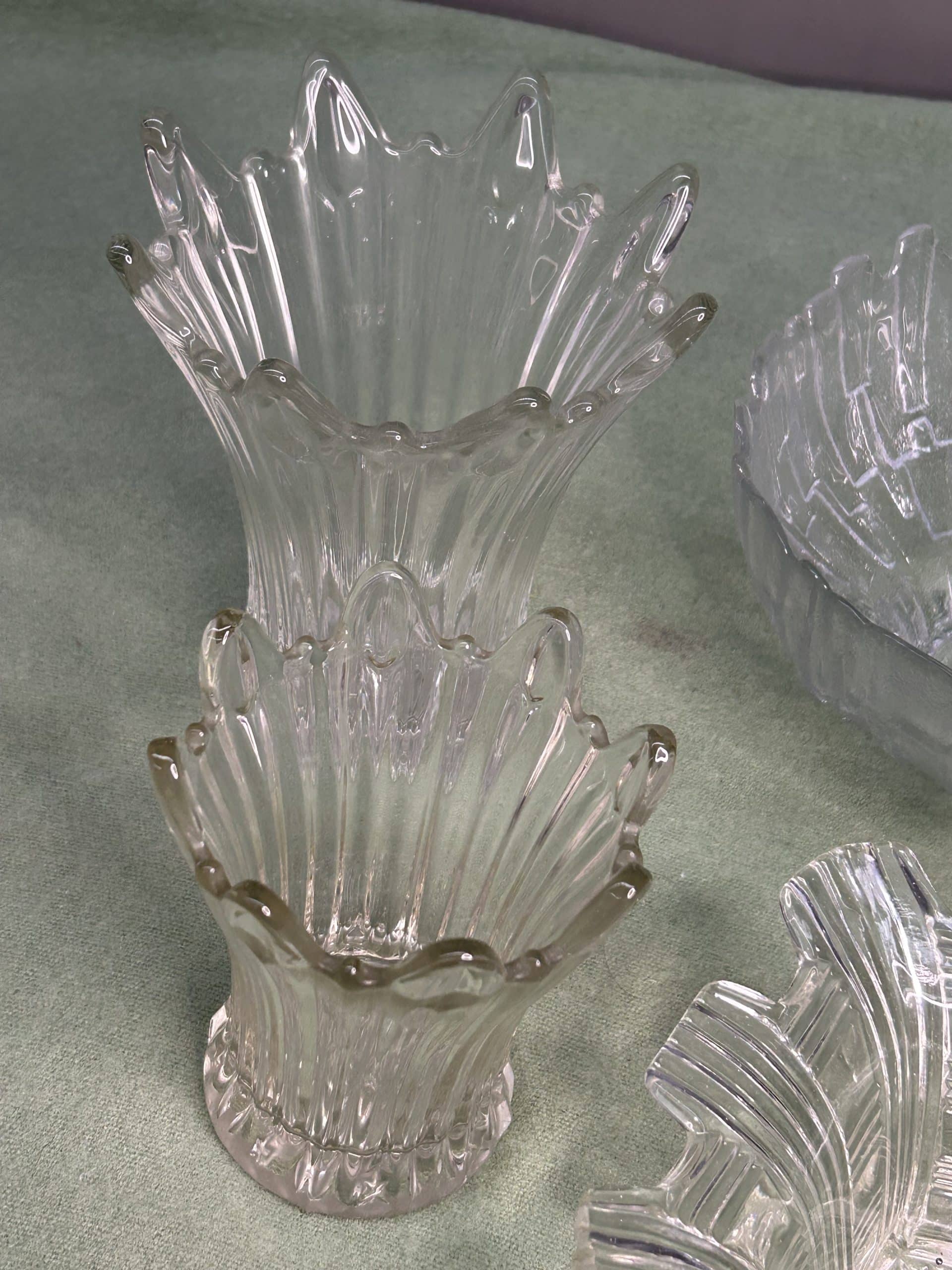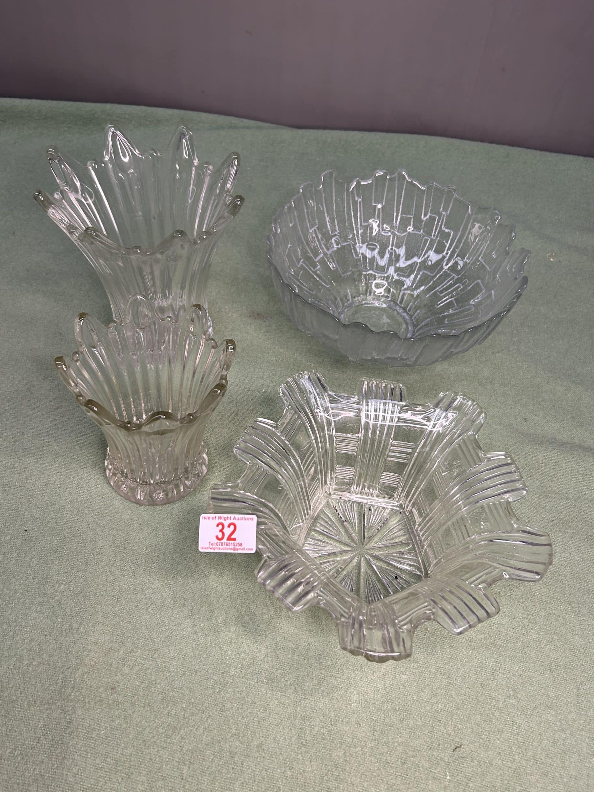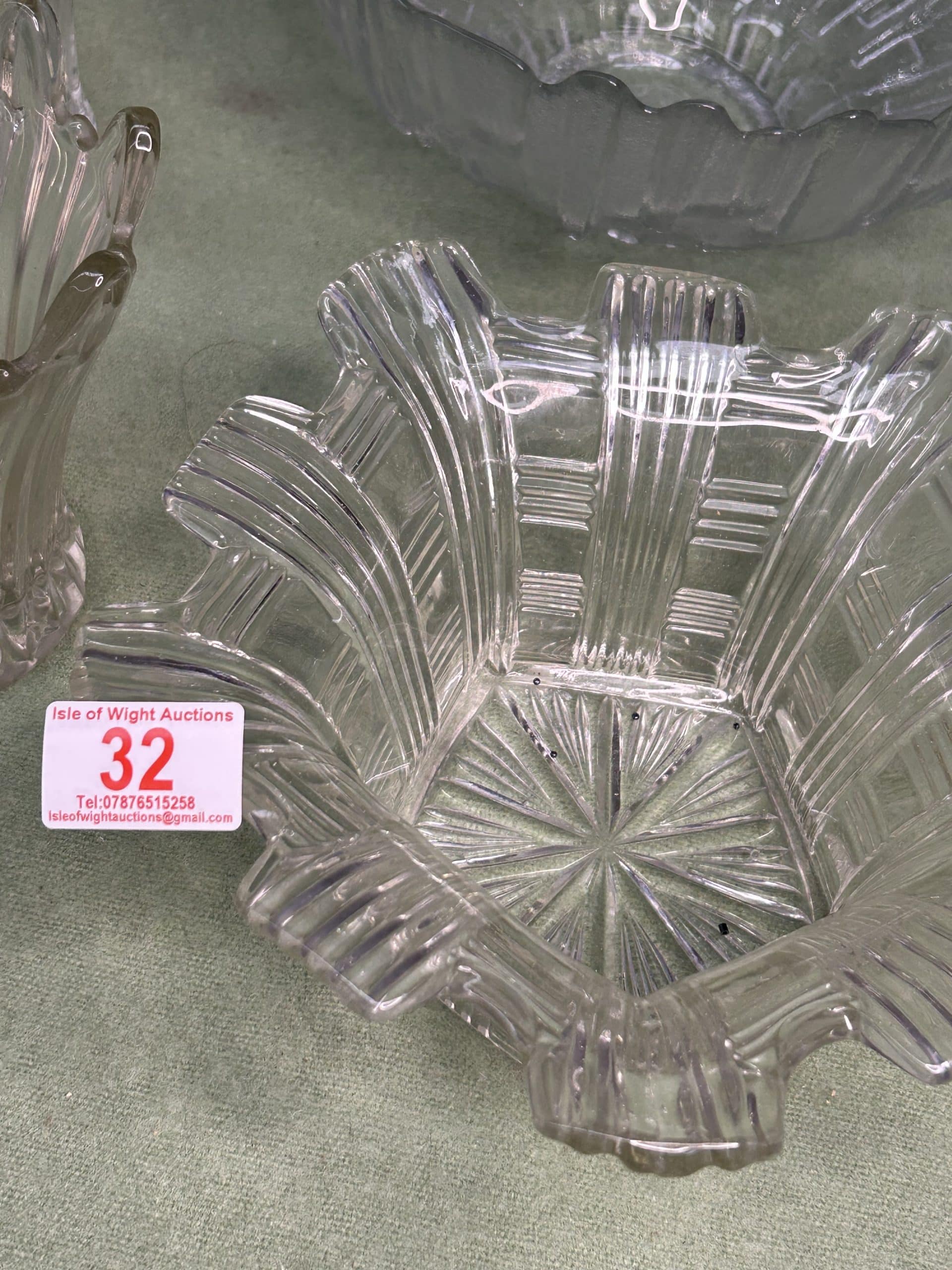 Downsizing Auction| Item description: | Collection of vintage glass items including art deco hexagonal bowl, 5 sided bowl and two fluted art deco pieces with flared body and scalloped rims |