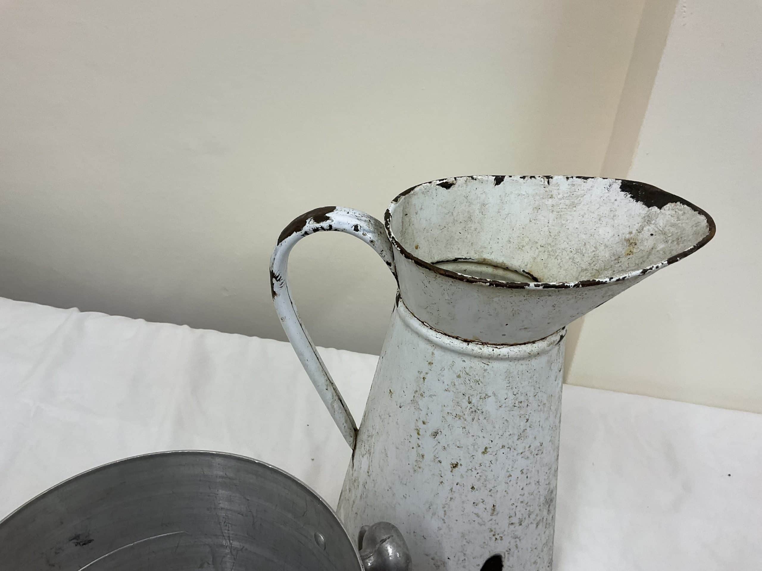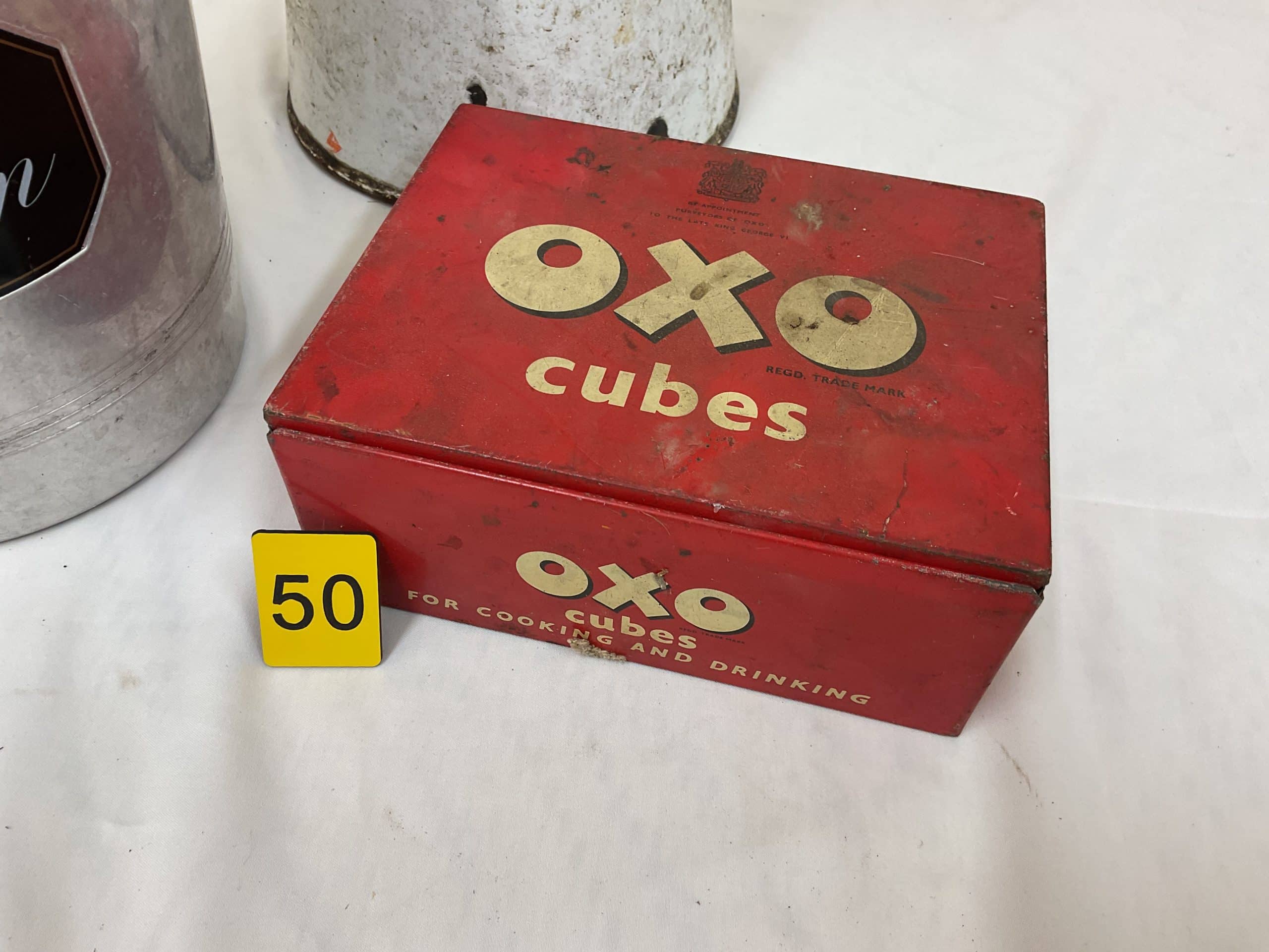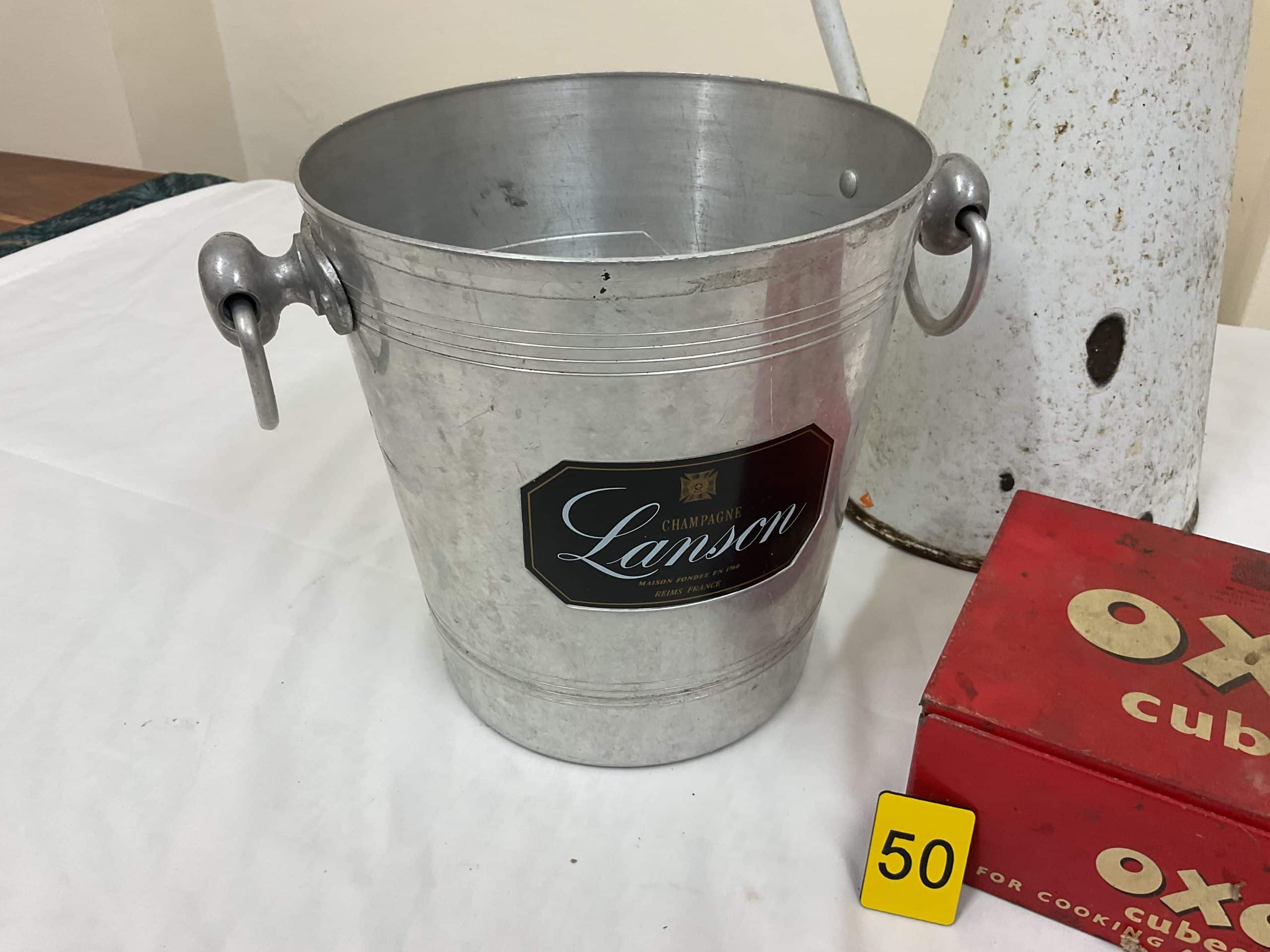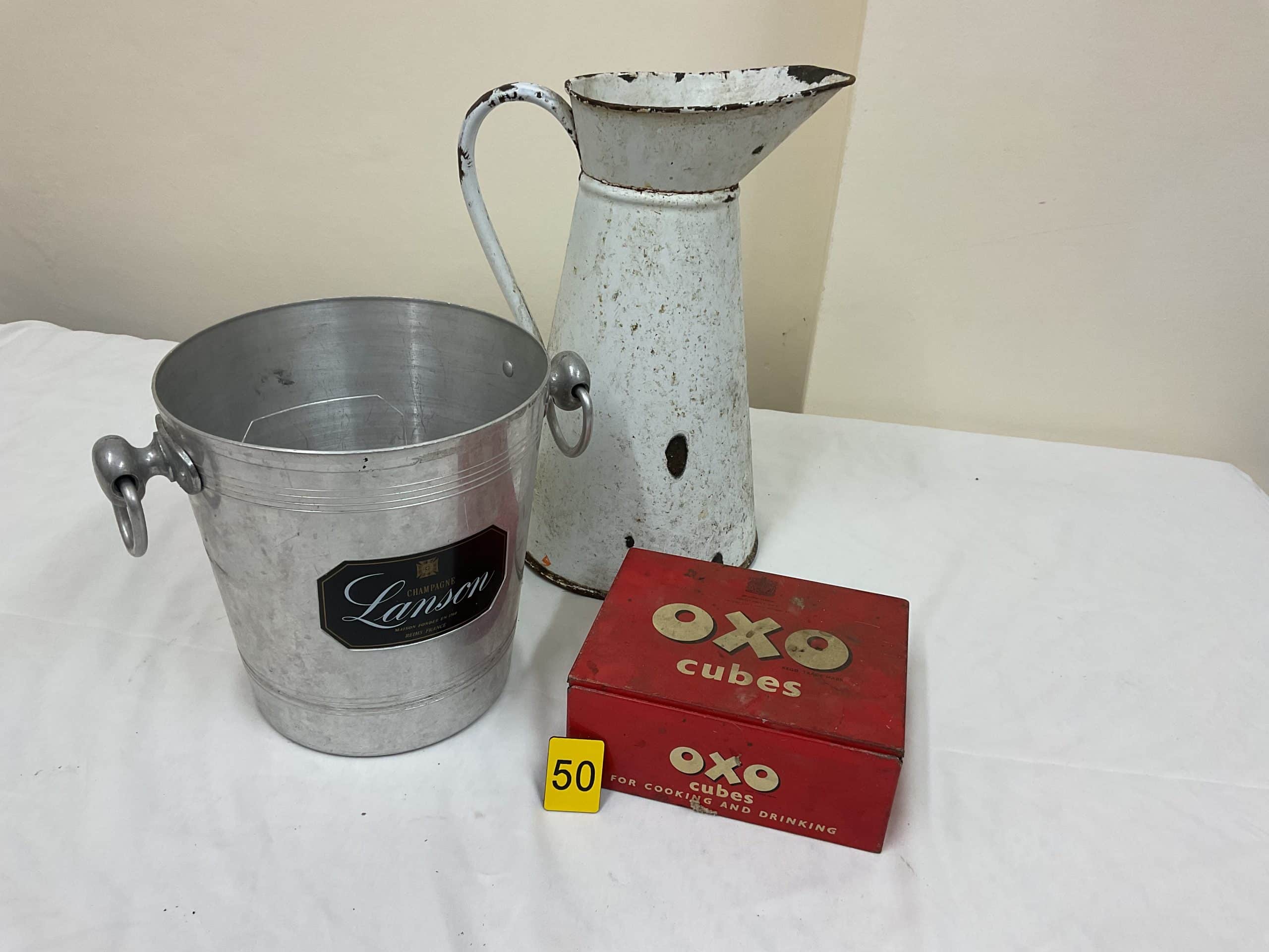 Mixed lot of retro items champagne ice bucket, tall white enamel jug and vintage OXO tin