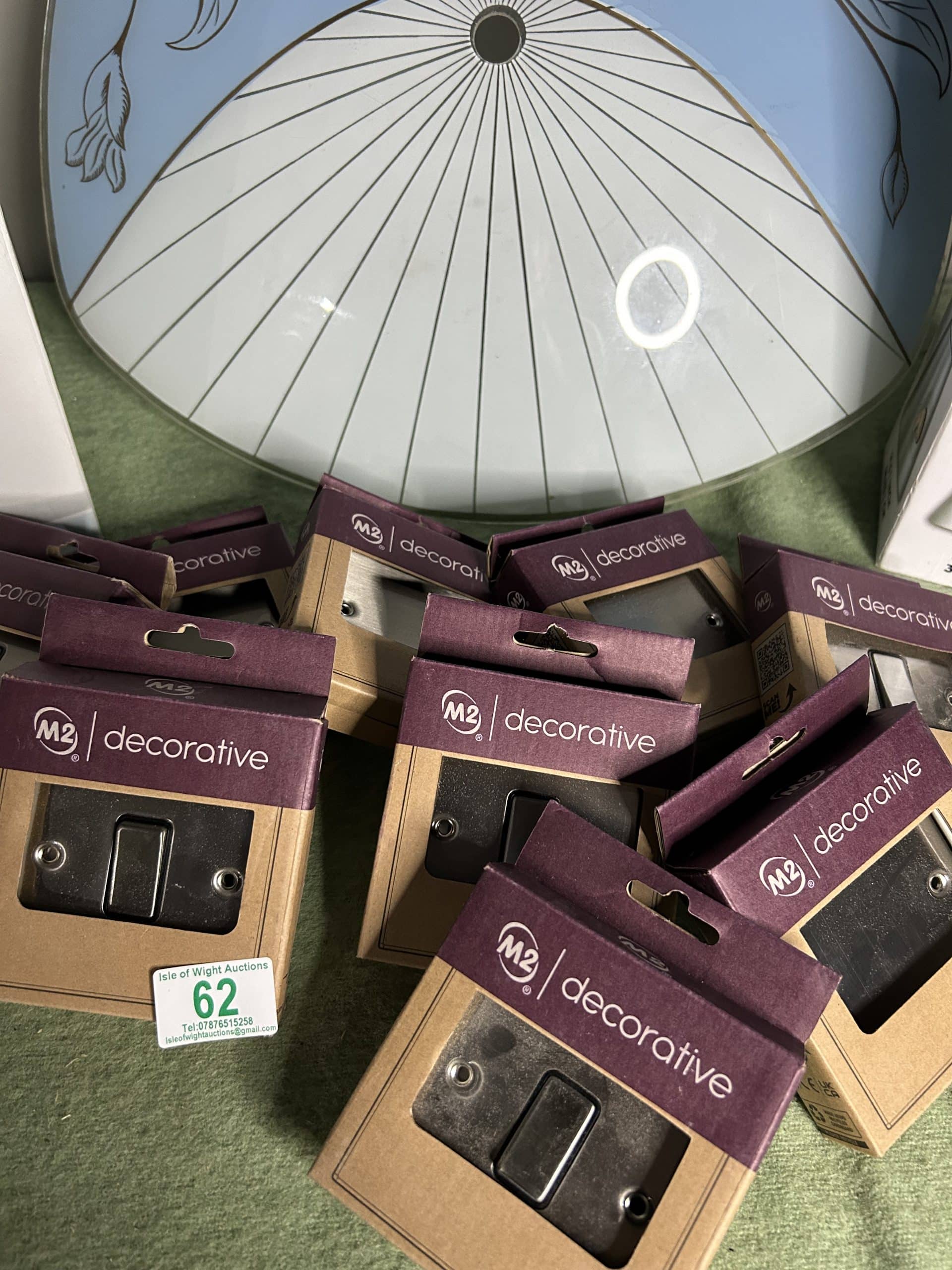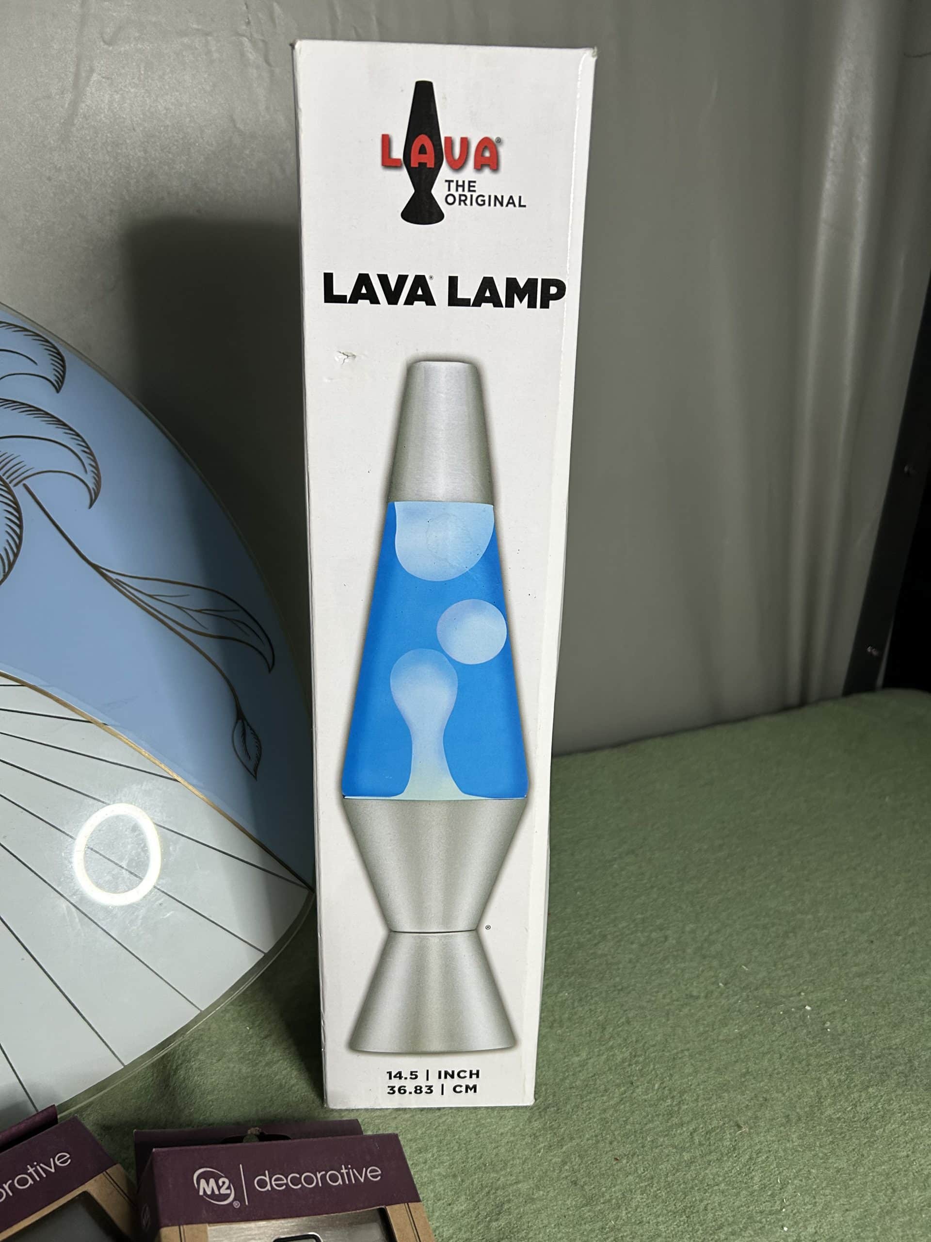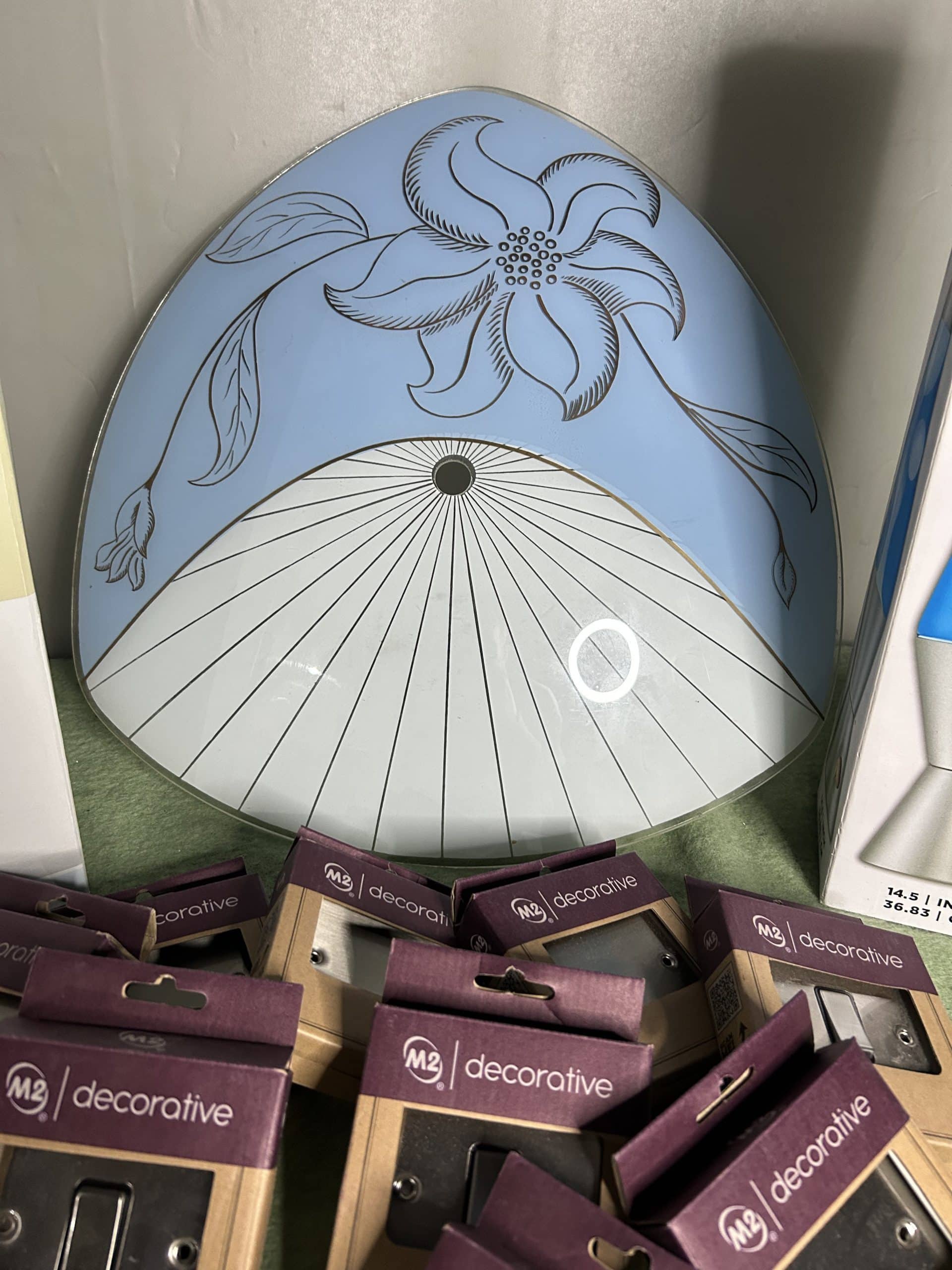Clear Out| Item description: | Lamps & Switches including lava lamp, ceiling pendant new in box, retro glass shade, switches and blanking plates new in box |