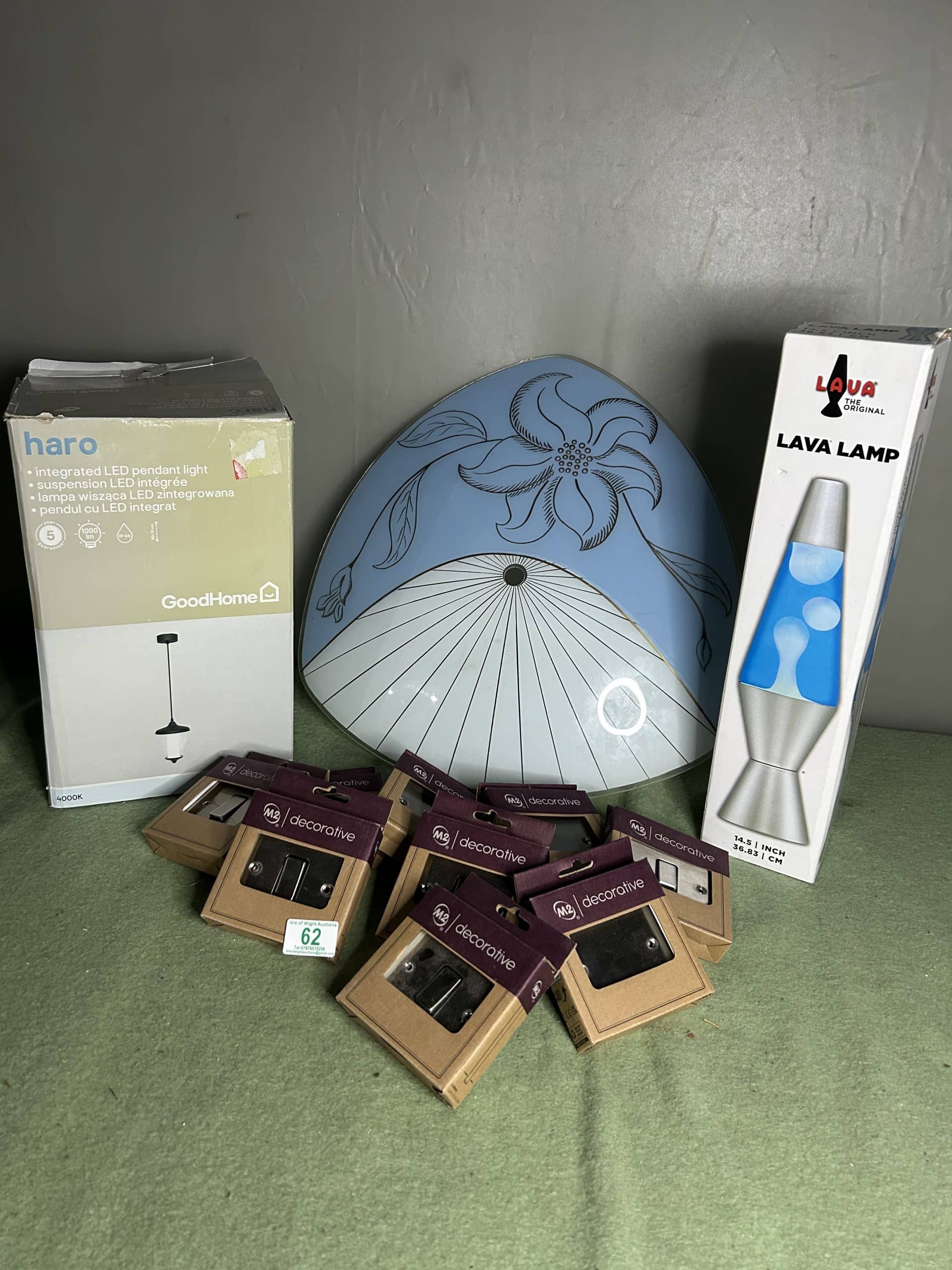 Clear Out| Item description: | Lamps & Switches including lava lamp, ceiling pendant new in box, retro glass shade, switches and blanking plates new in box |