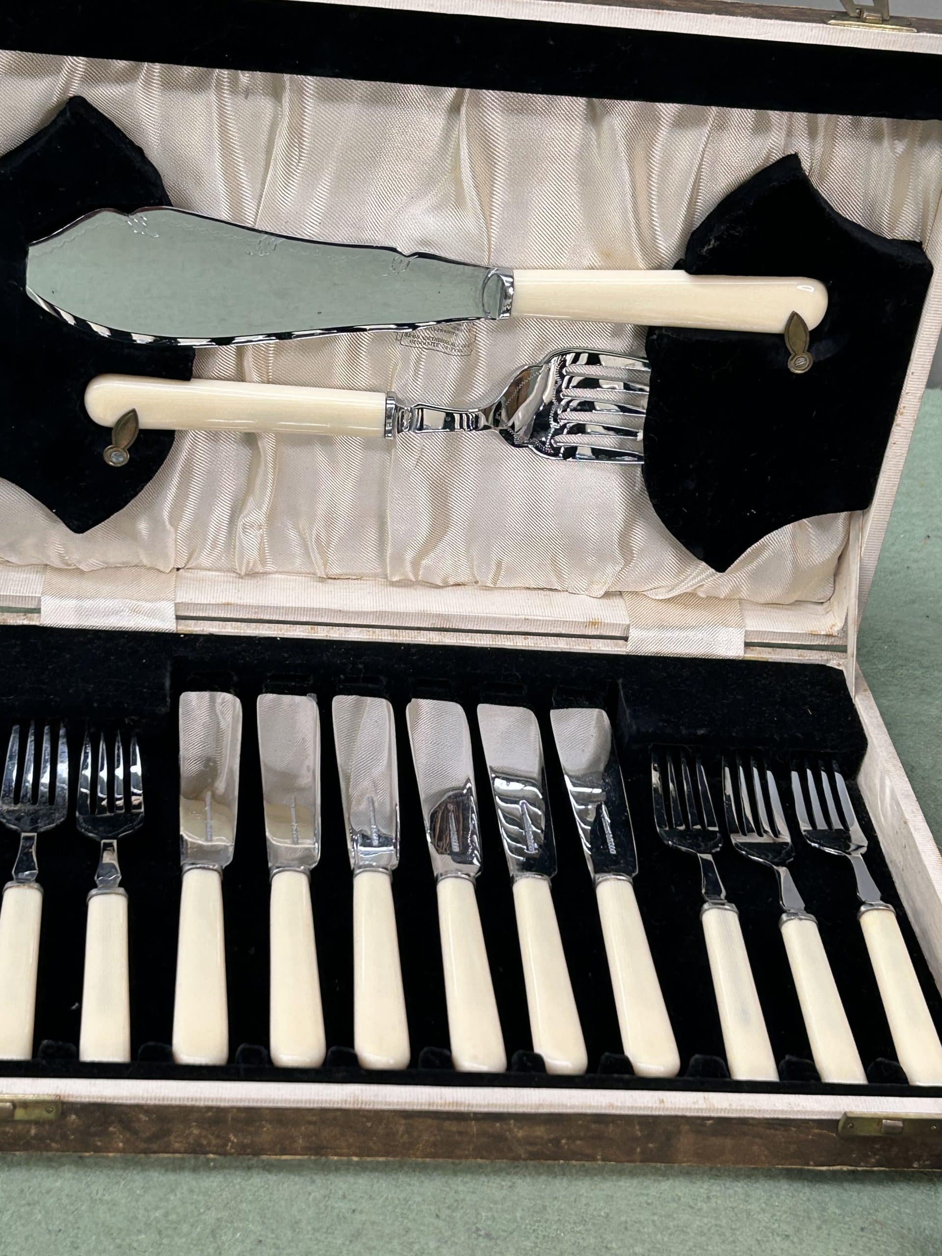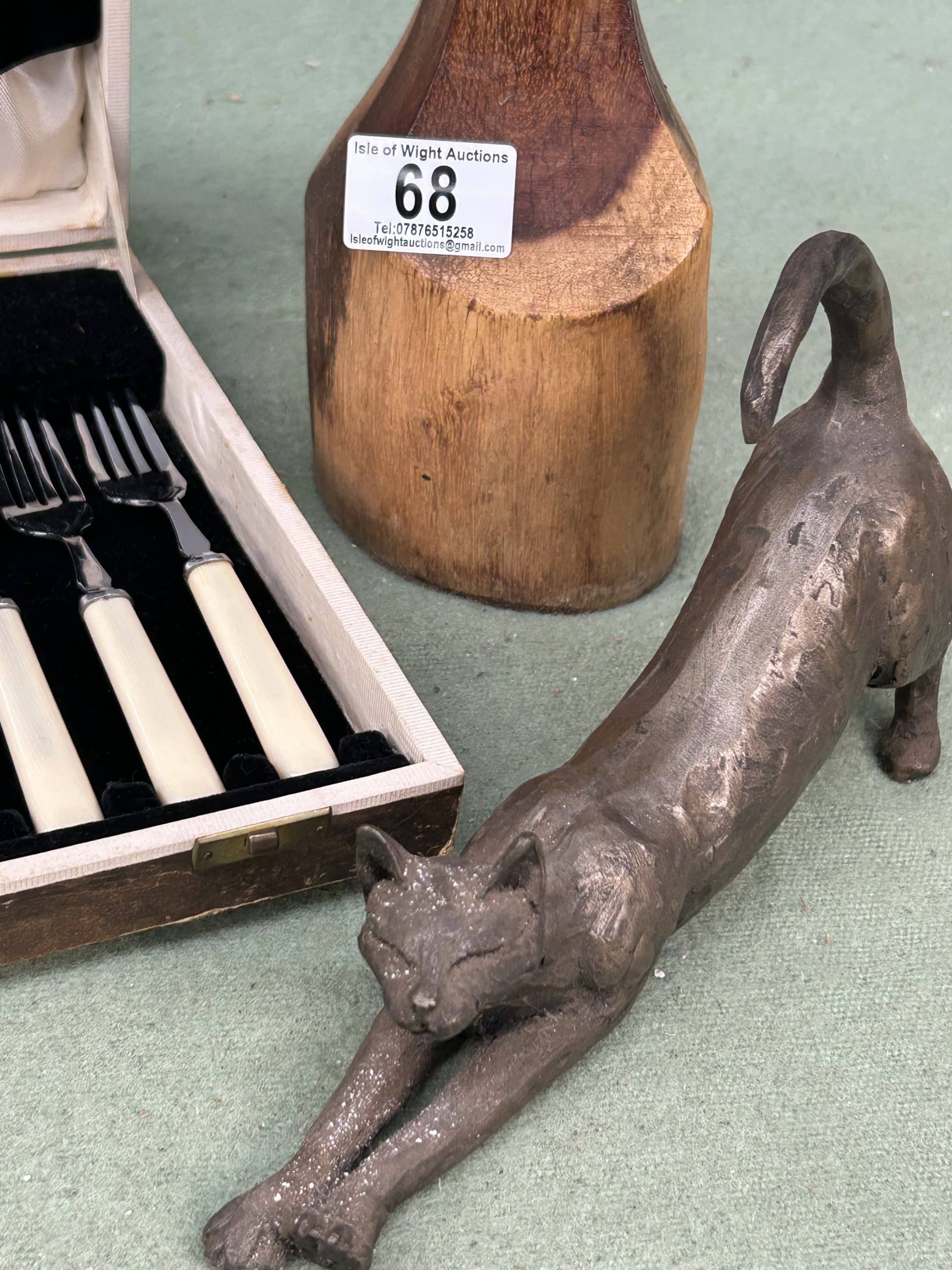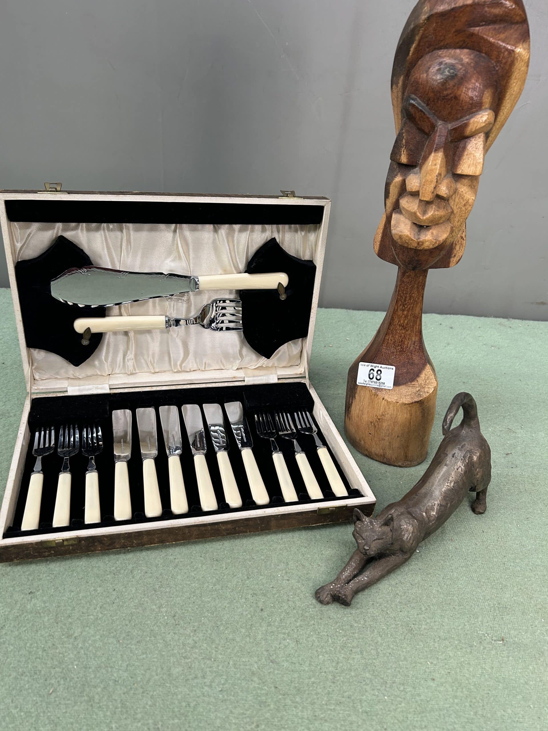 Mixed Lot includes canteen of cutlery fish knives & forks and servicing knife & fork, wooden tribal sculpture and metal cat