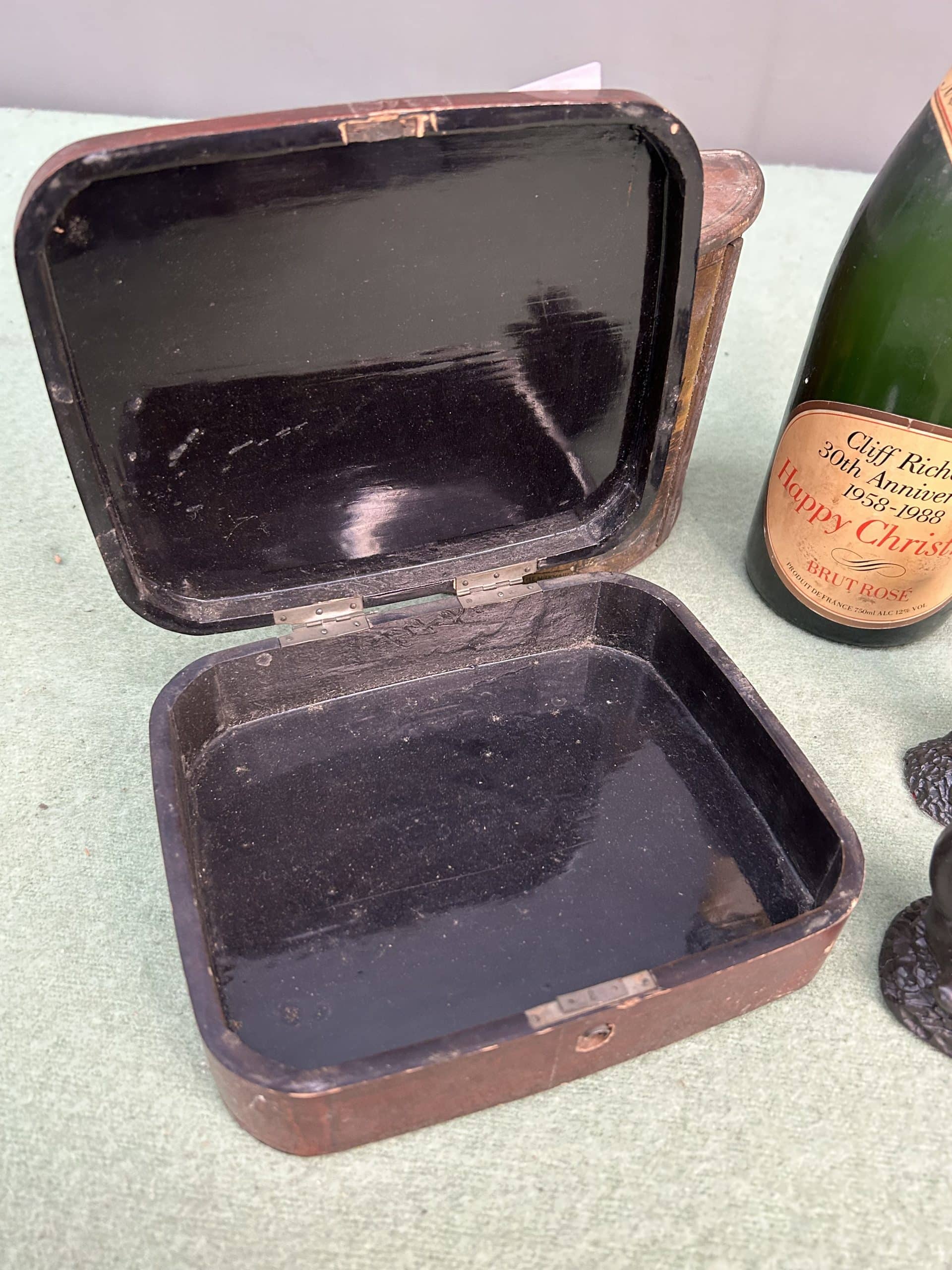 JTA Auction| Item description: | Mixed Lot includes two boxes, Cliff Richard 30 Anniversary Christmas empty champagne bottle plus two metal horse figures |