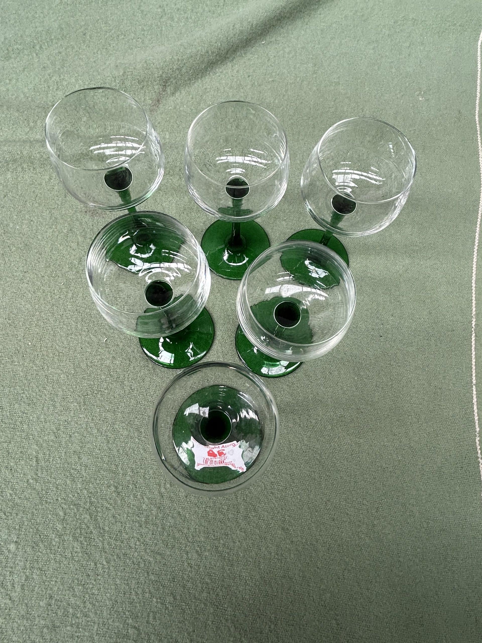 6 Vintage Luminarc Alsace Rhin wine glasses with green stems c1970’s manufactured in France