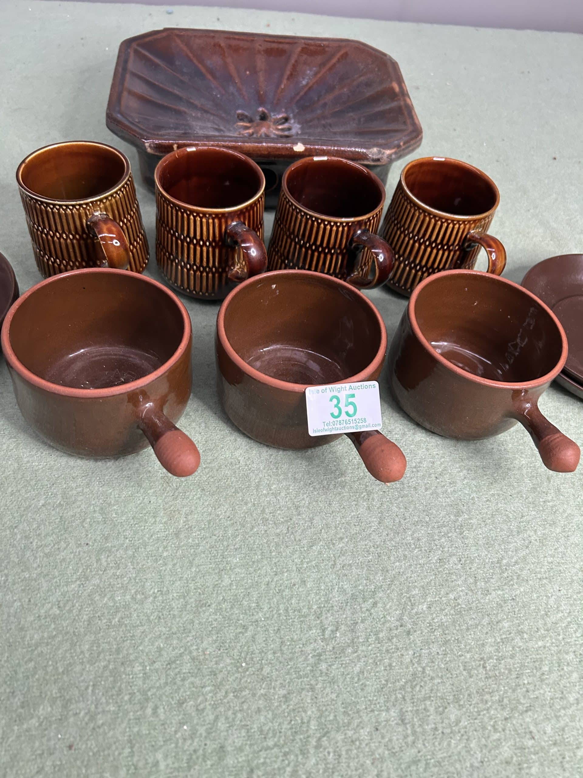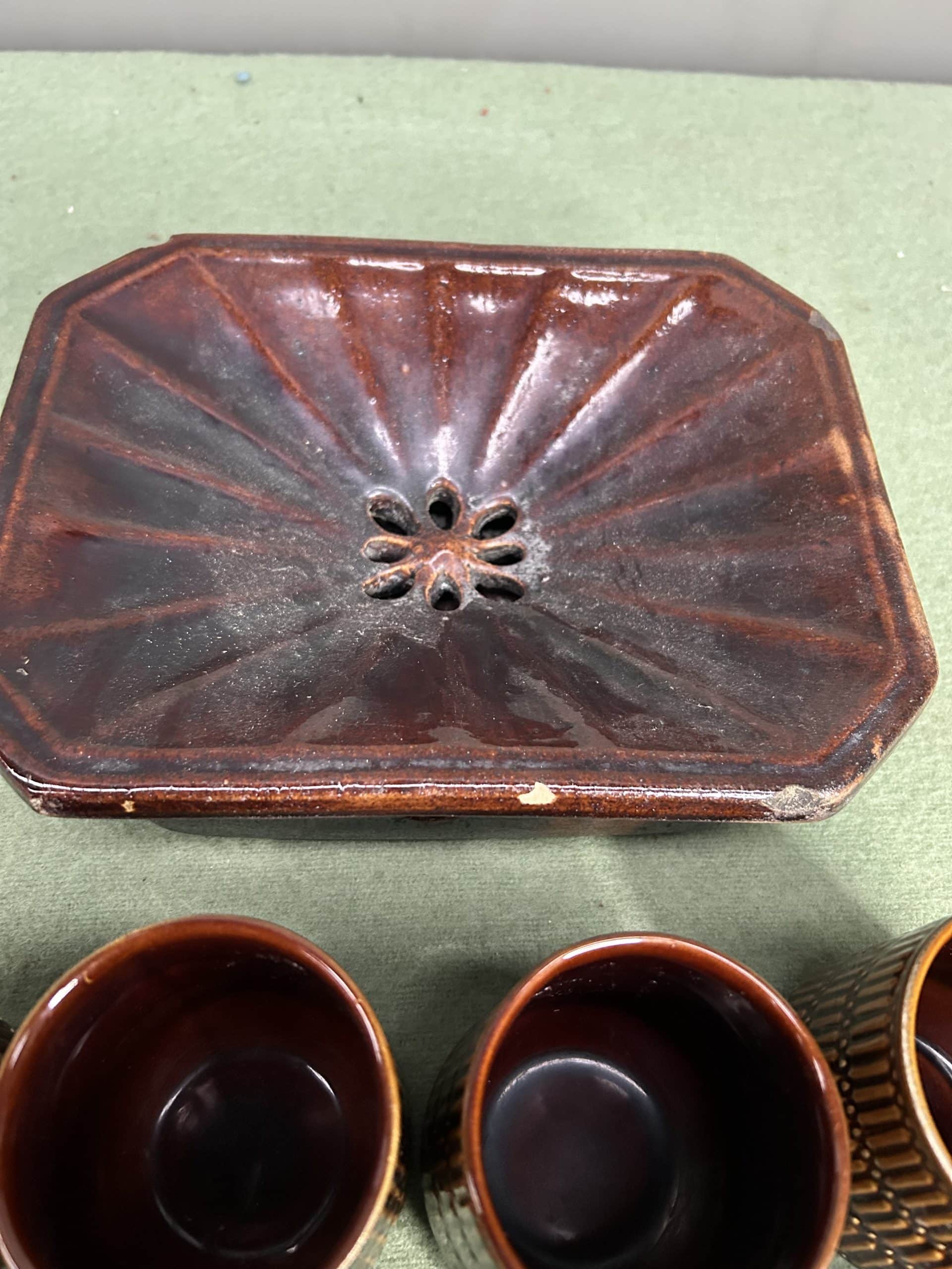 Clear Out| Item description: | Collection of brown glazed bean pots, mugs and vintage brown glaze spittoon |