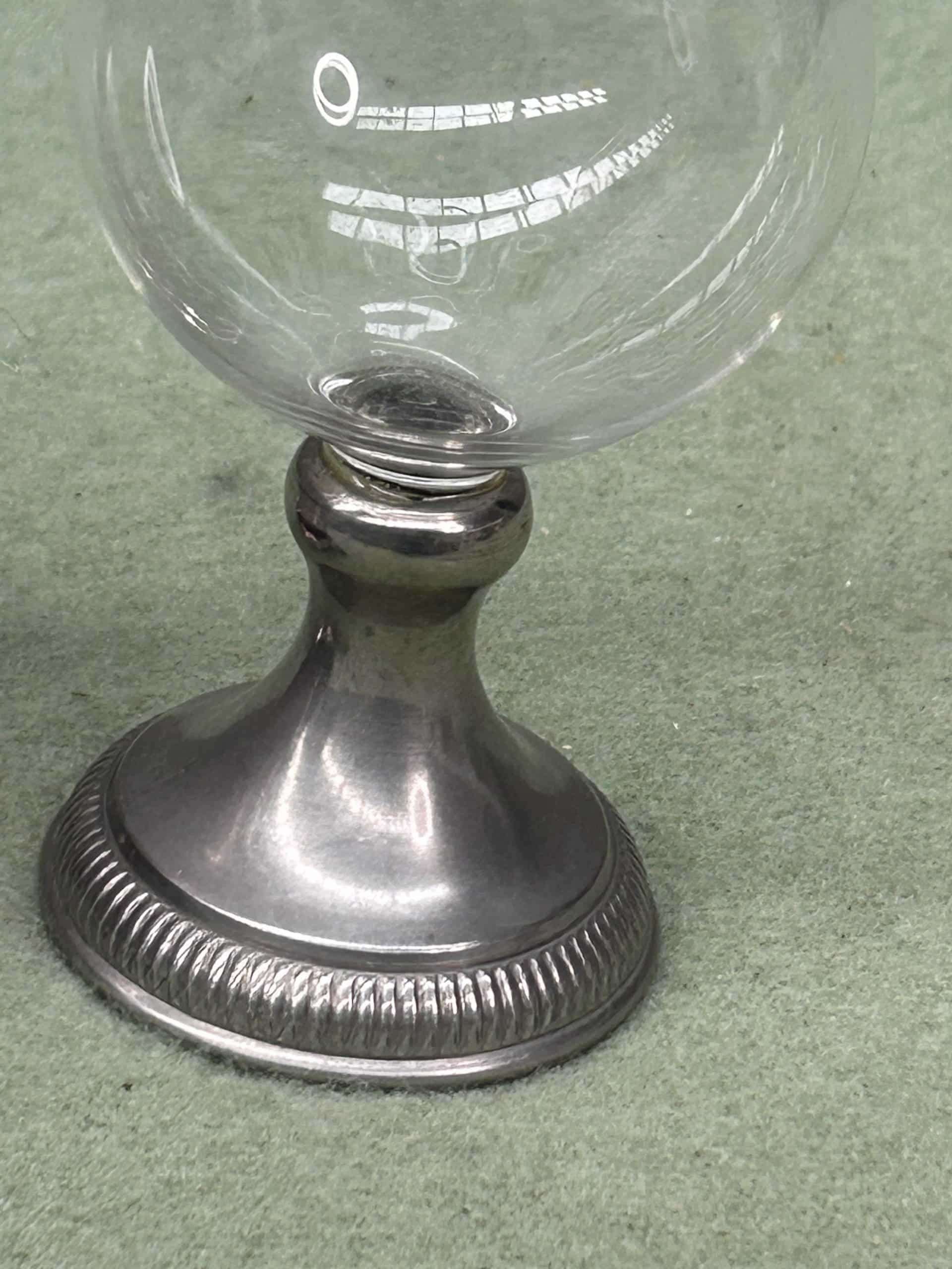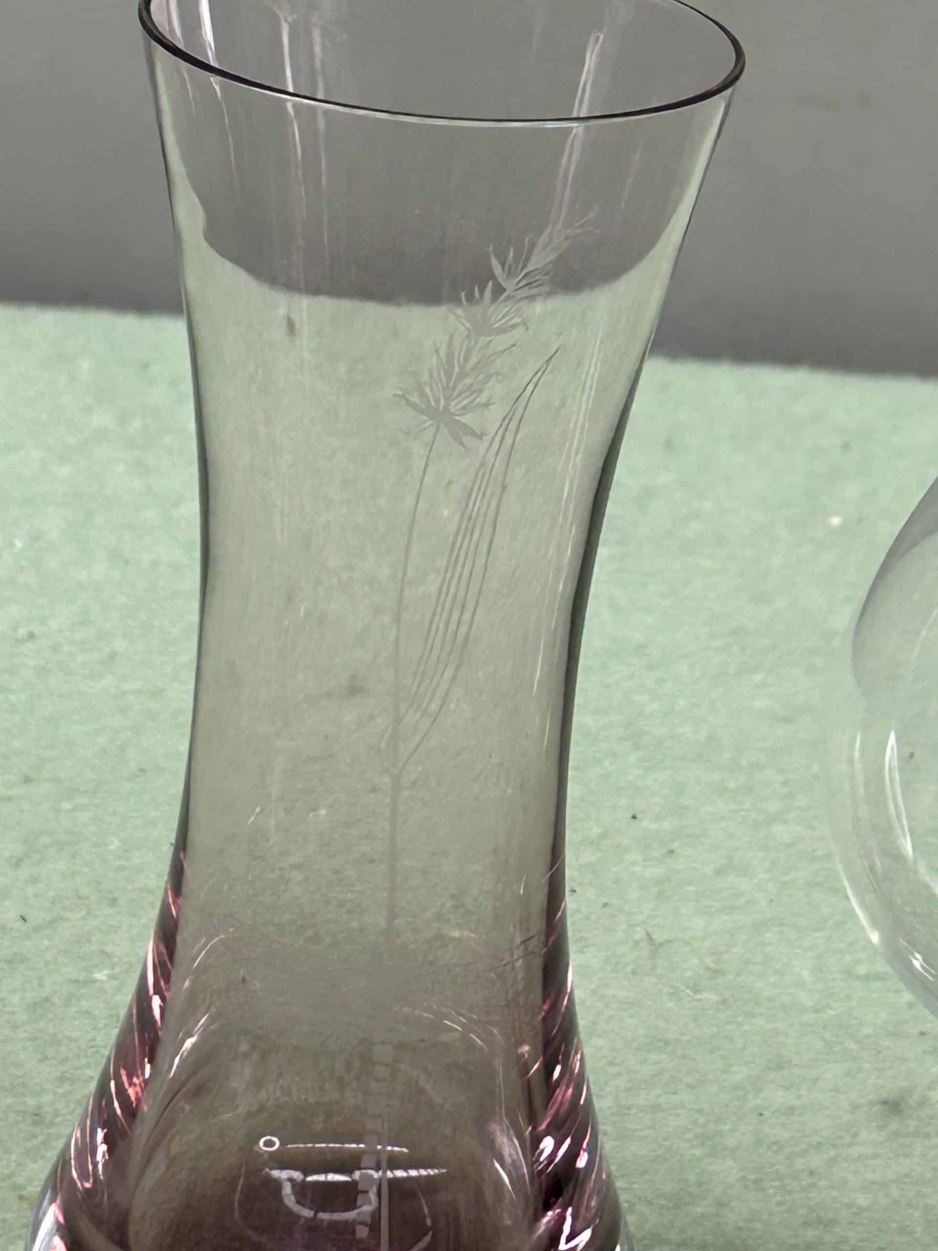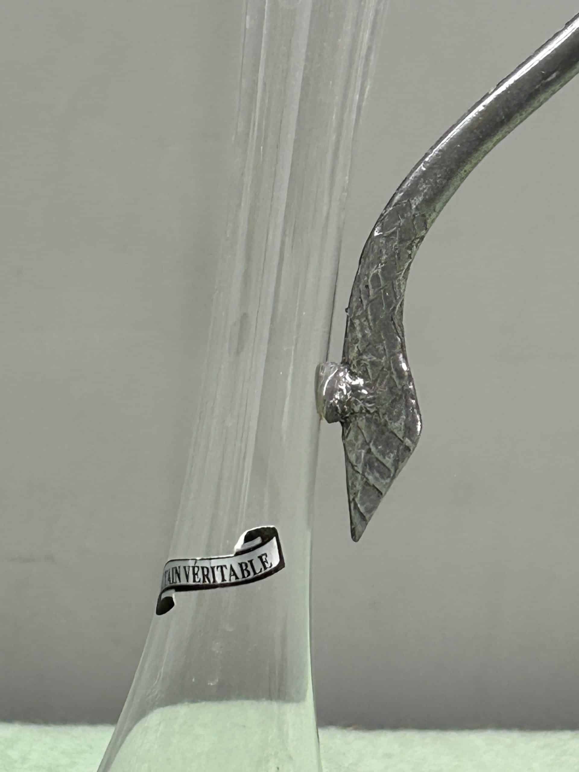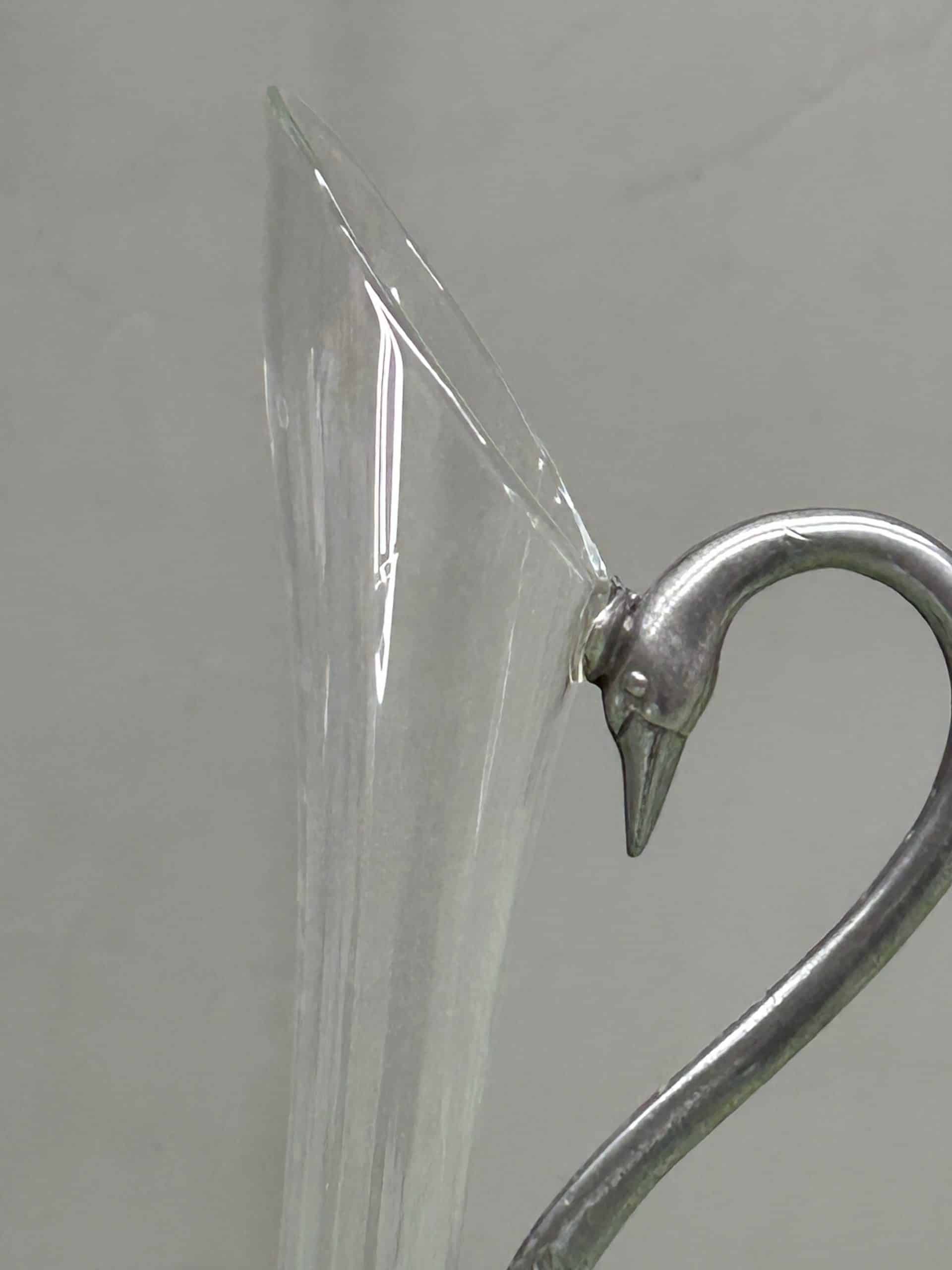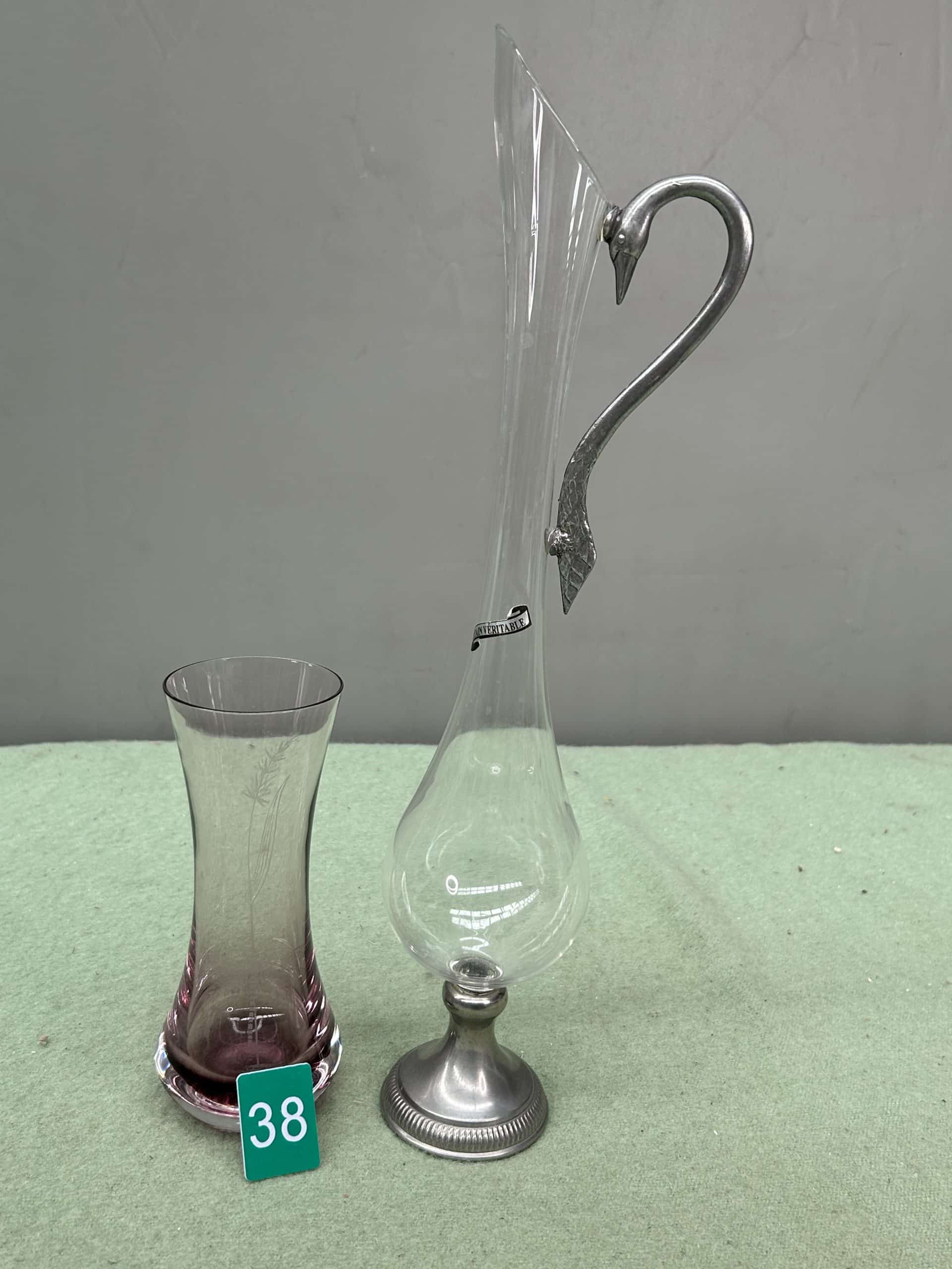 Collectable pewter and glass ever (Aiguiere) or wine pitcher with swan or bird shaped handle, plus purple tinted glass vase