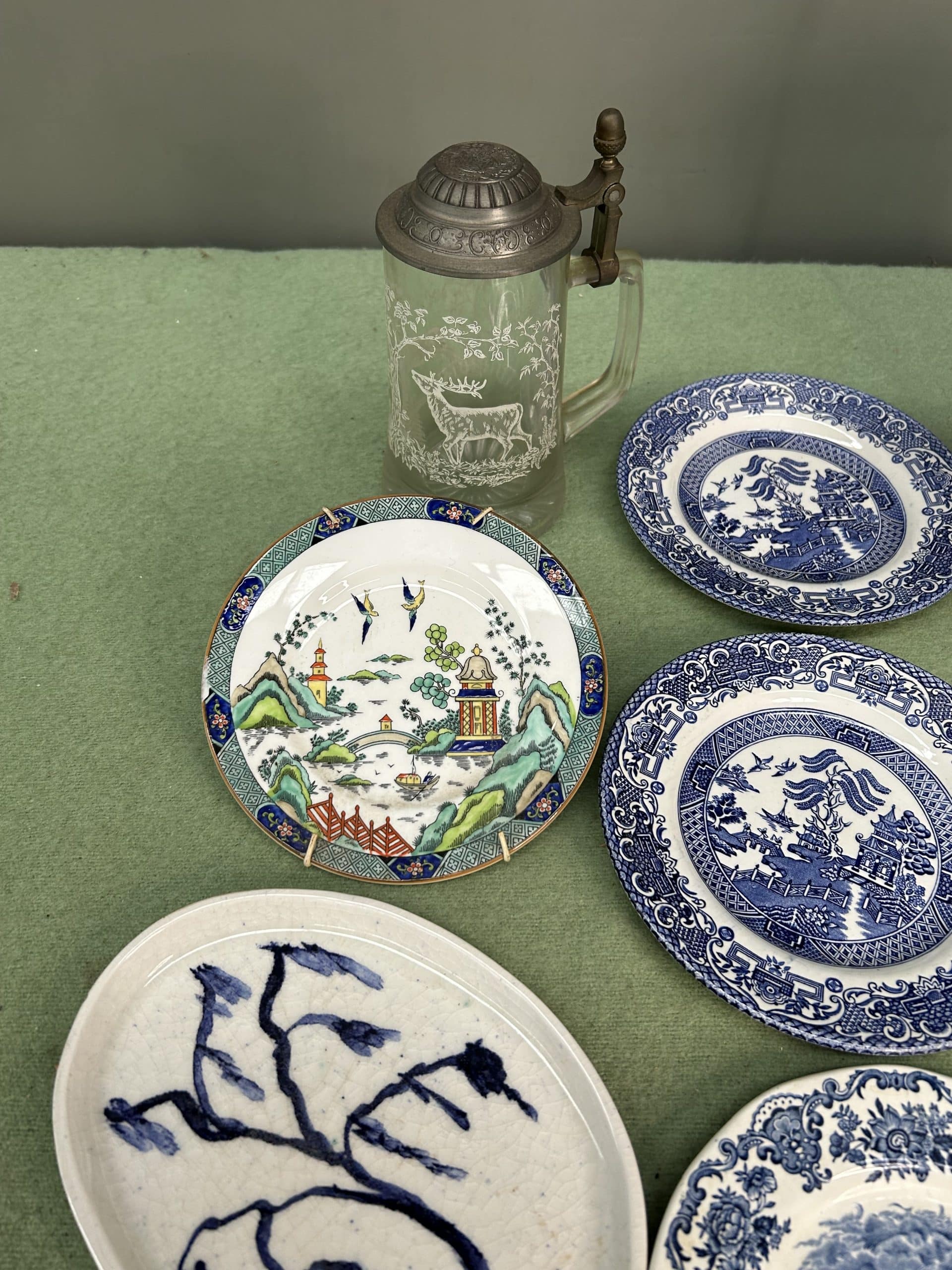 JTA Auction| Item description: | Mixed Lot including blue china plates, green vintage vase, glass beer stein |