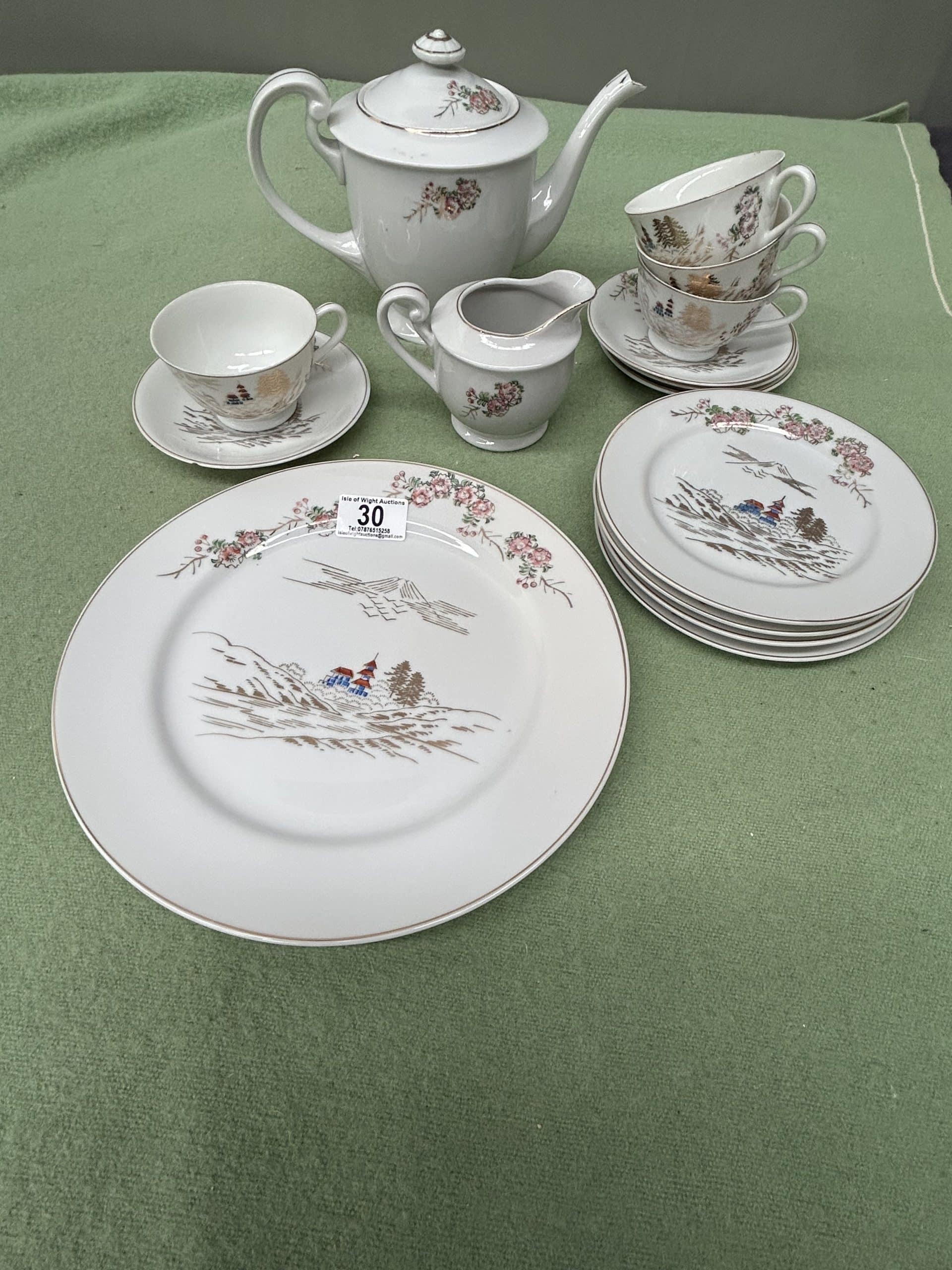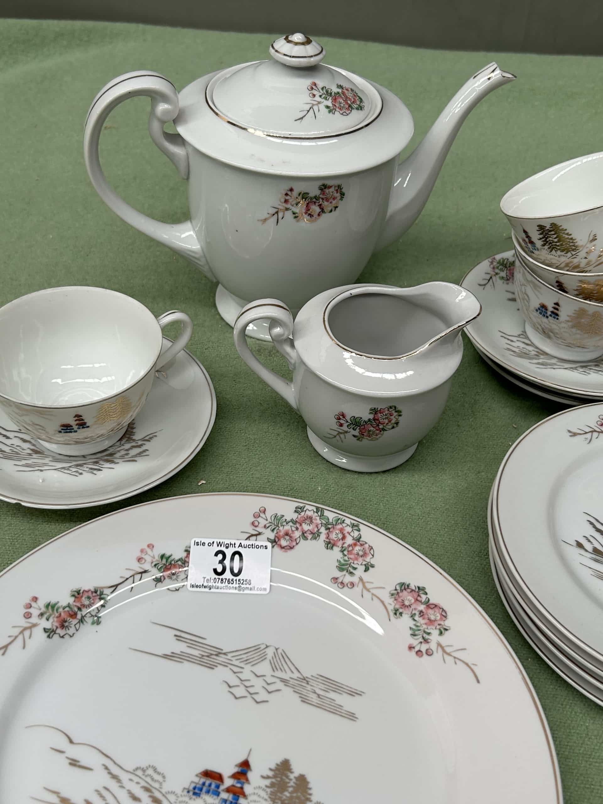 Eleanor’s Auction| Item description: | Vintage Japanese Kutani part tea set includes Teapot, 4 cups & saucers, four side plates, creamer and one dinner plate (small nibble on one of the side plates, see photo) |