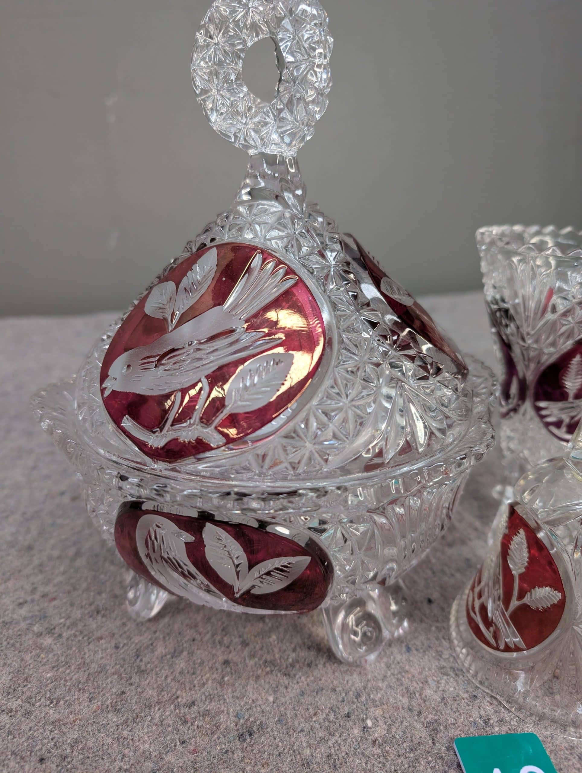 A collection of cranberry and clear glass items.