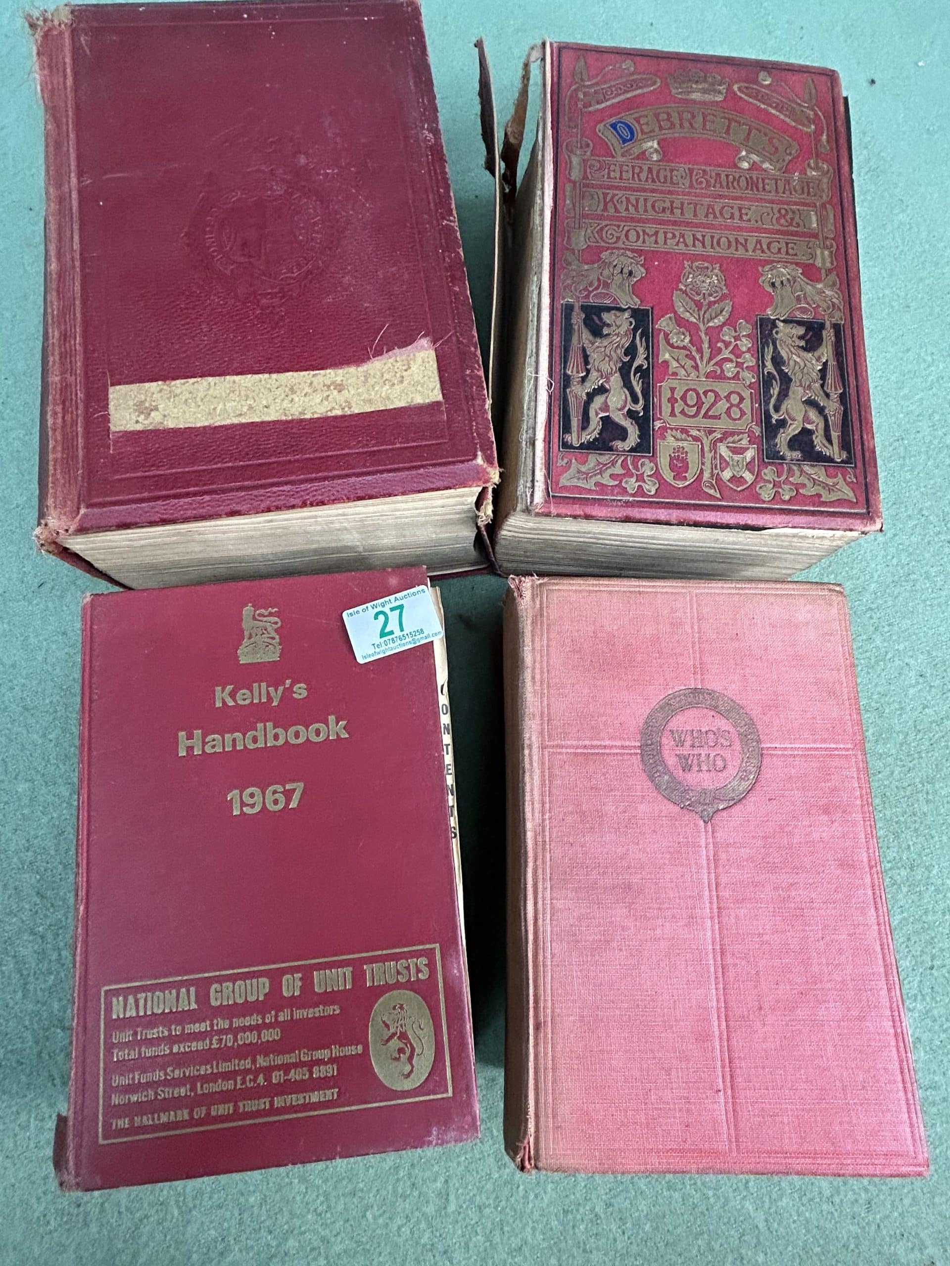 Wren Auction (part two)| Item description: | Collection of well used books 1928 Debretts spine damage, Who’s Who, 1967 Kelly’s and one other reference |