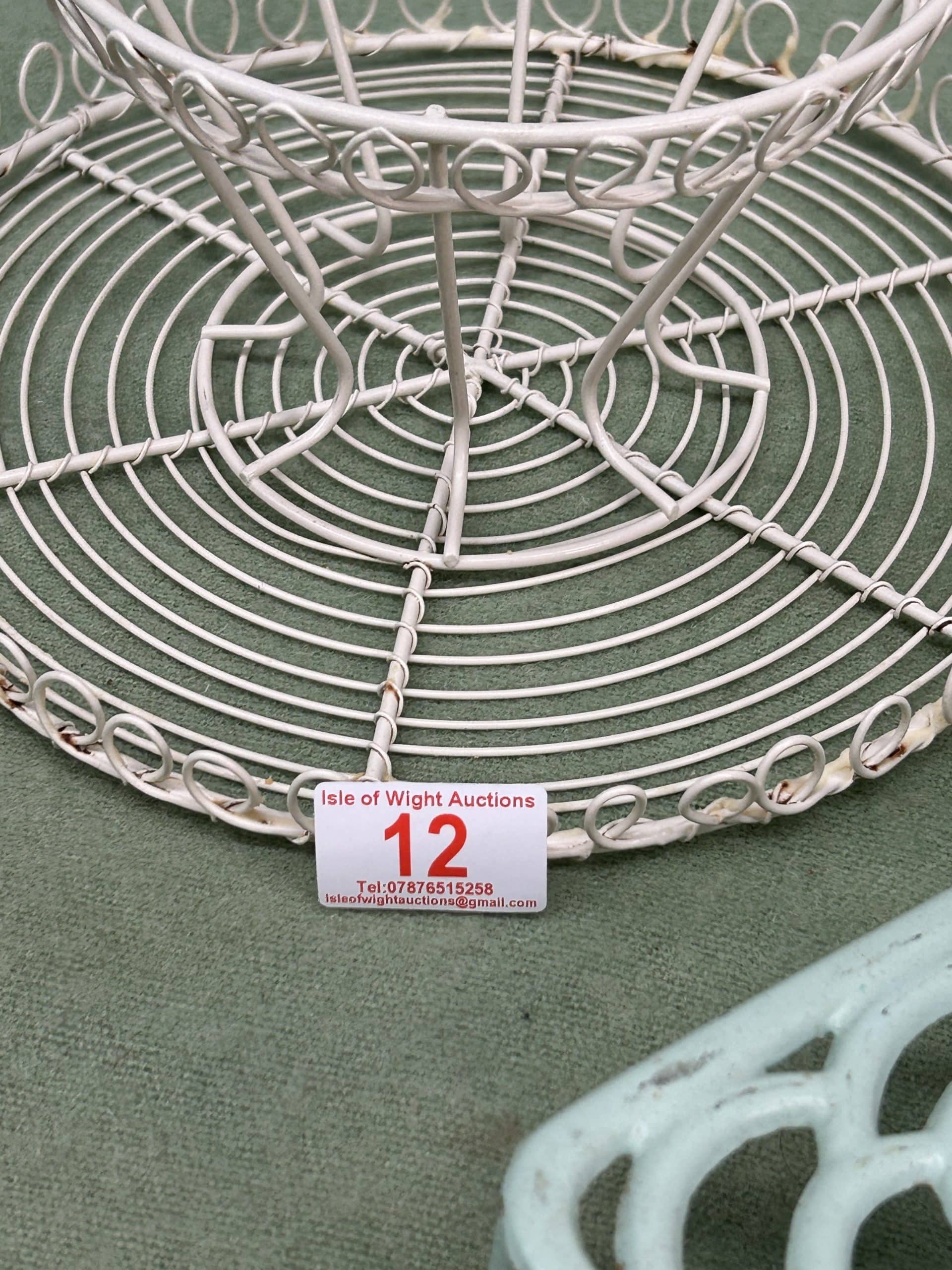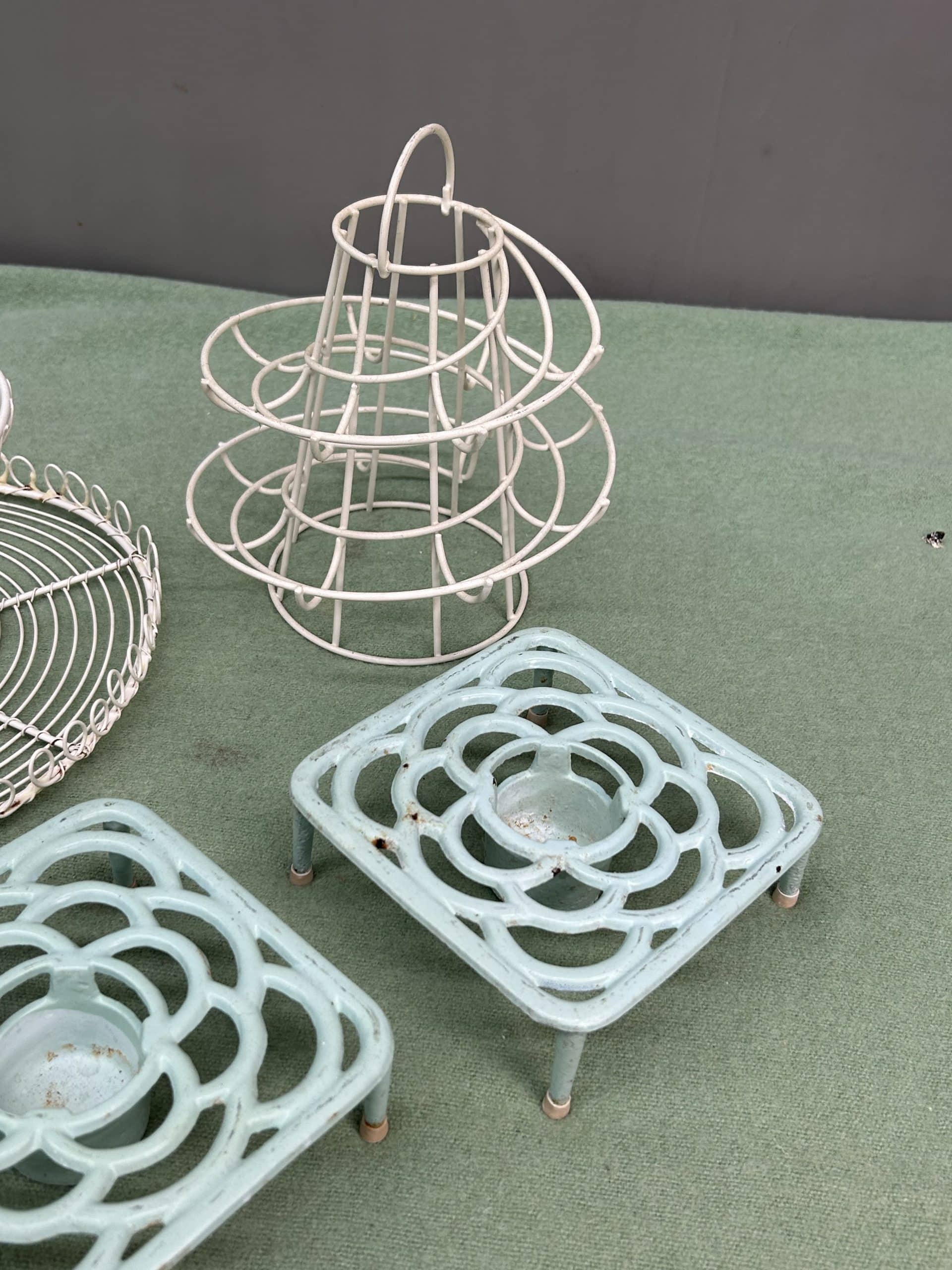 Downsizing Auction| Item description: | Vintage style kitchen accessories includes two wire ware decorative items, and two cast iron trivets |