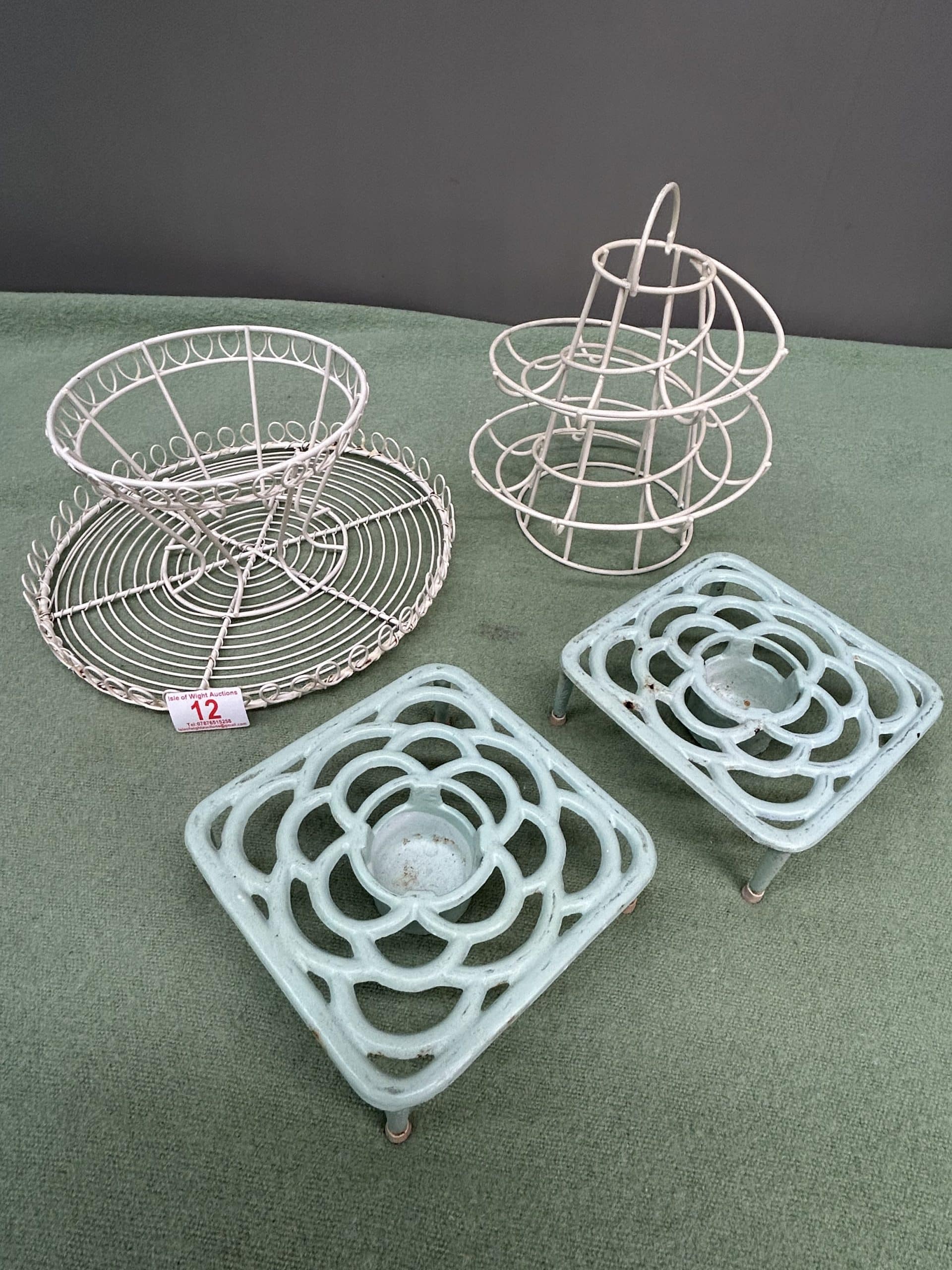 Downsizing Auction| Item description: | Vintage style kitchen accessories includes two wire ware decorative items, and two cast iron trivets |