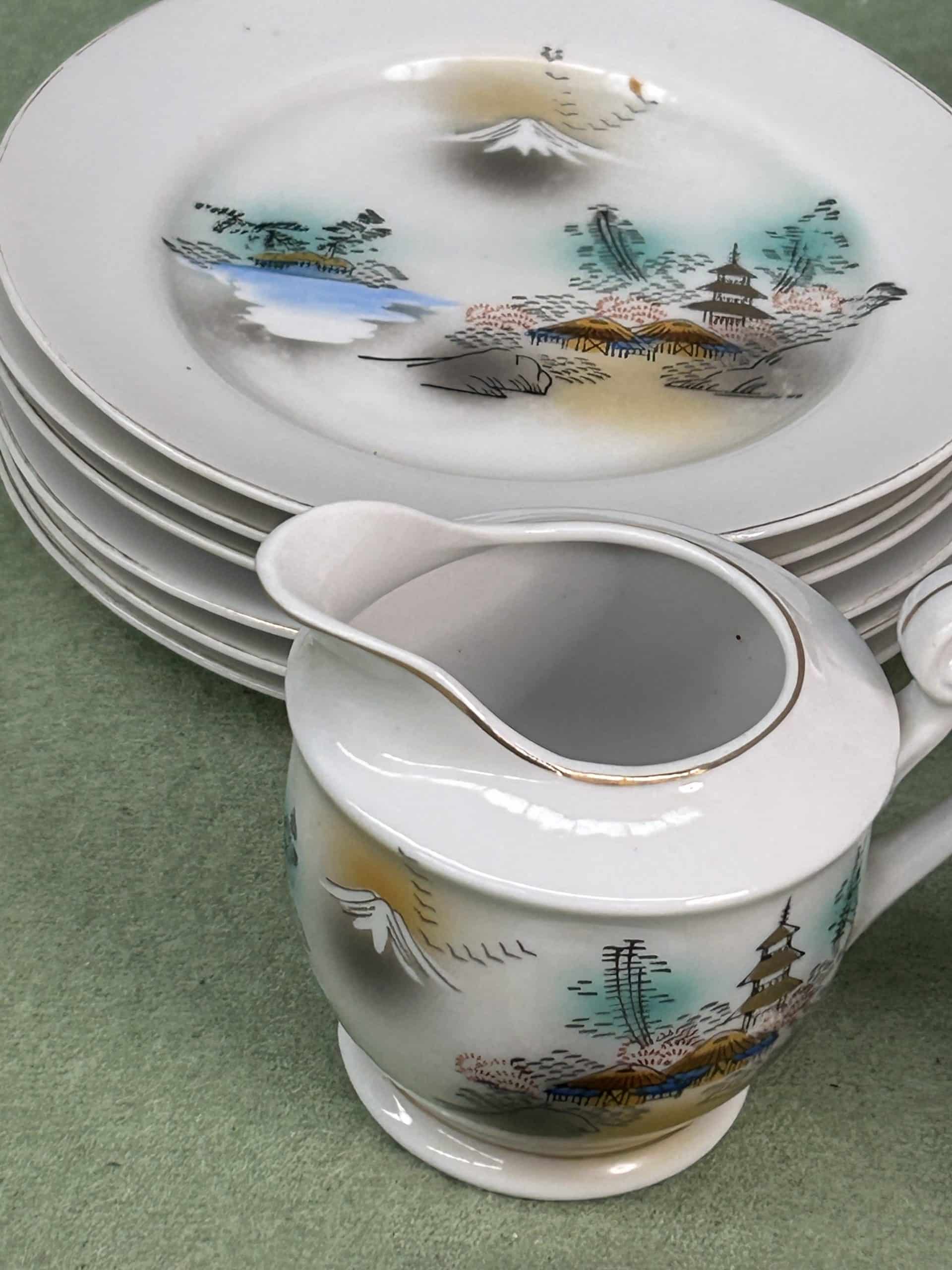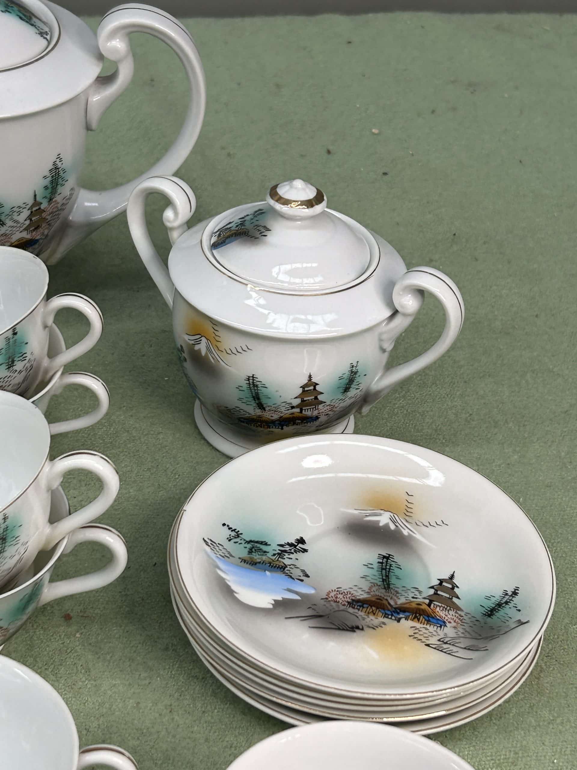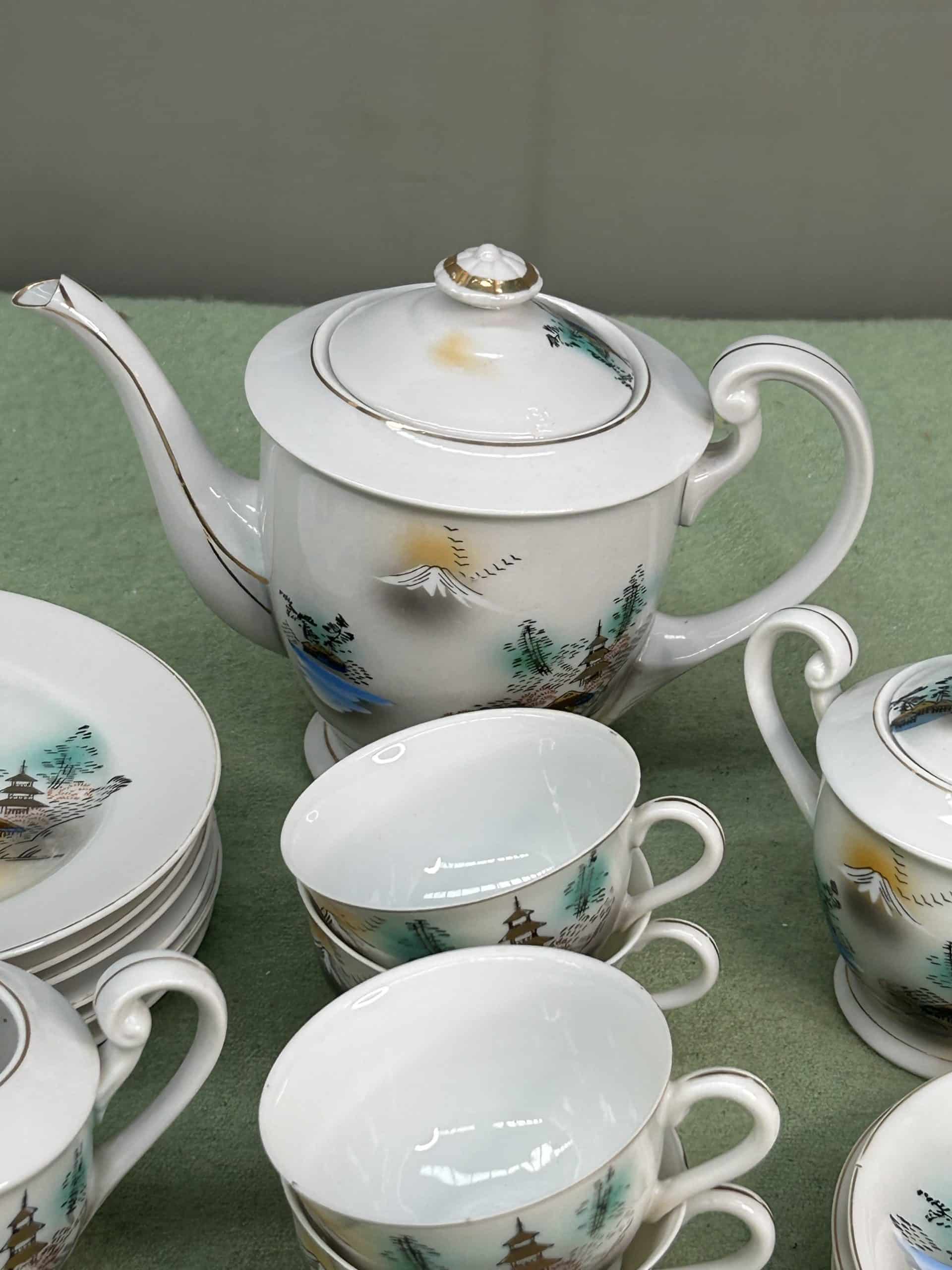 C & E Auction| Item description: | Vintage Japanese porcelain tea set often identified as Kutani or similar style, hand painted scenes of Mount Fuji |