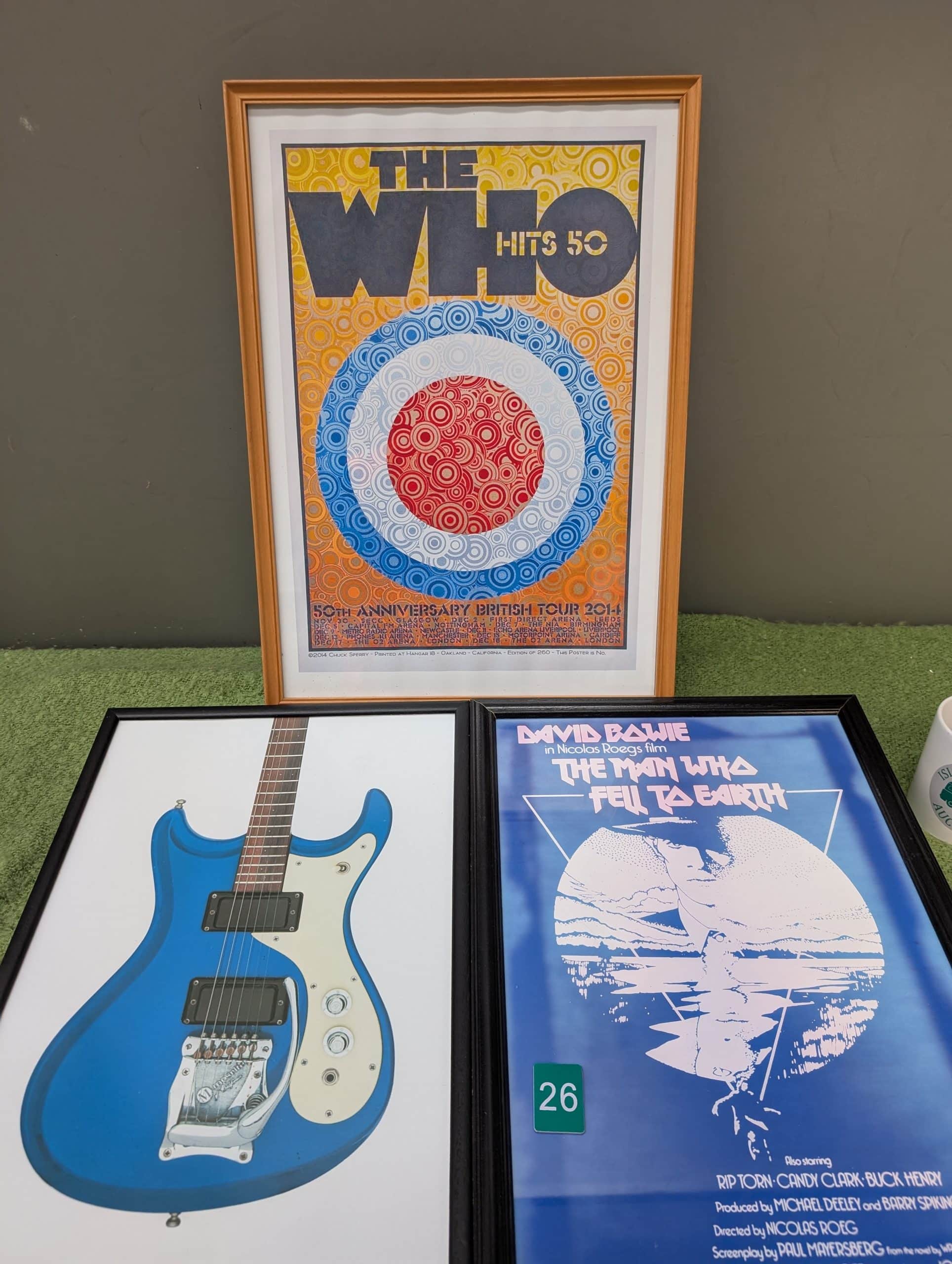 Three framed prints incl. The Who and David Bowie.