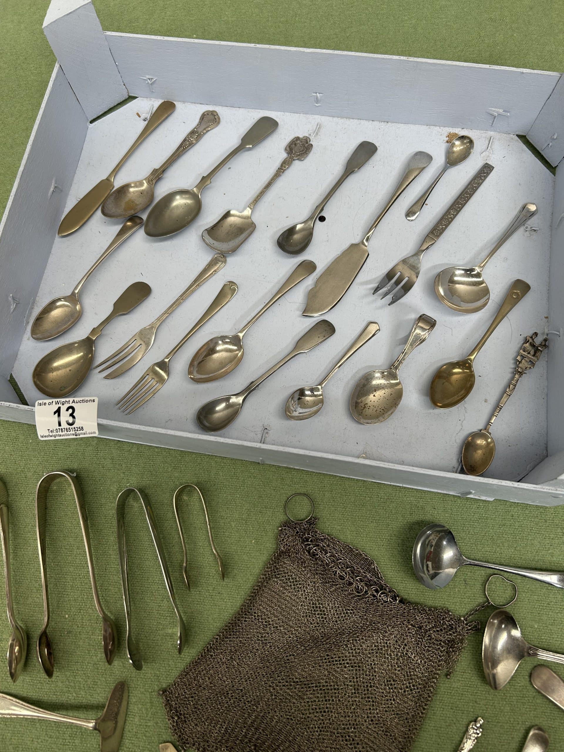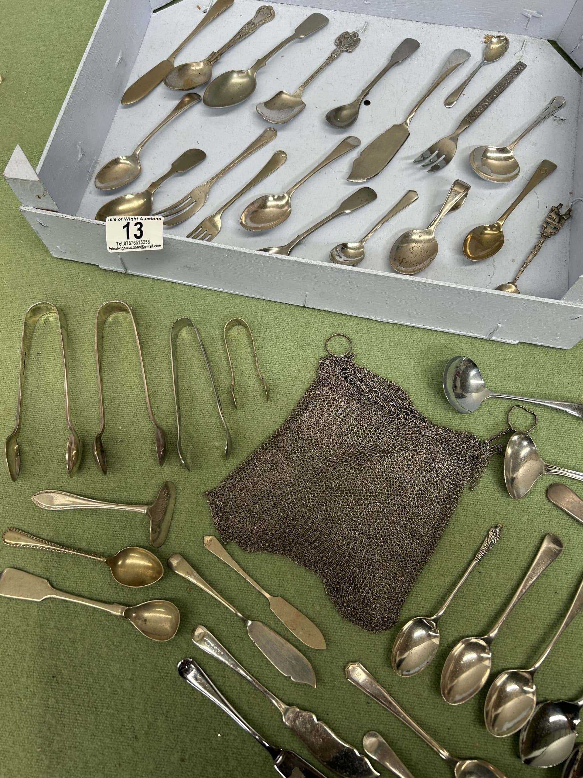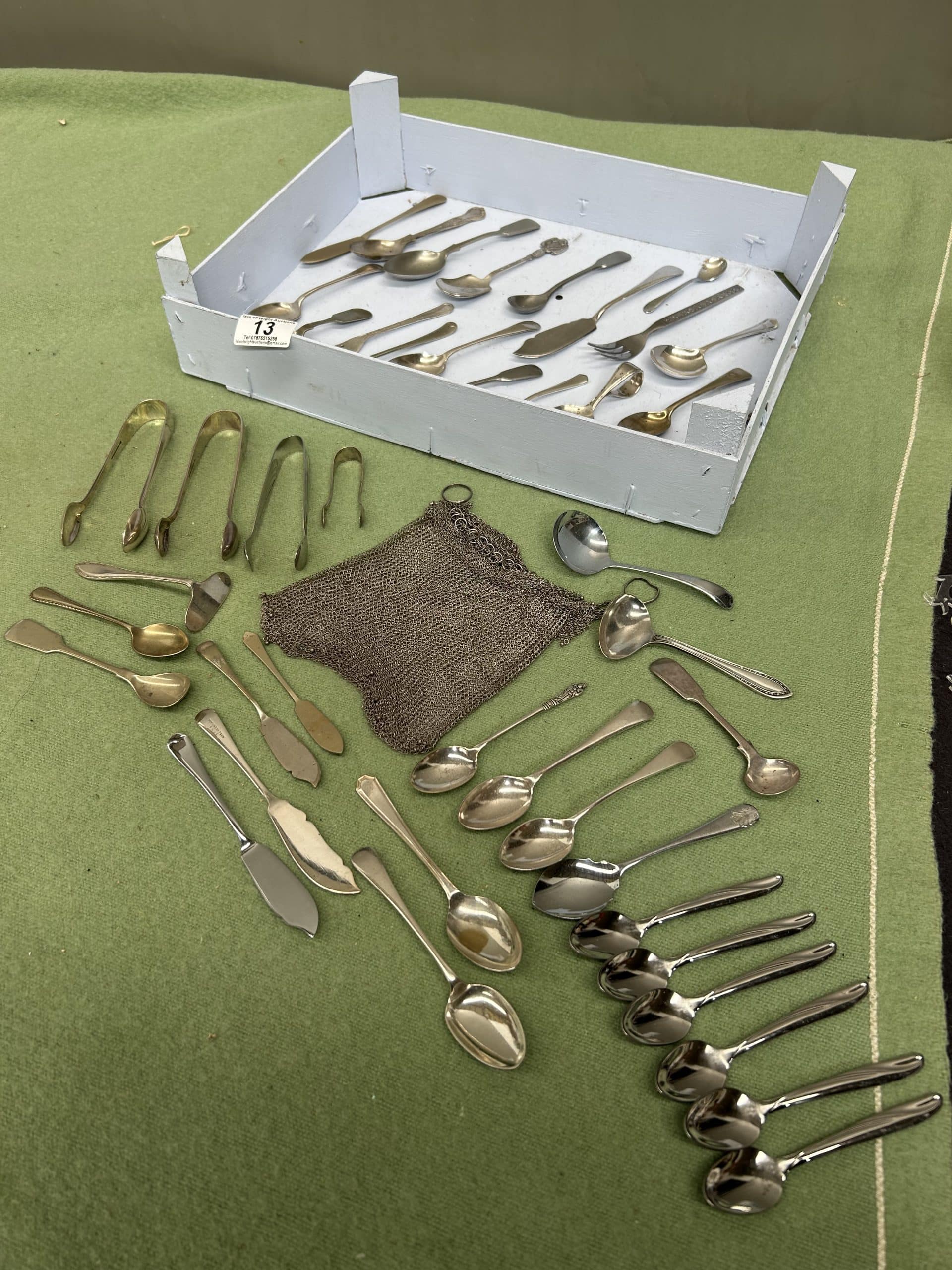 Eleanor’s Auction| Item description: | Nice collection of silver or silver plated spoons, forks, sugar tongs, serving spoons, chain mail bag etc |