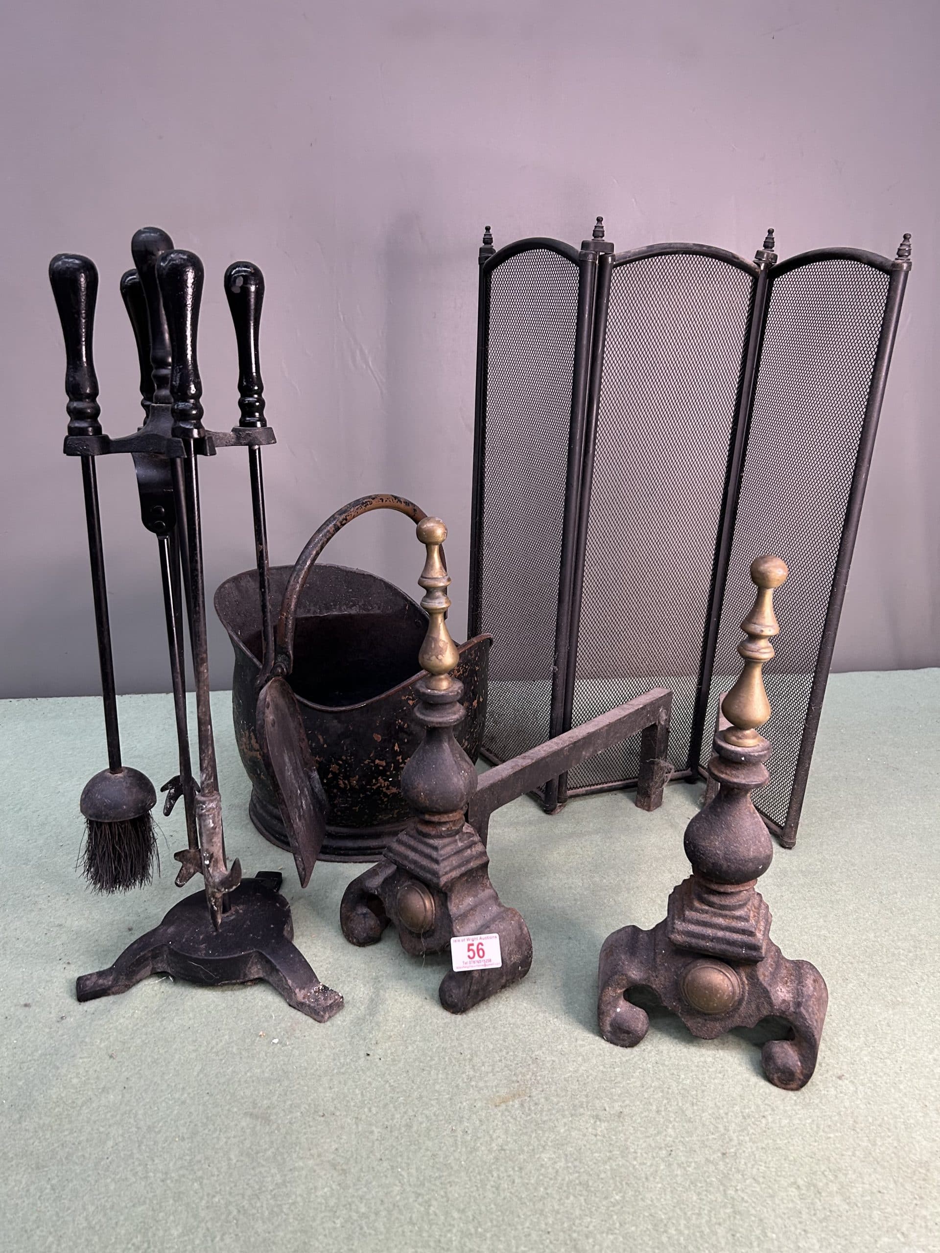 Lot 56: Fire dogs, companion, & sundries