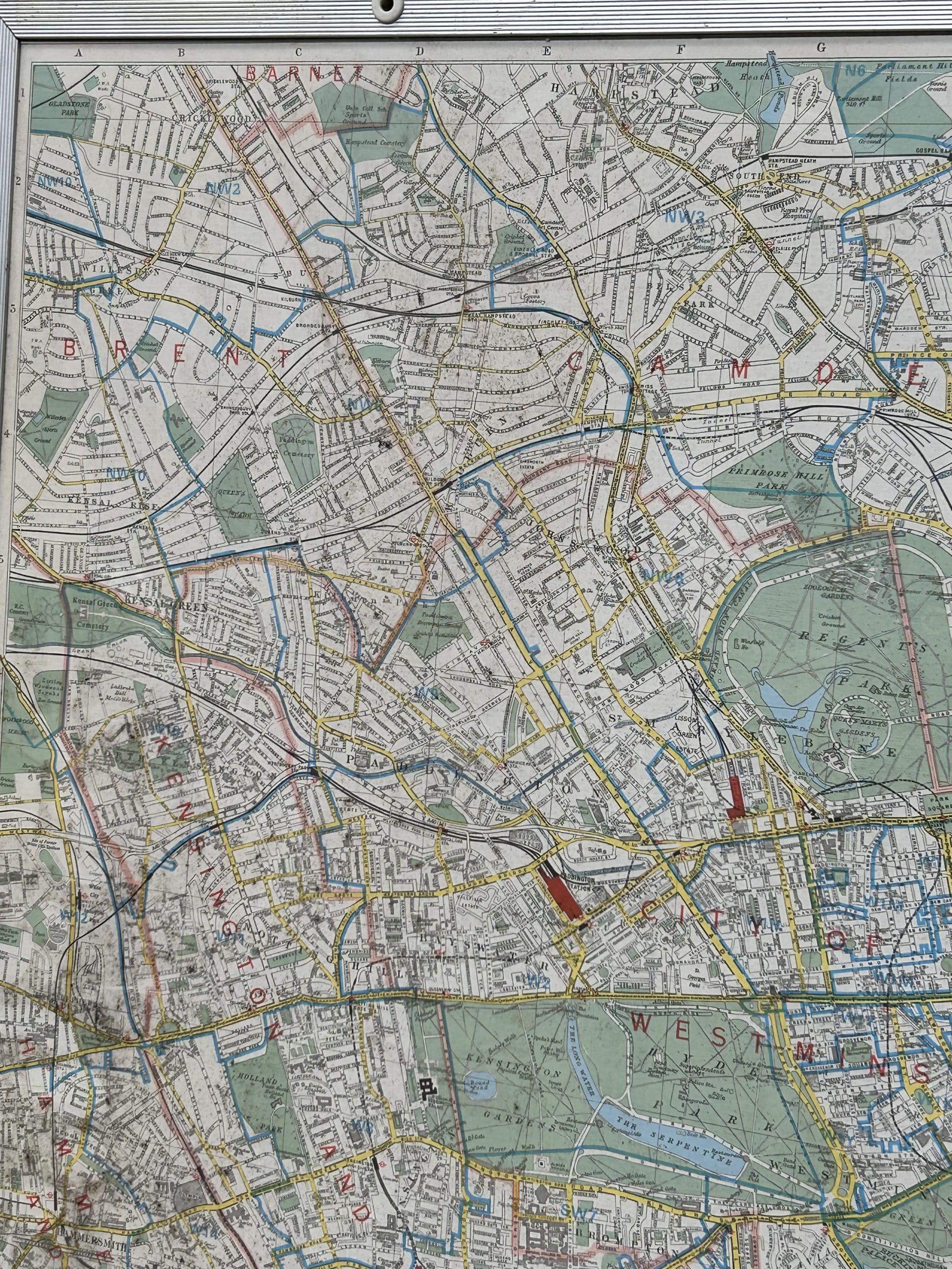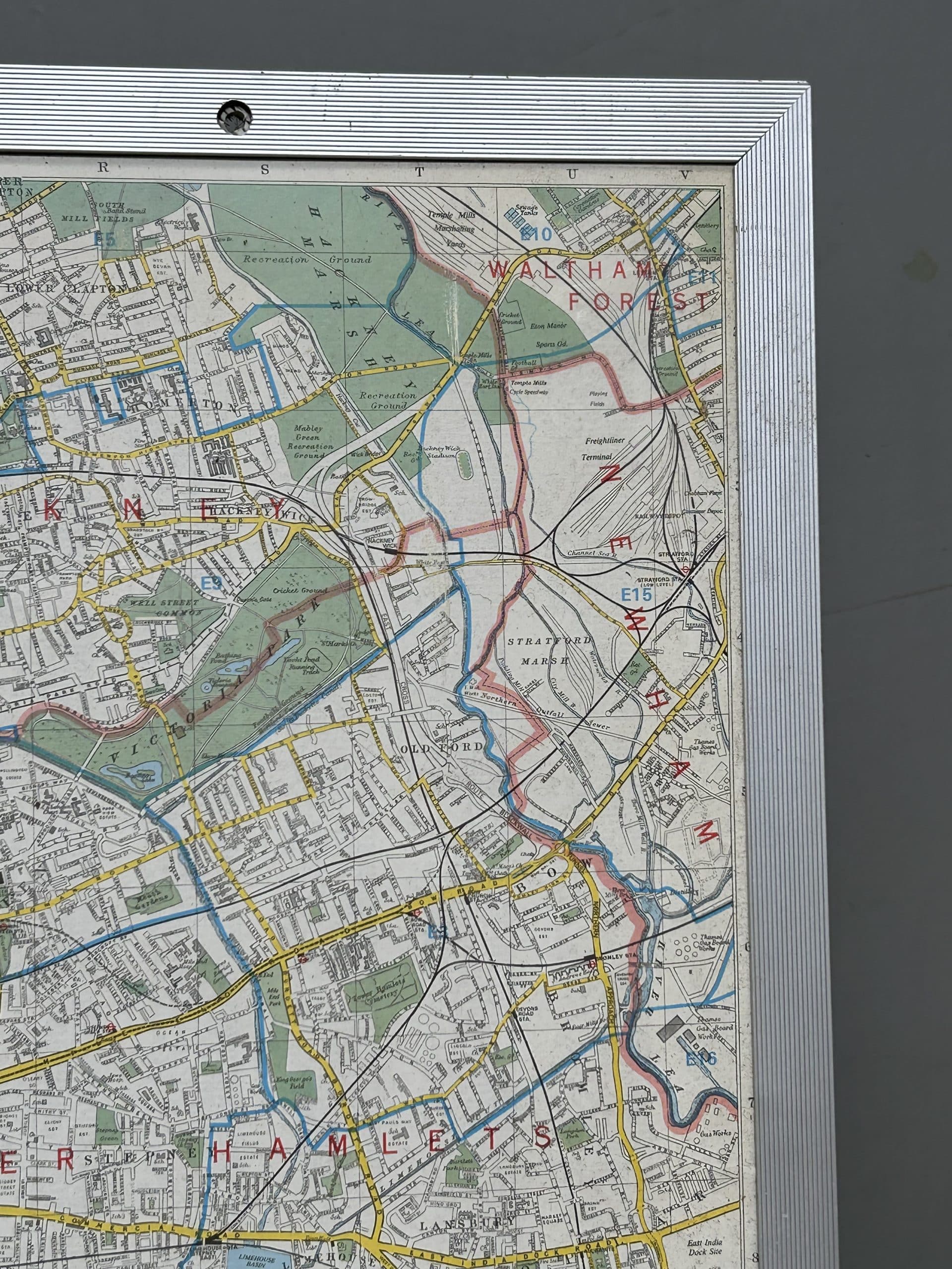 Huge framed map of central and outer London areas approx 60” x 30”