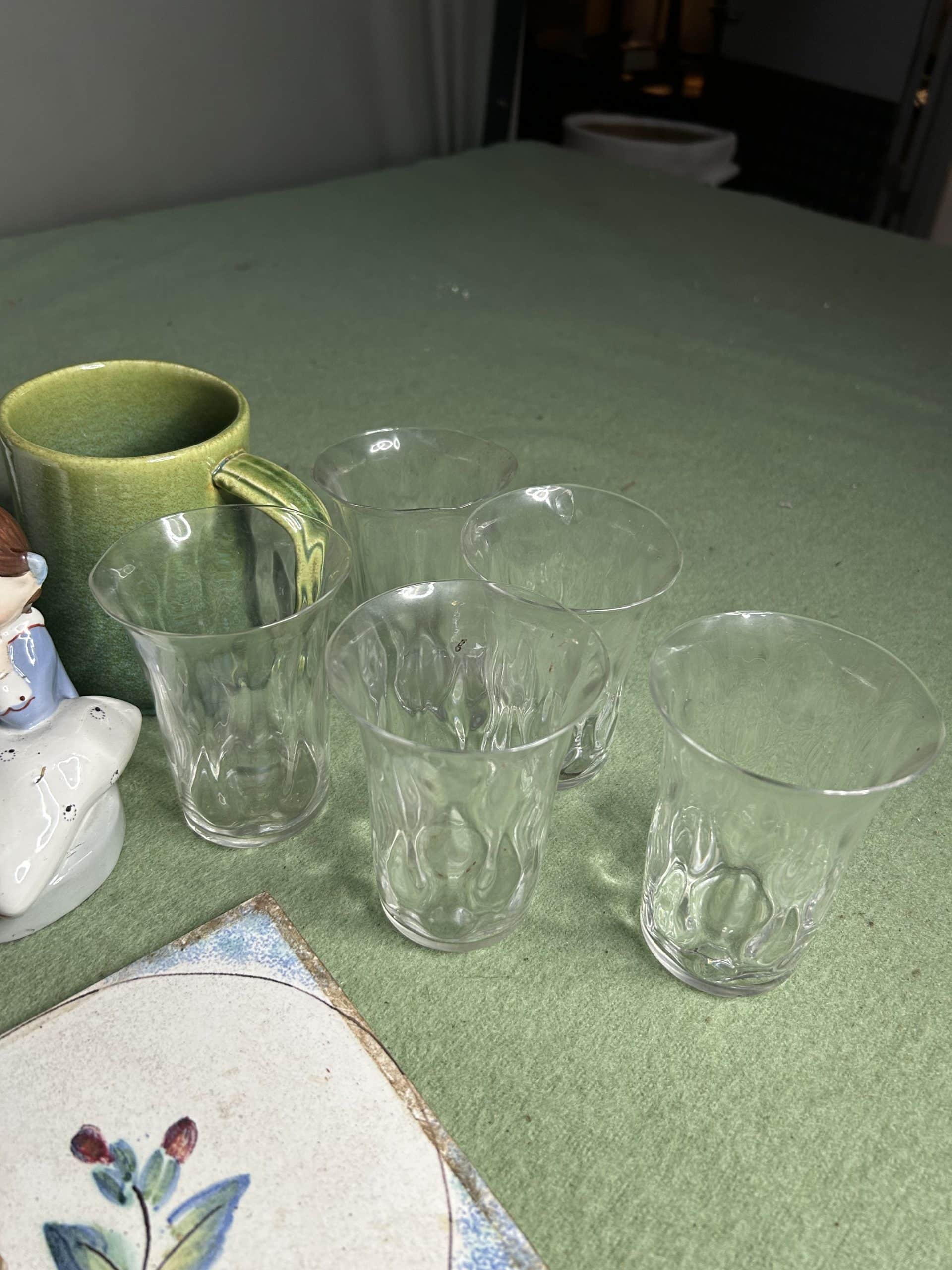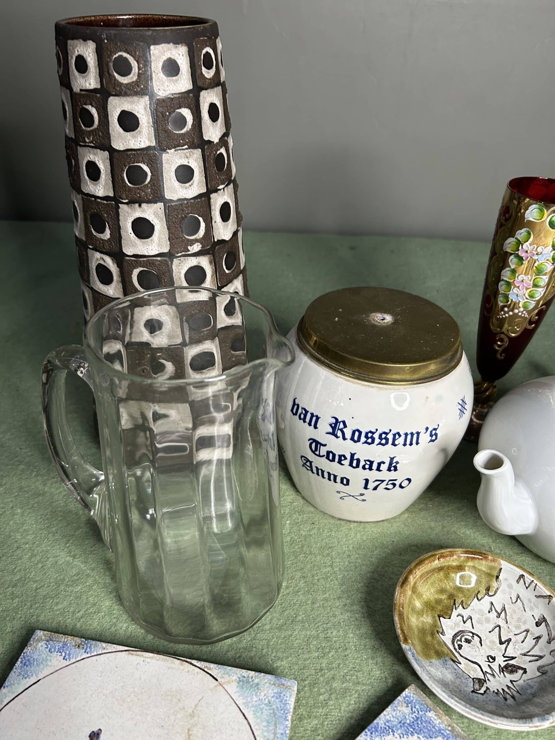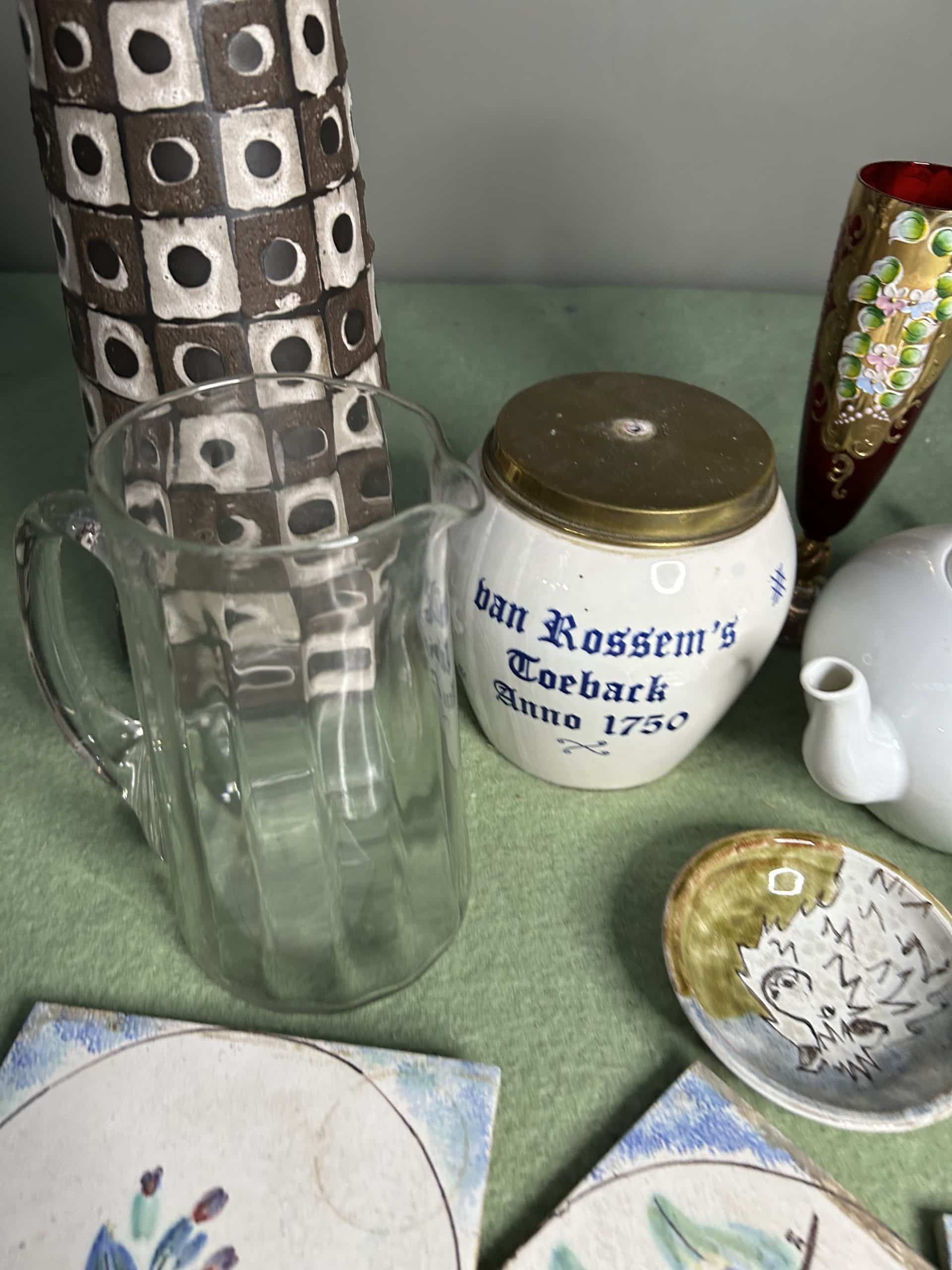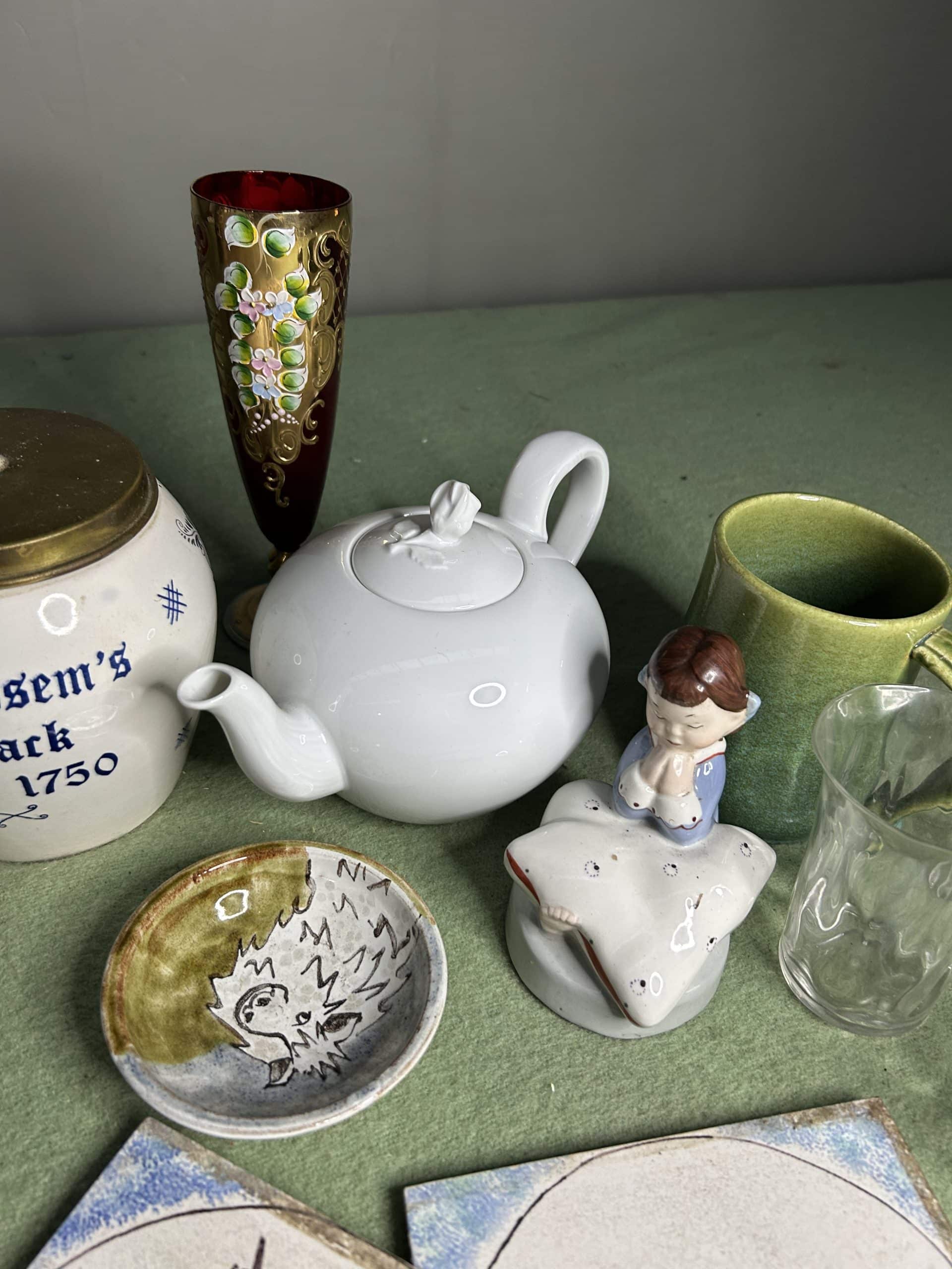 Mixed lot to include vase, teapot, glasses, mug, & 3 matching tiles