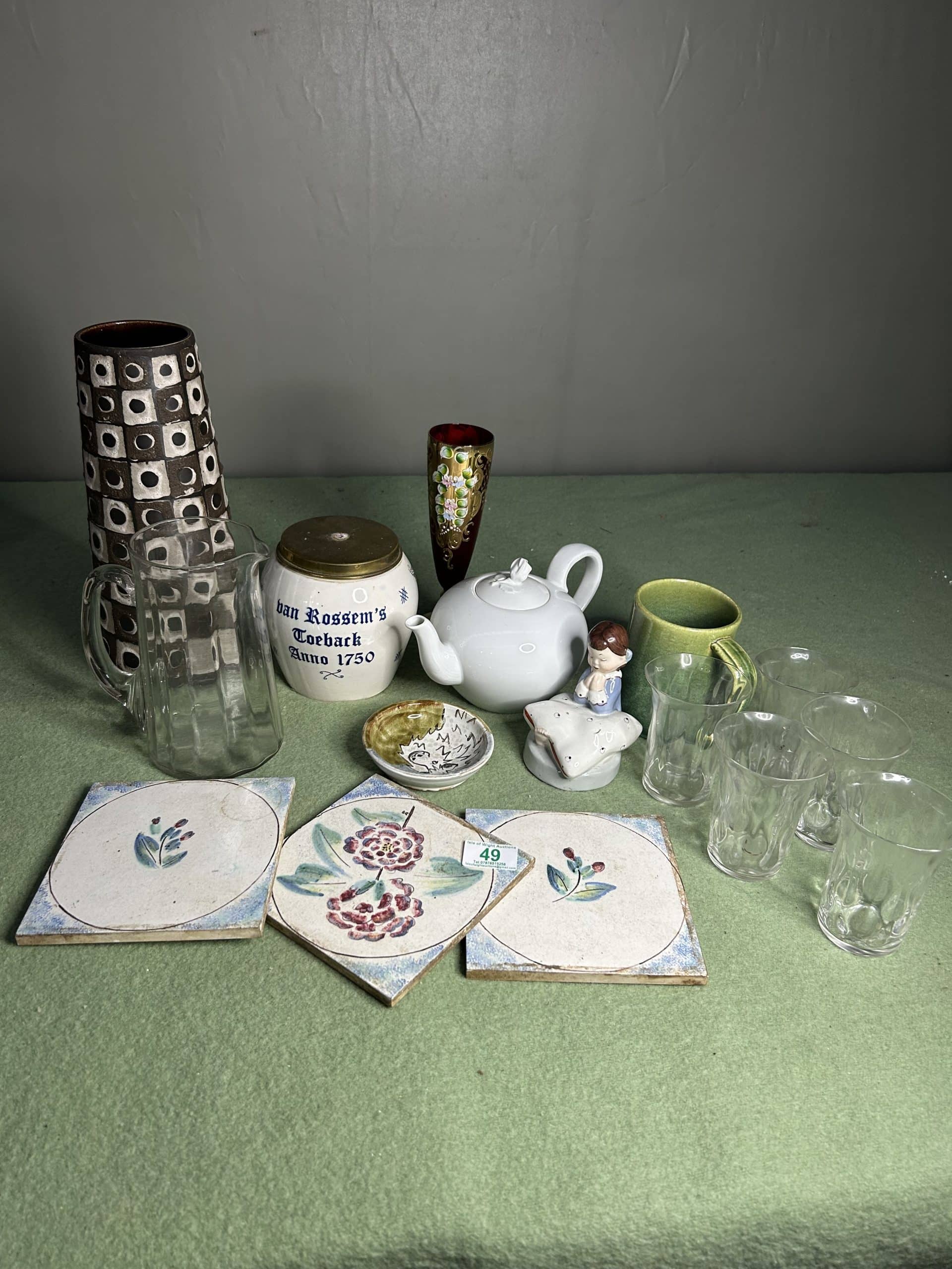 Mixed lot to include vase, teapot, glasses, mug, & 3 matching tiles