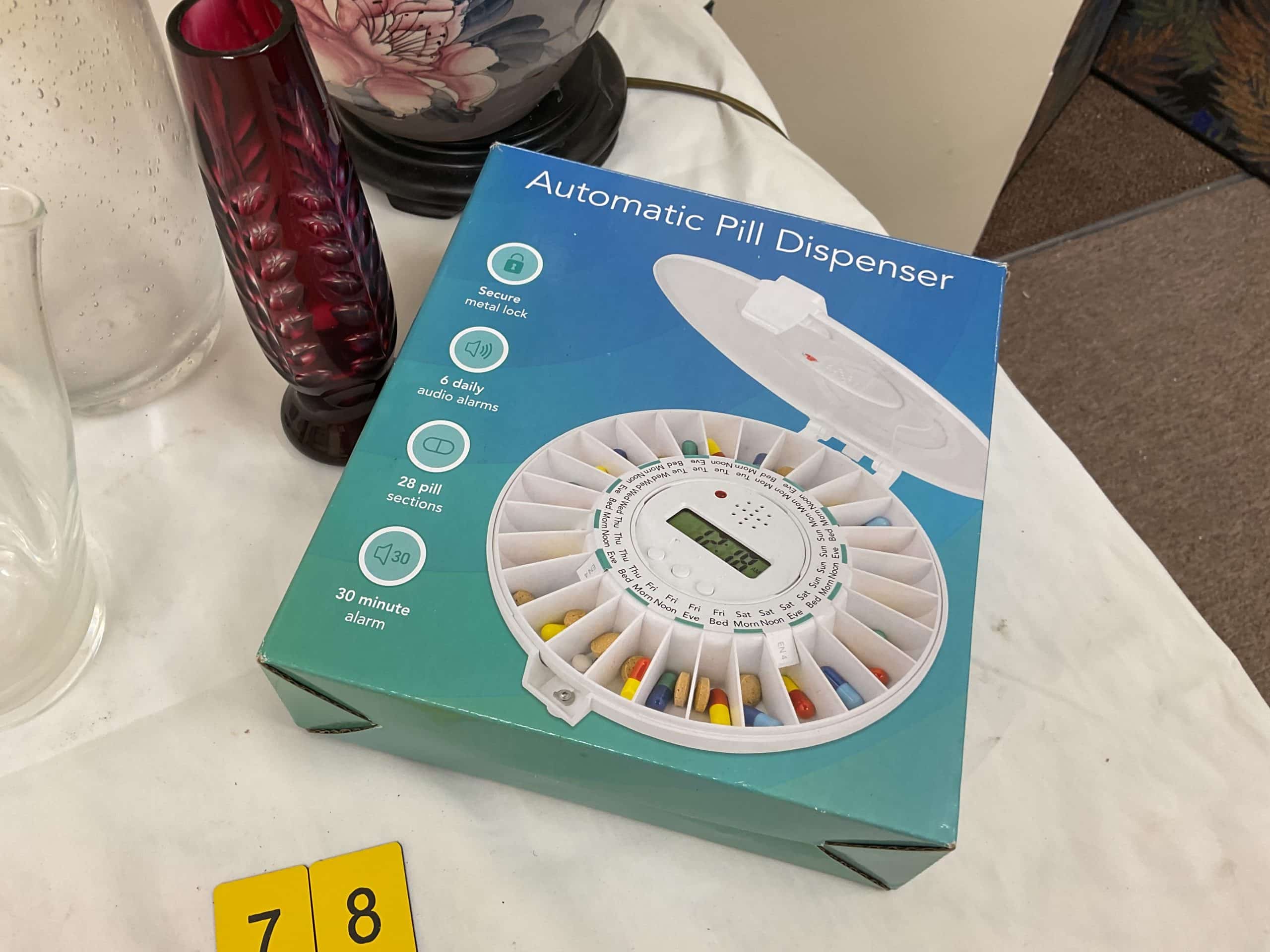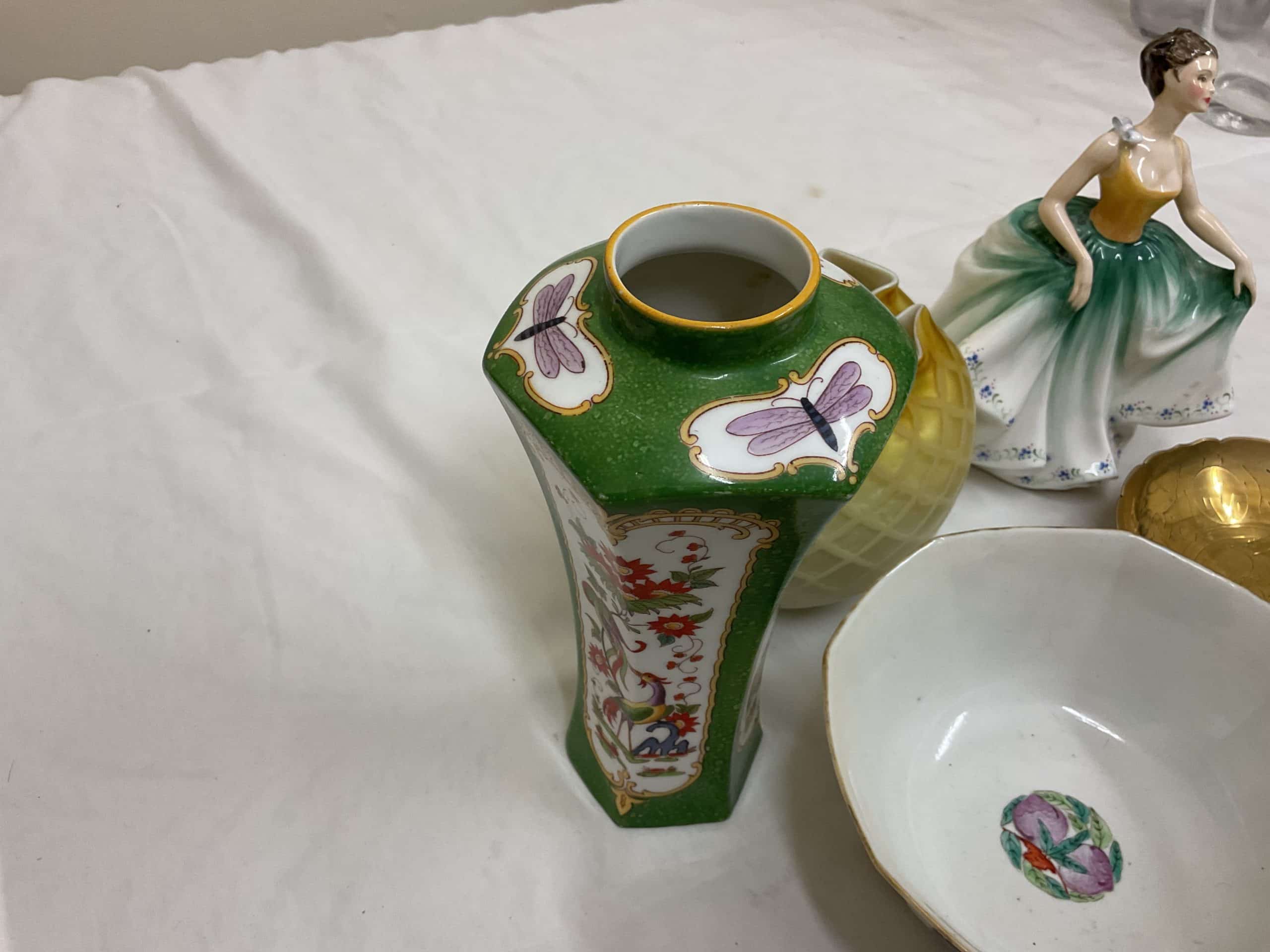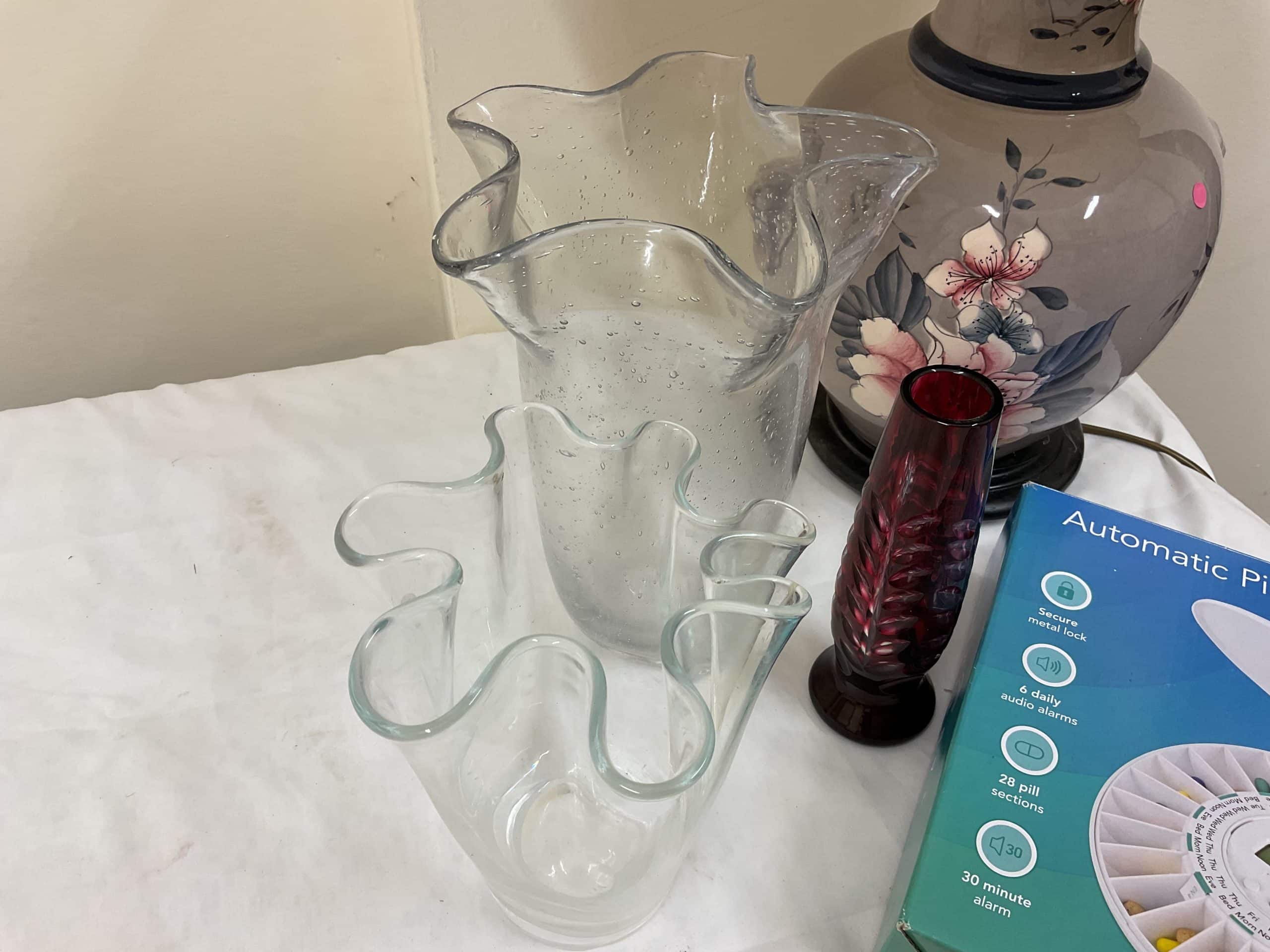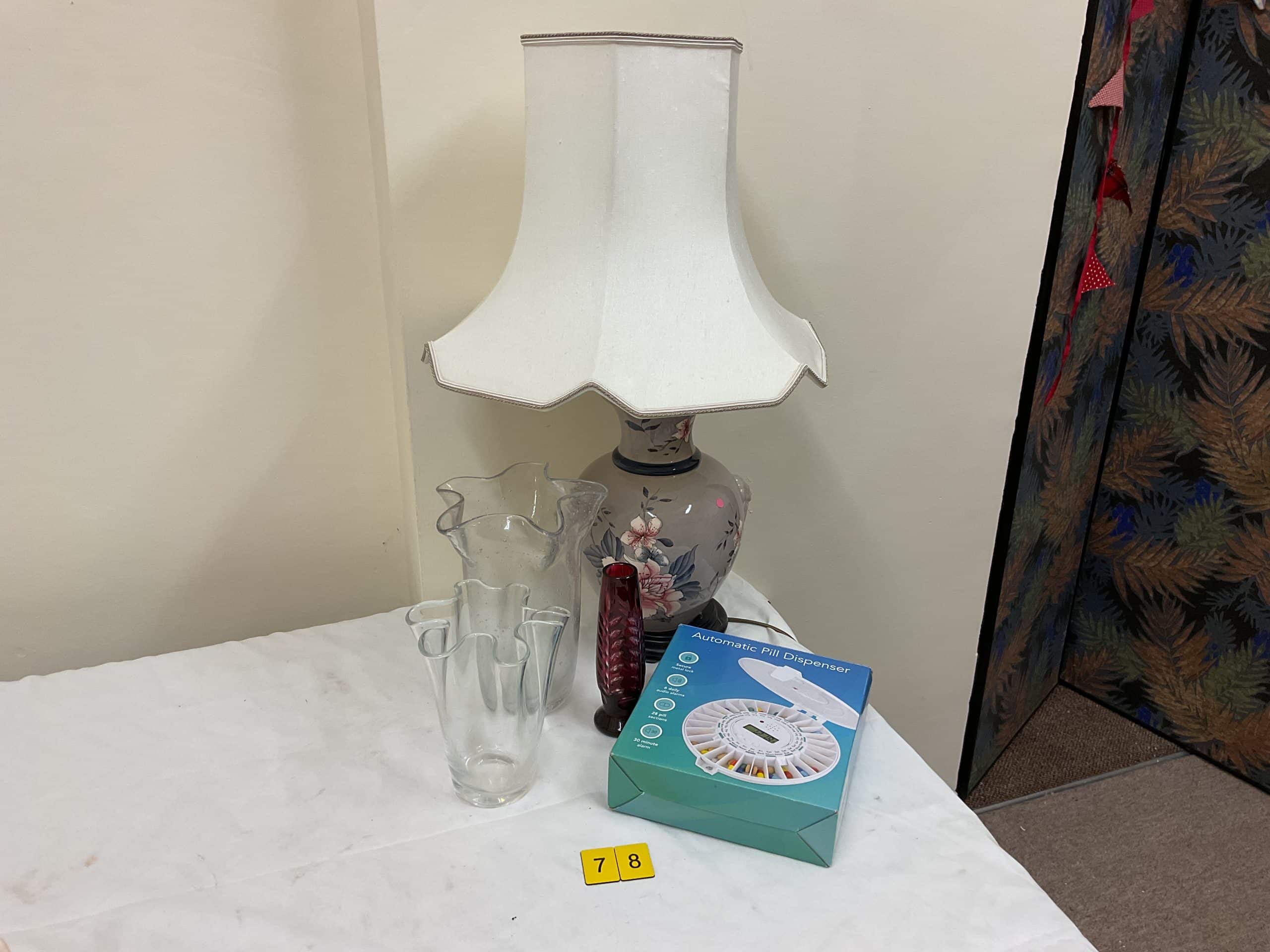 Mixed Lot mixture of glassware, Lamp, pill organiser / dispenser, various ceramics, mirror, large vase, small green vase, metal pin dish, figurine