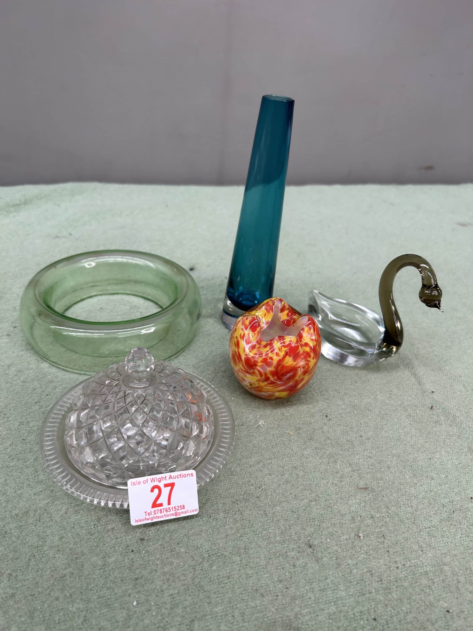 Tilly’s Auction (Part 2)| Item description: | Mixed lot includes various glassware, posy vase, cut glass butter dish, glass swan, spatter glass item |