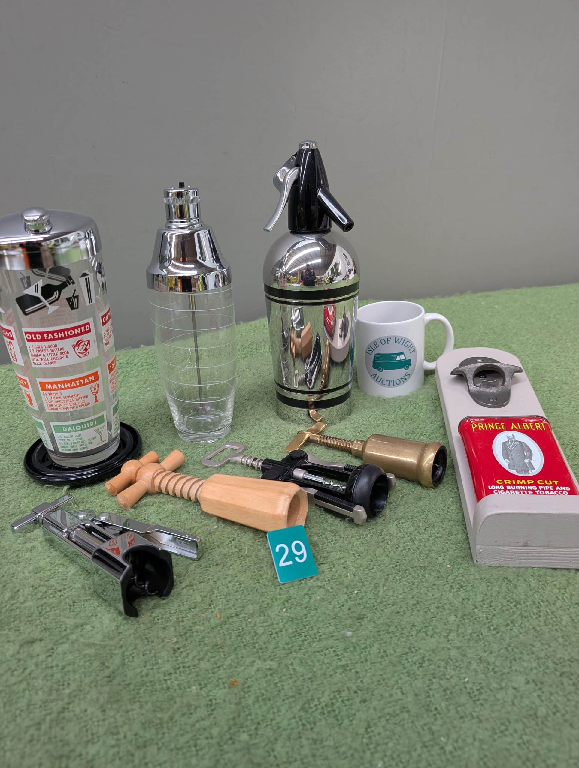 Mrs Bakers Auction| Item description: | Assorted cocktail items, incl. a soda syphon and cocktail shaker. |