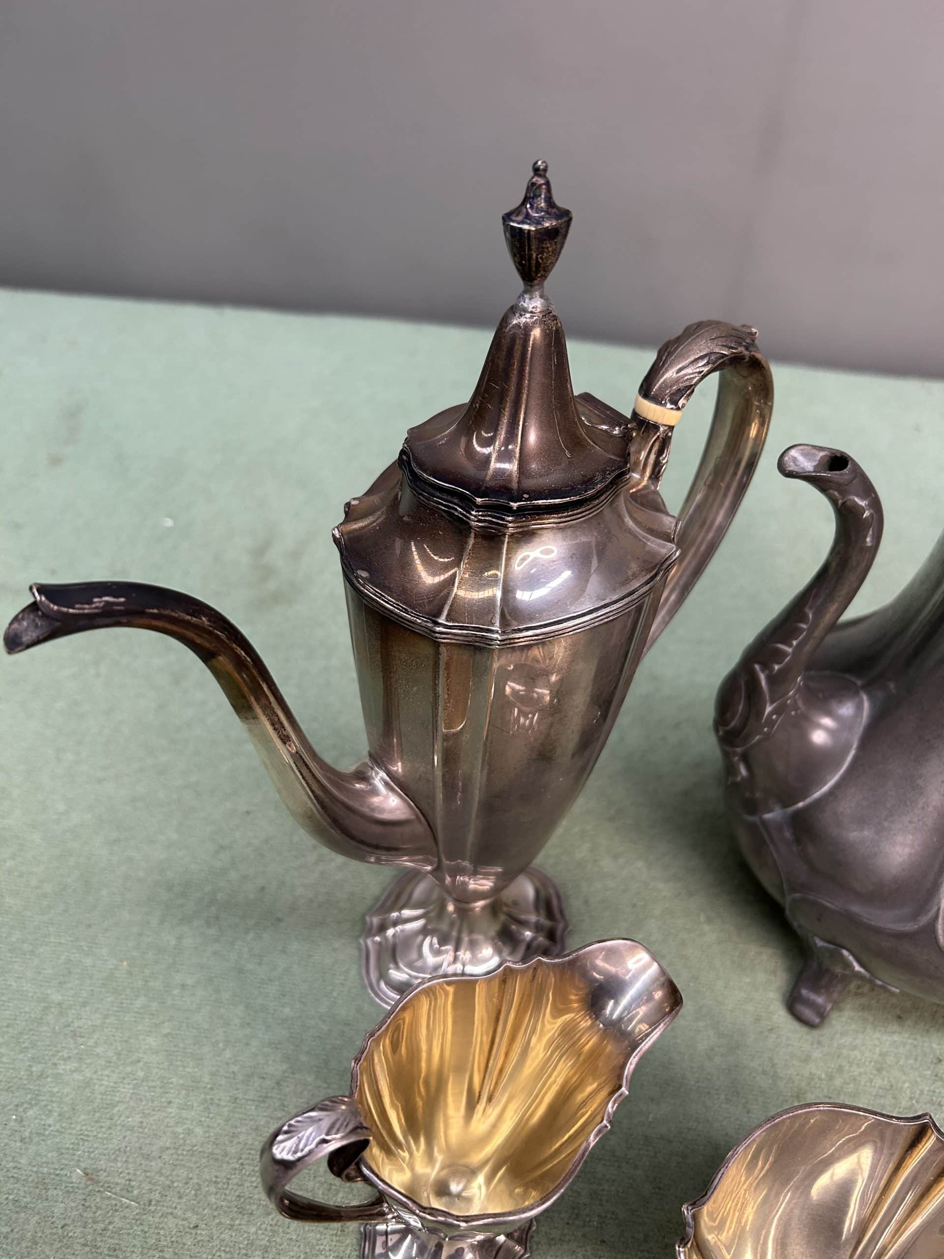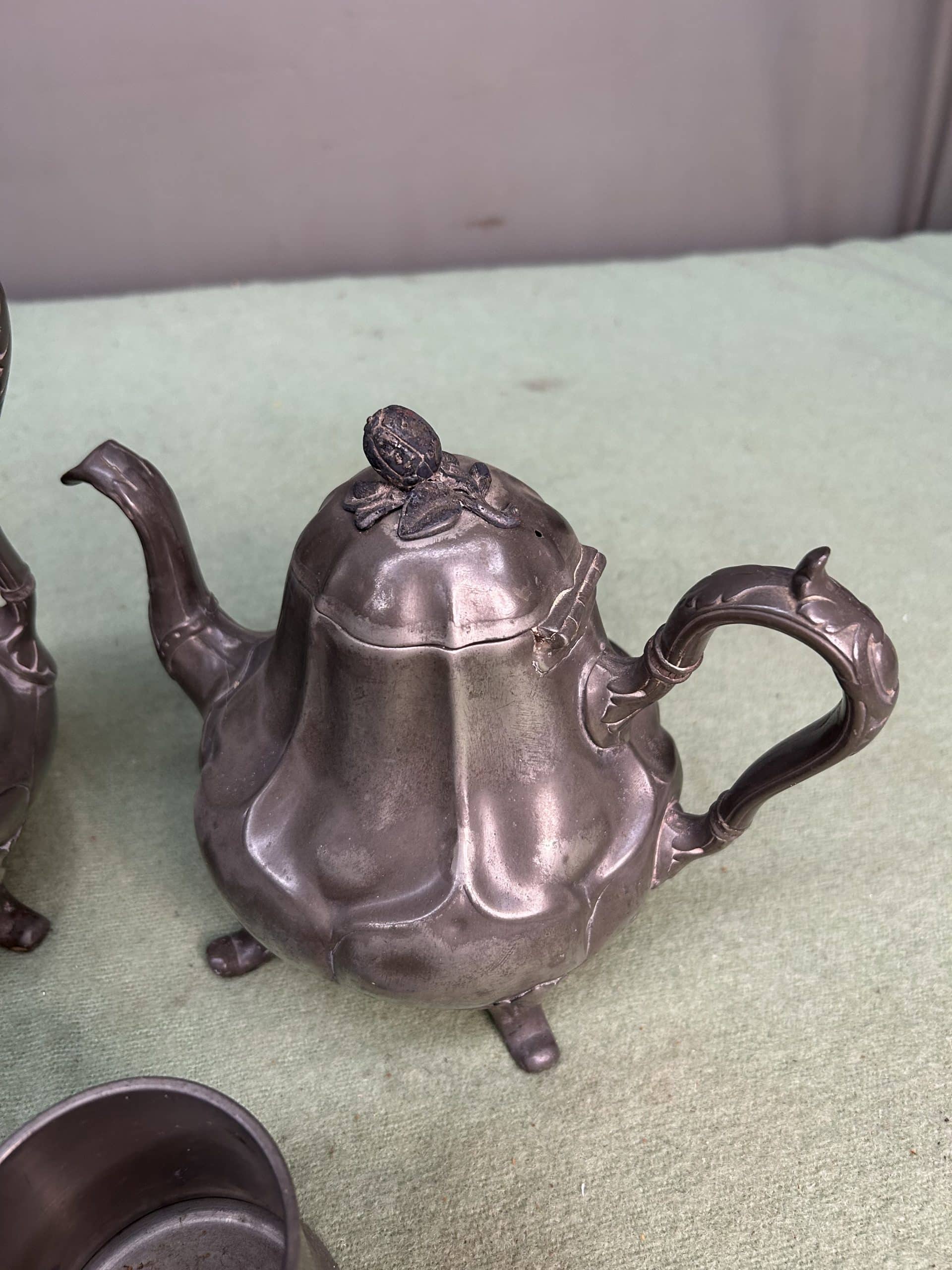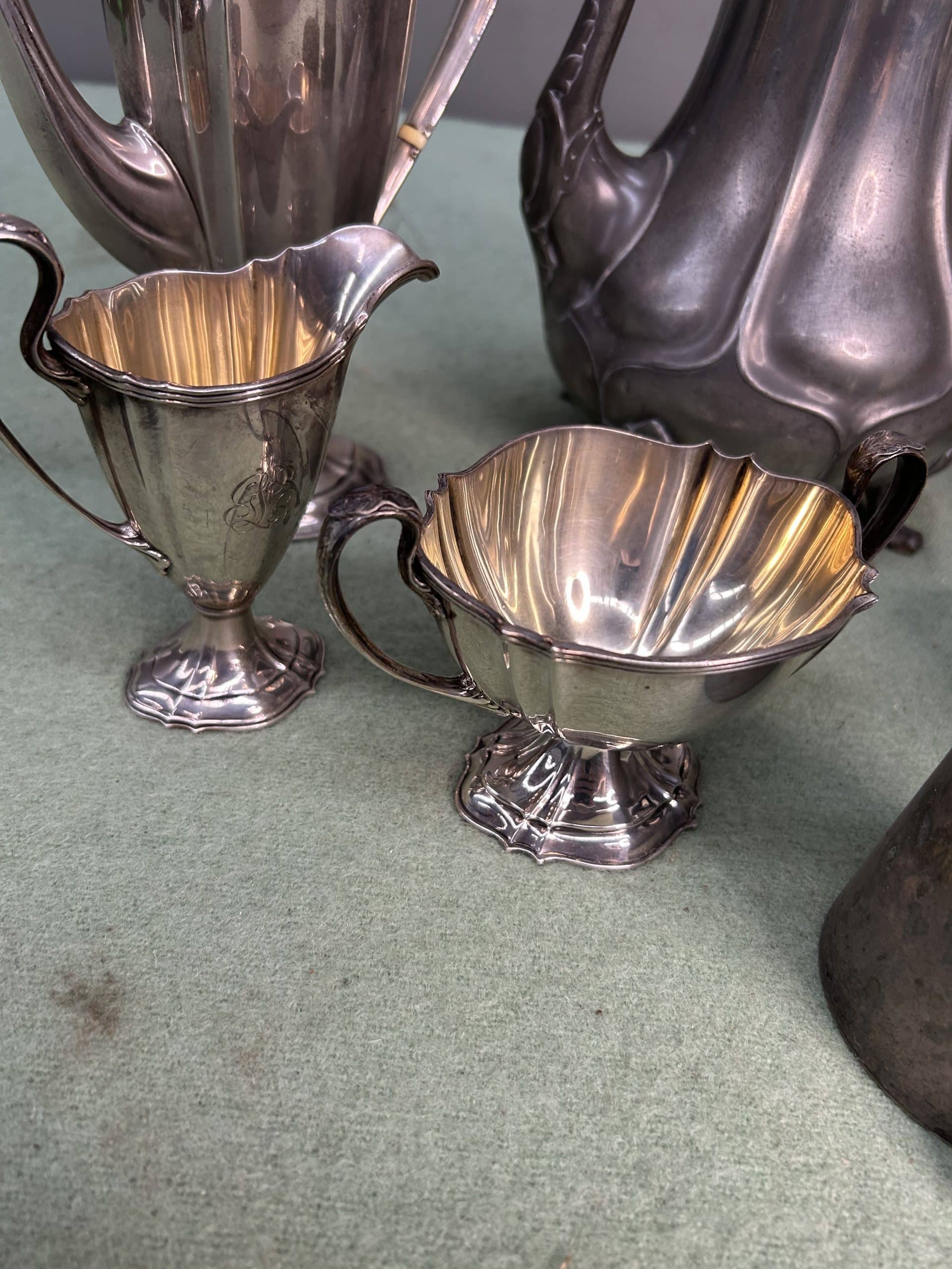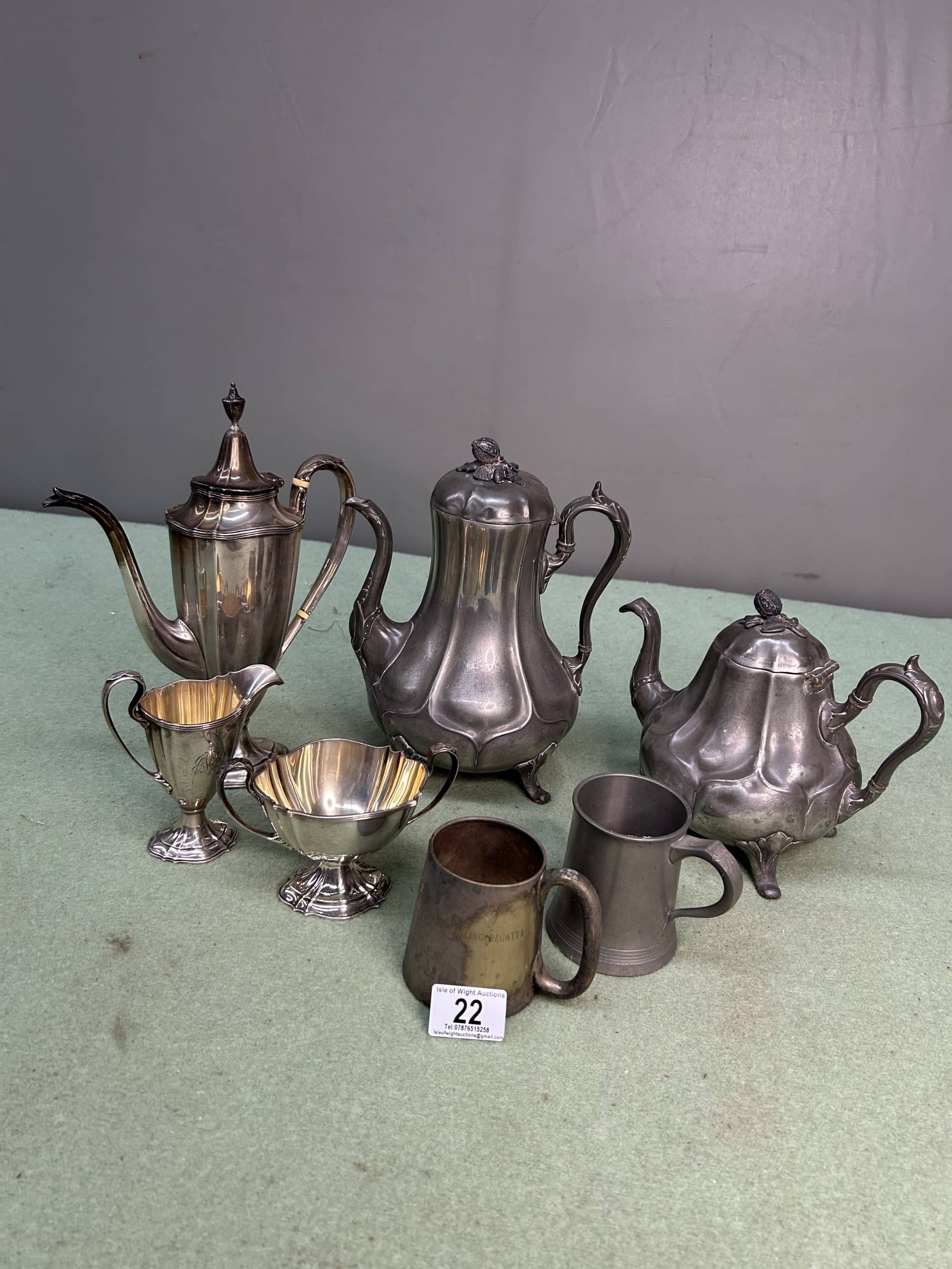 Victorian Pewter including coffee pot, teapot, vintage silver plated coffee pot, vintage antique silver creamer & sugar bowl, pewter tankard and brass jug