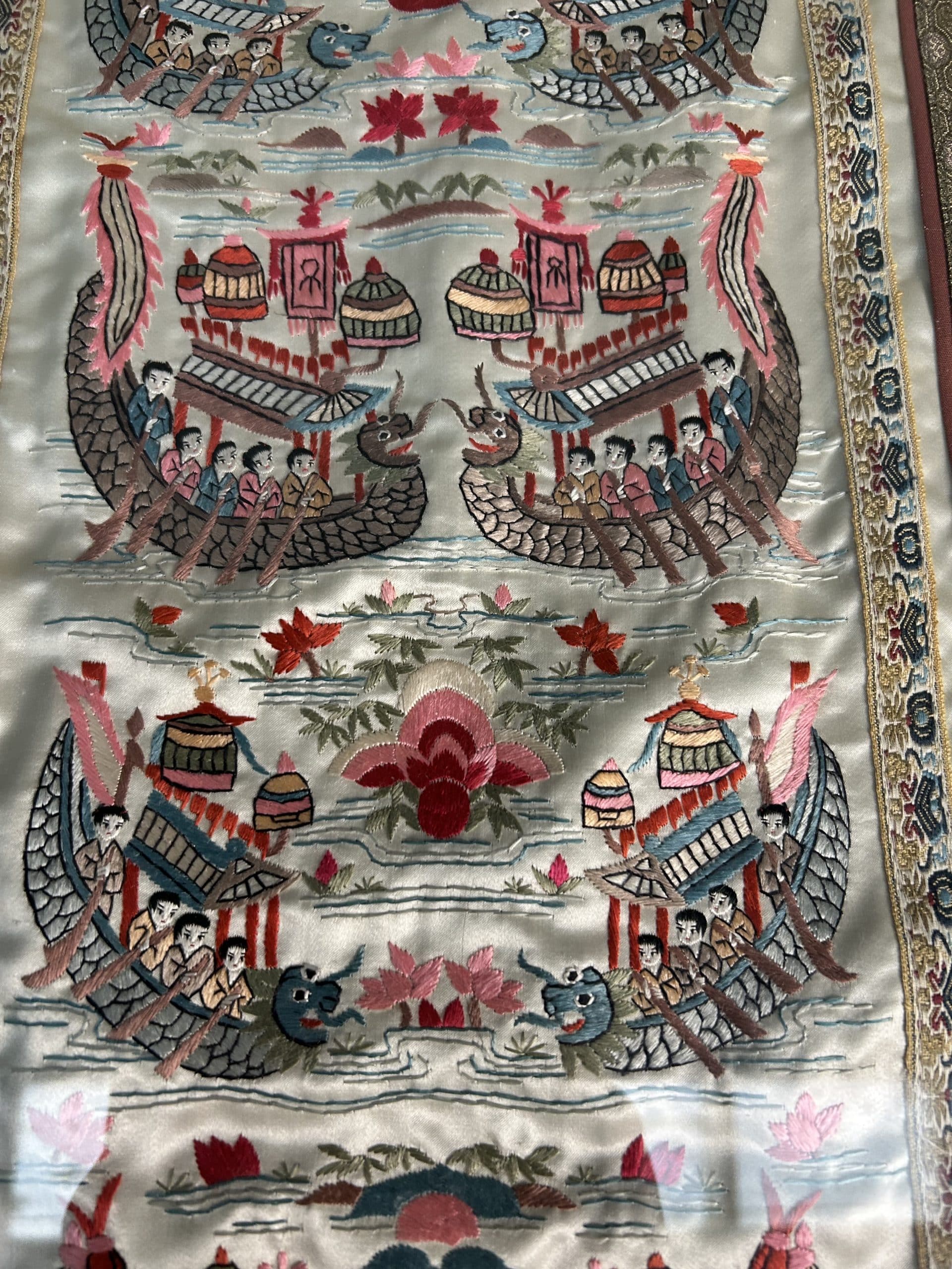 JTA Auction| Item description: | Framed 20th century Chinese embroidery silk panel boating scene similar to “Hundred Boys” framed textile art |