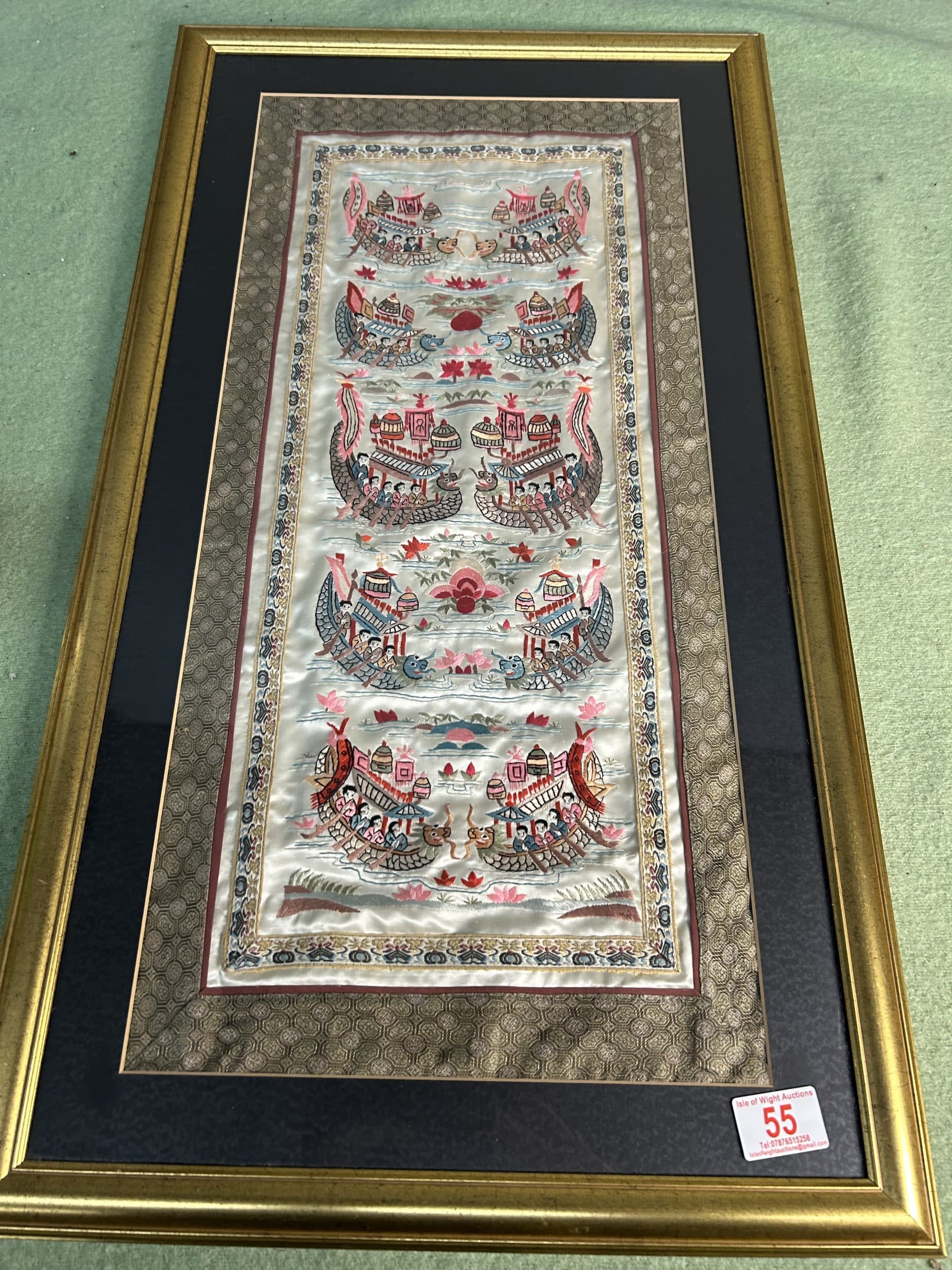 JTA Auction| Item description: | Framed 20th century Chinese embroidery silk panel boating scene similar to “Hundred Boys” framed textile art |