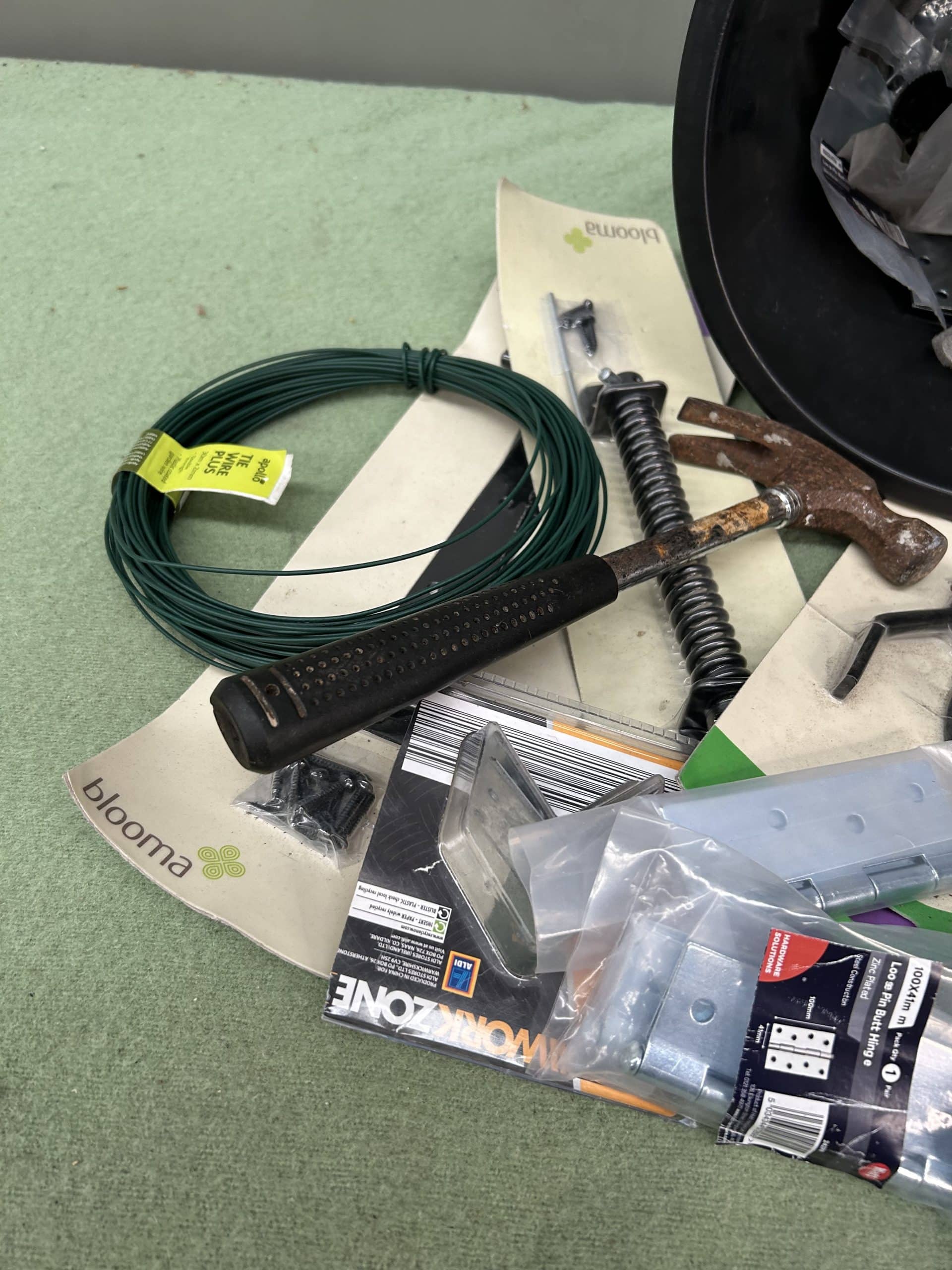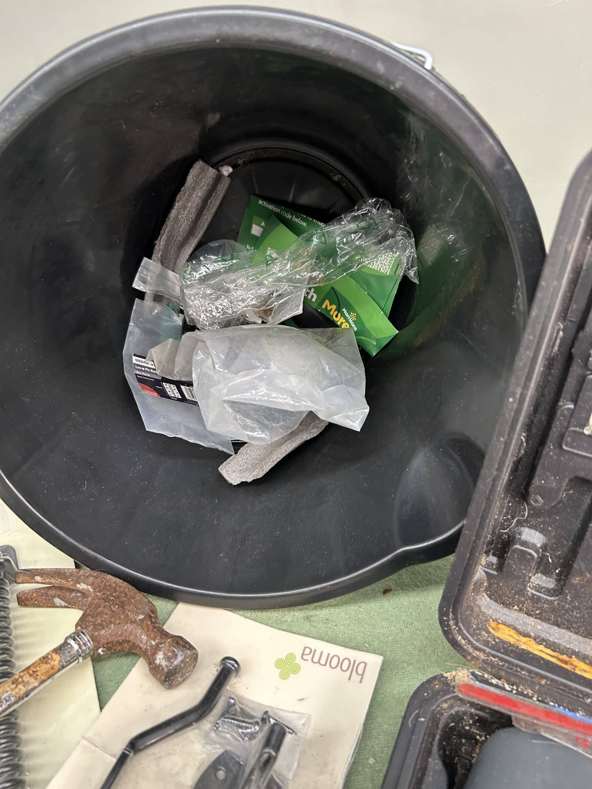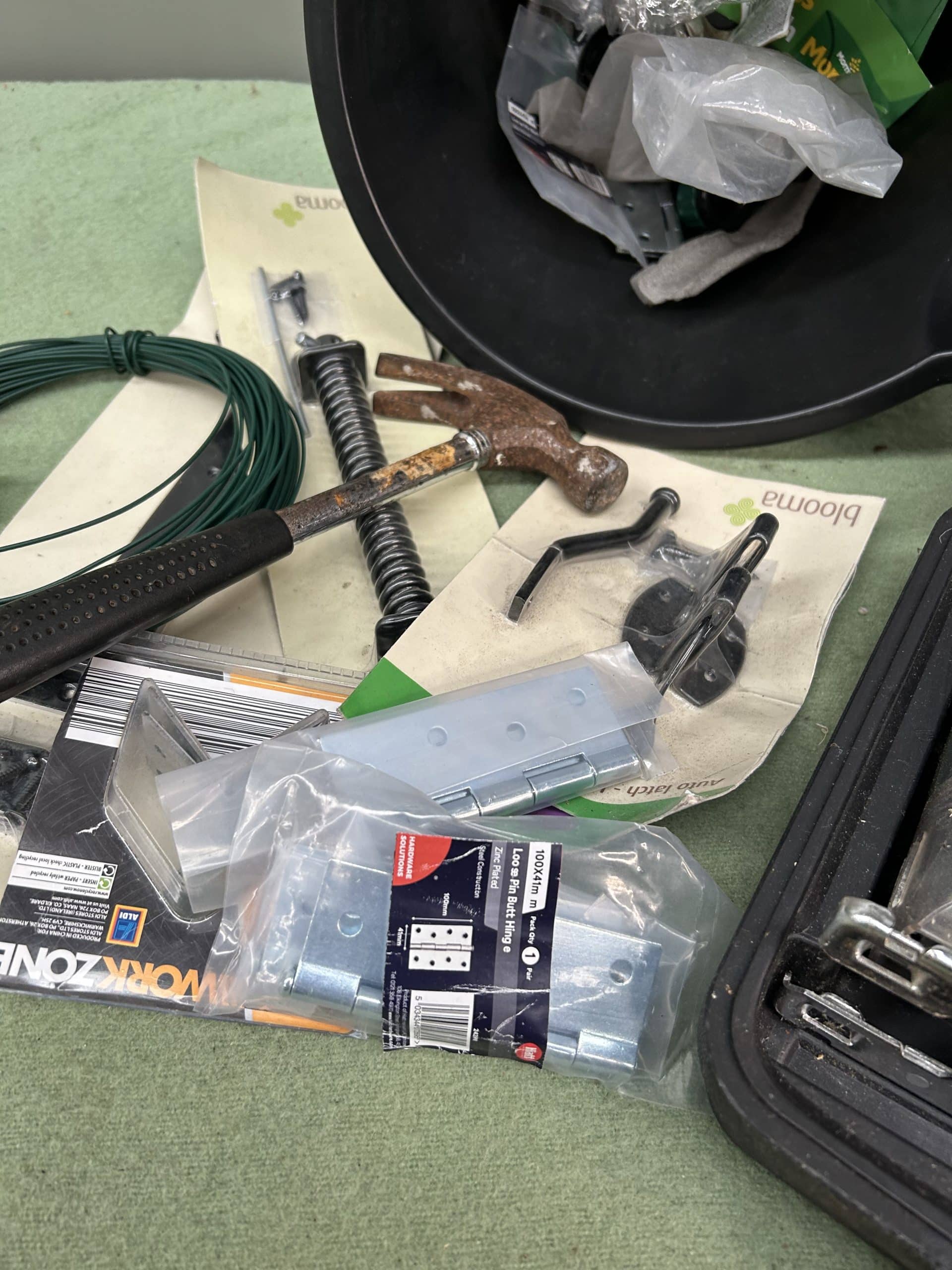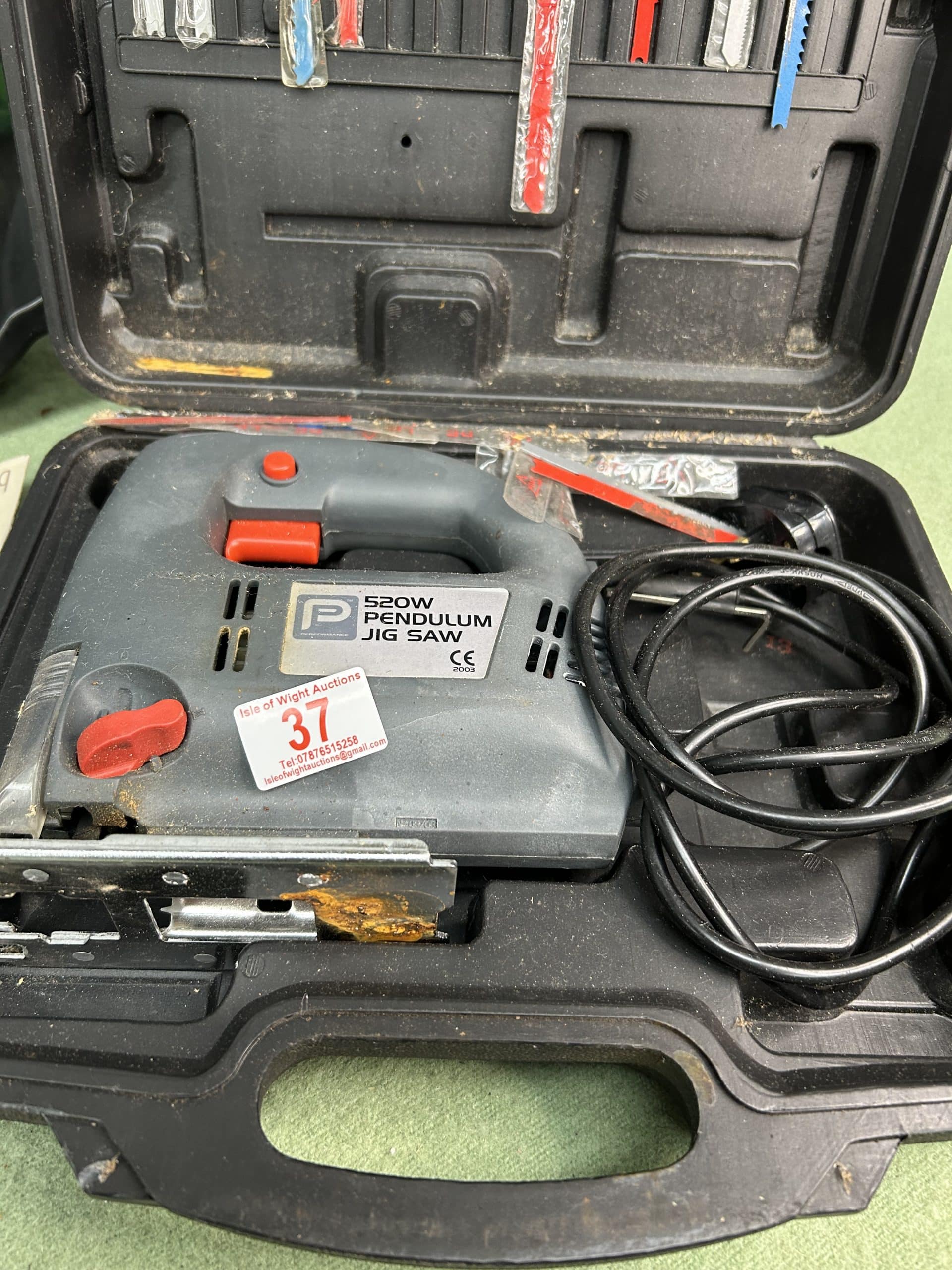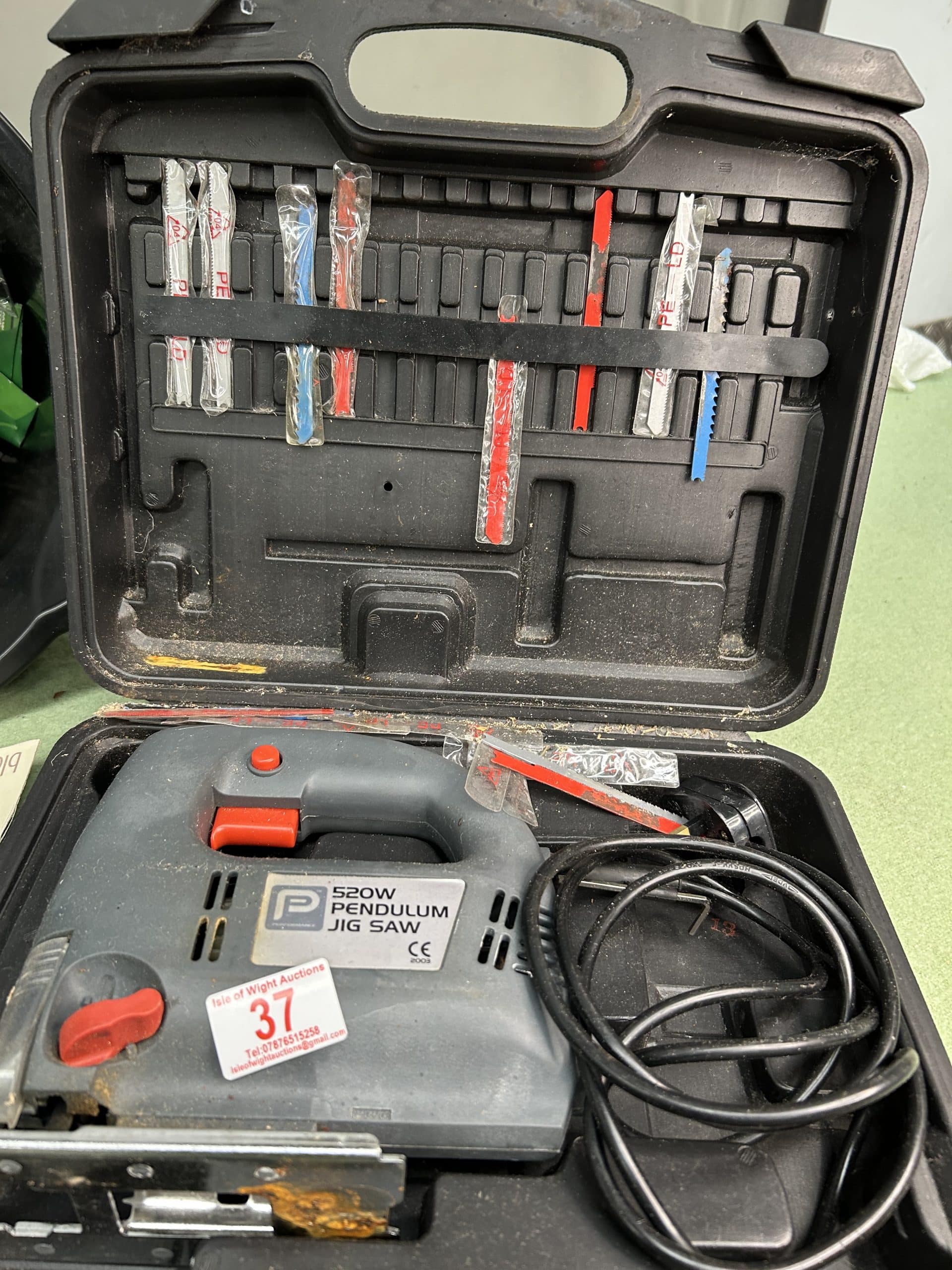 Electric jigsaw untested in case with spare blades, bucket of hand tools and sundries