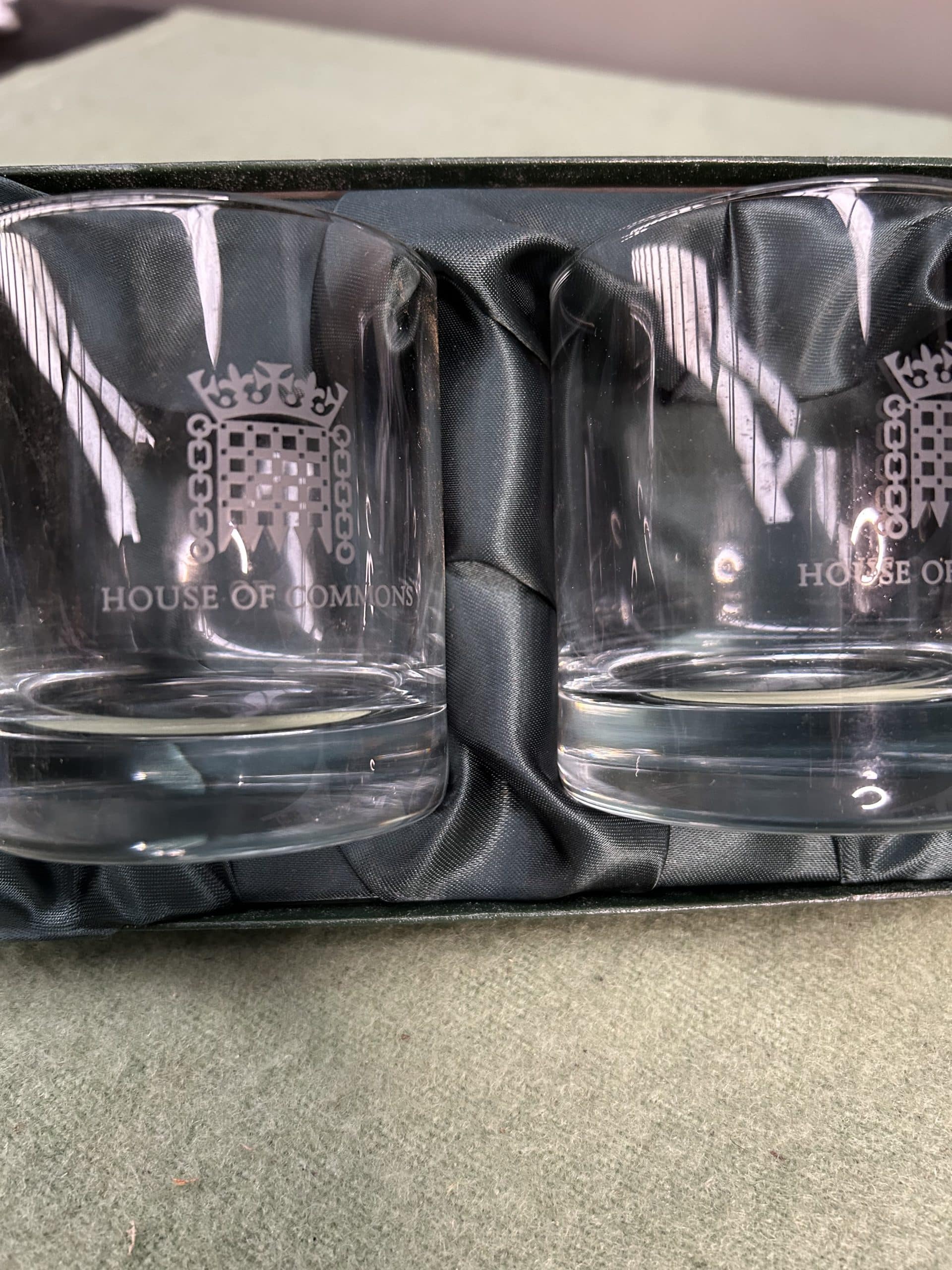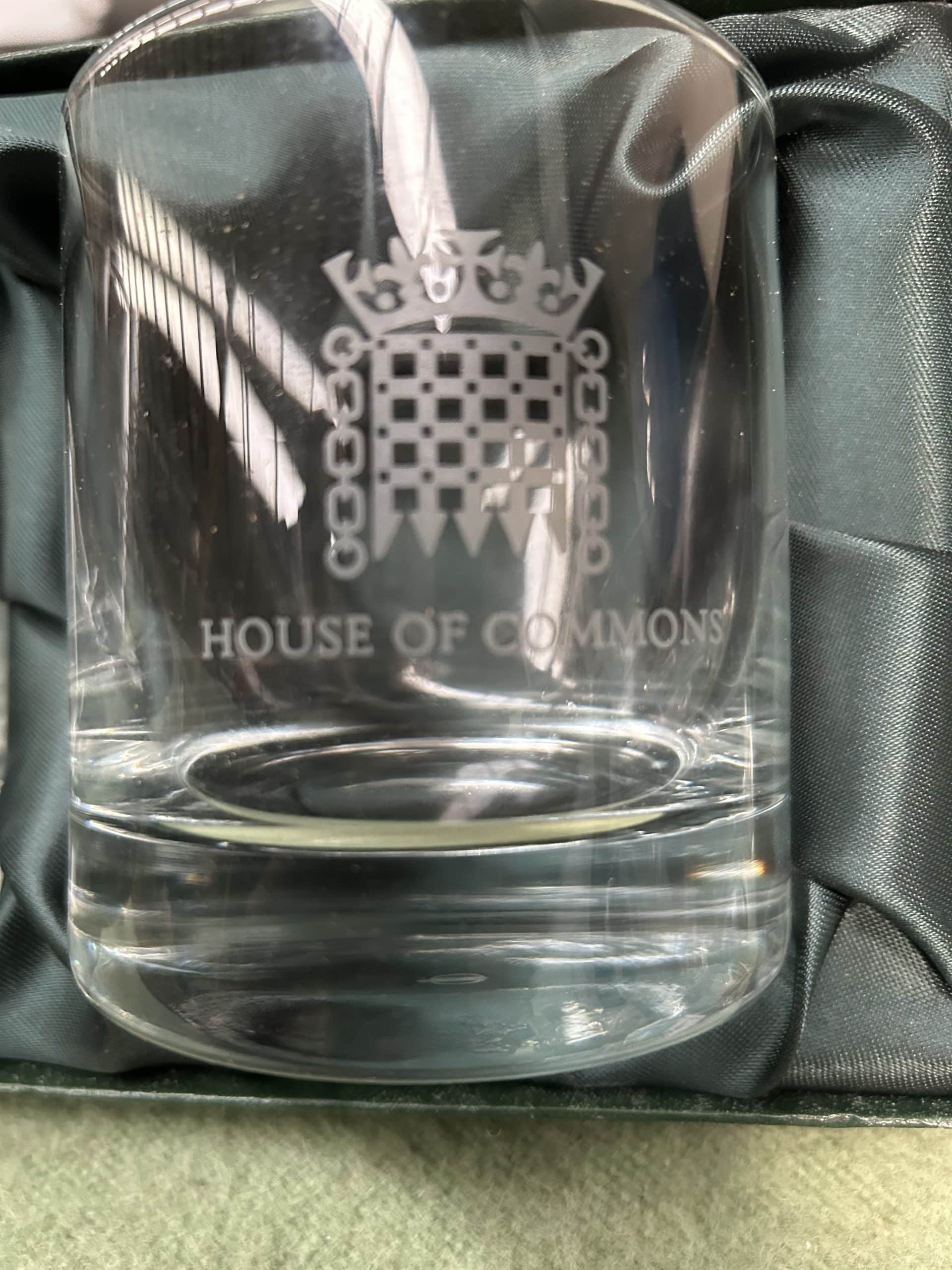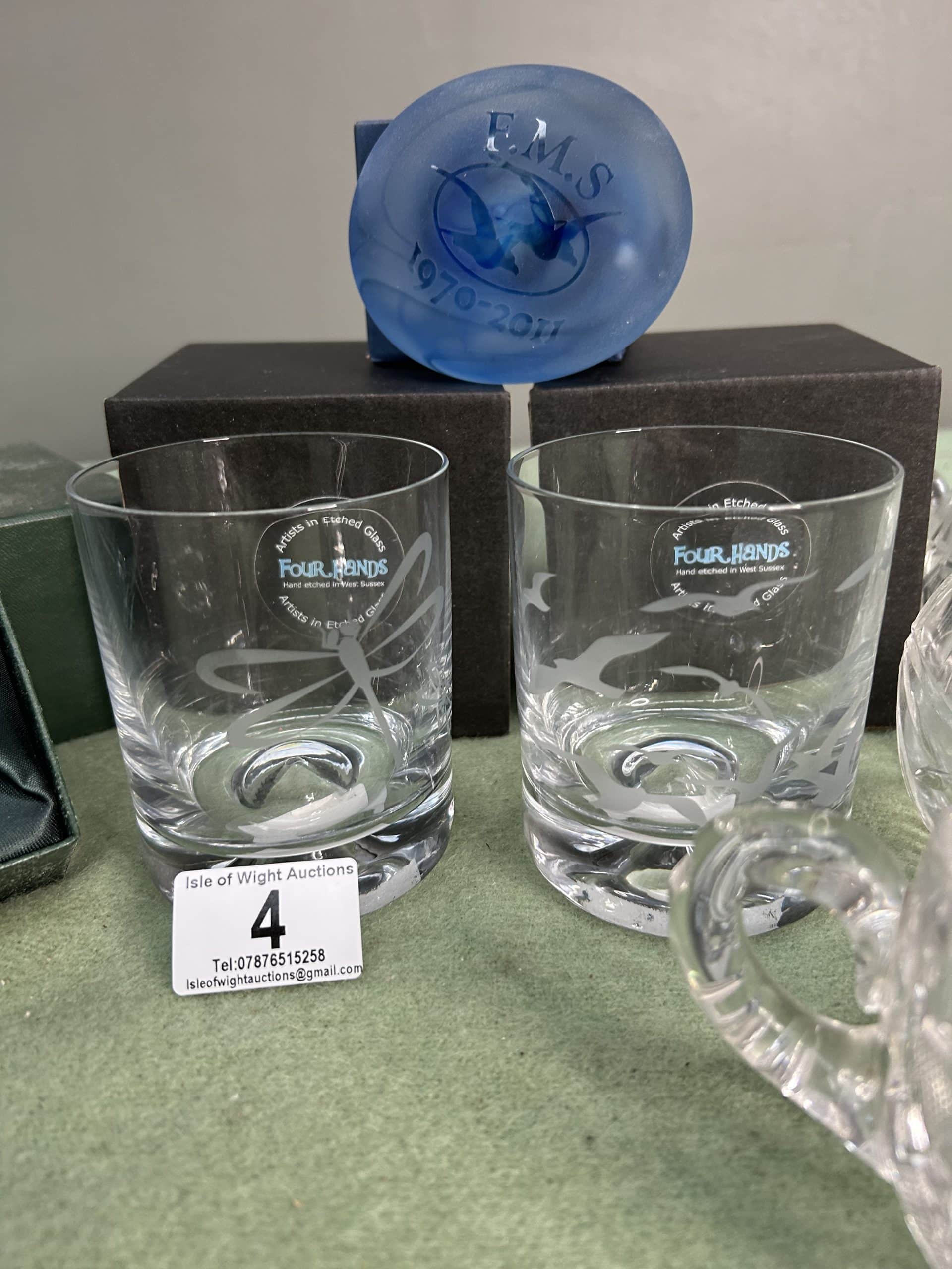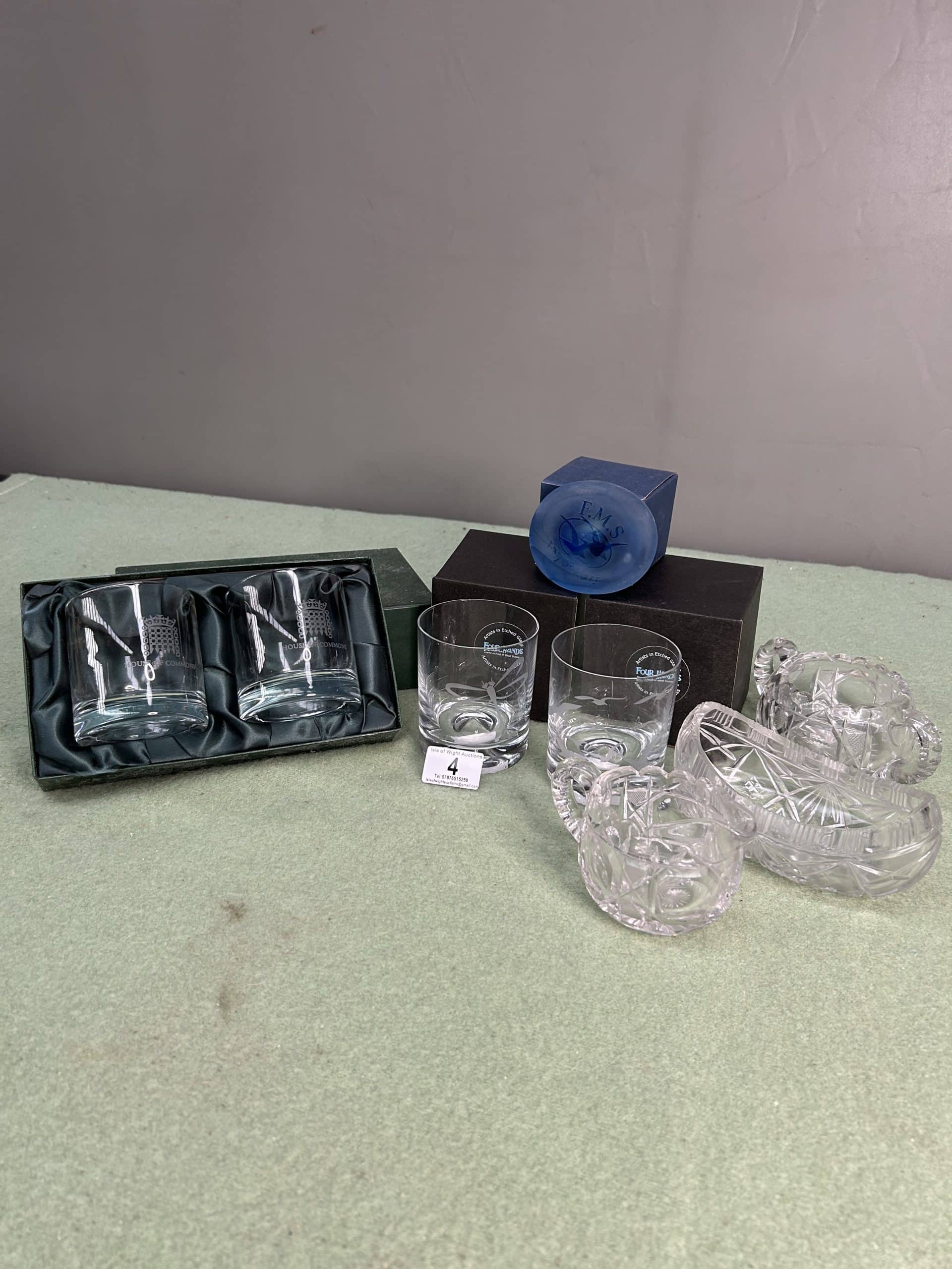 Wren Auction (Part One)| Item description: | Collection of glassware including a pair of House of Commons whisky tumblers in presentation box, two etched glass one seagulls and one dragonfly plus 3 pieces of vintage cut glass sugar bowl, creamer and oval bowl |