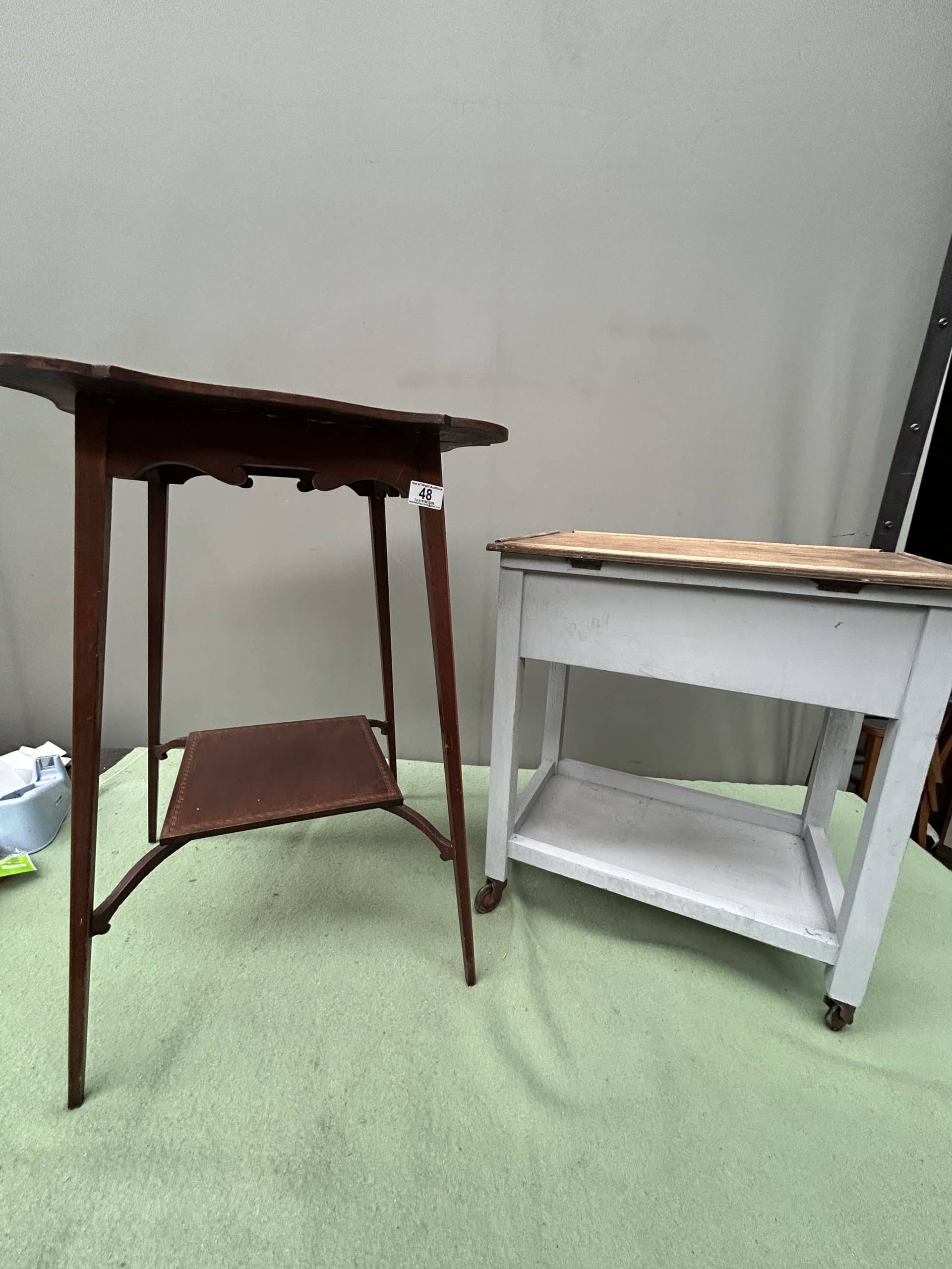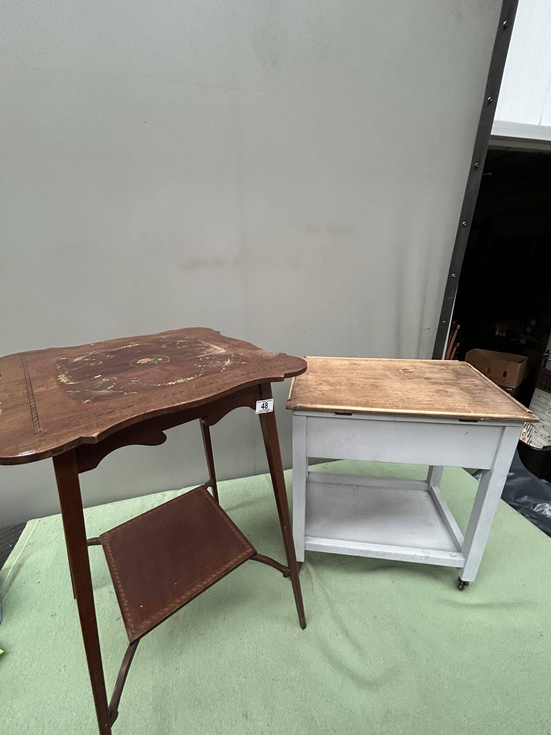 Tilly’s Auction (part three)| Item description: | Two side Tables one decorative needs repair plus lower side table with wheels |