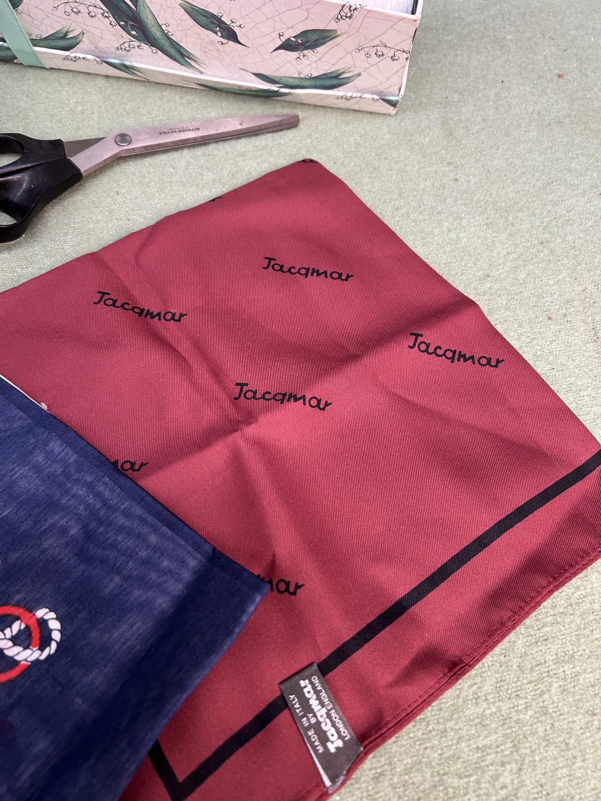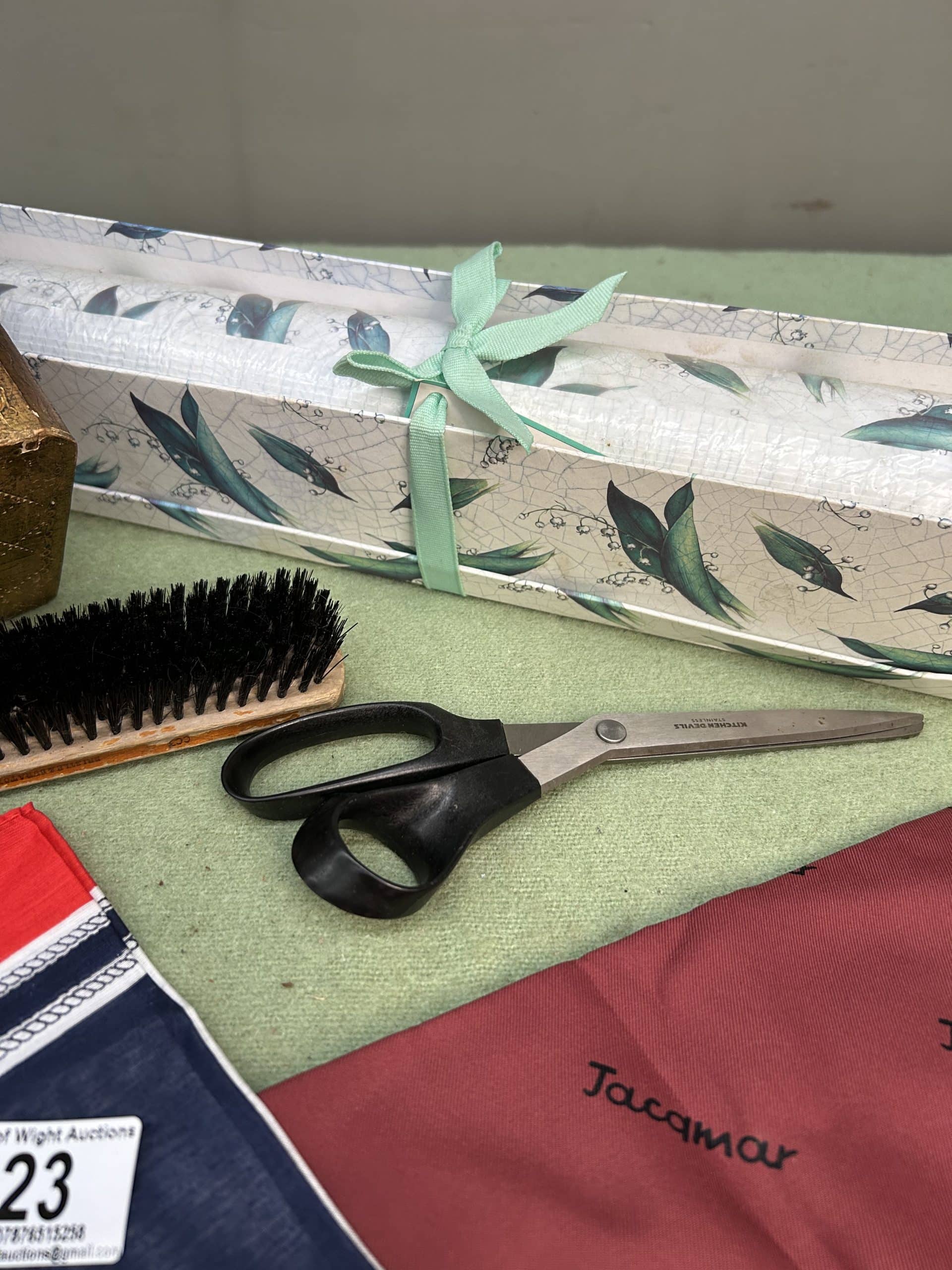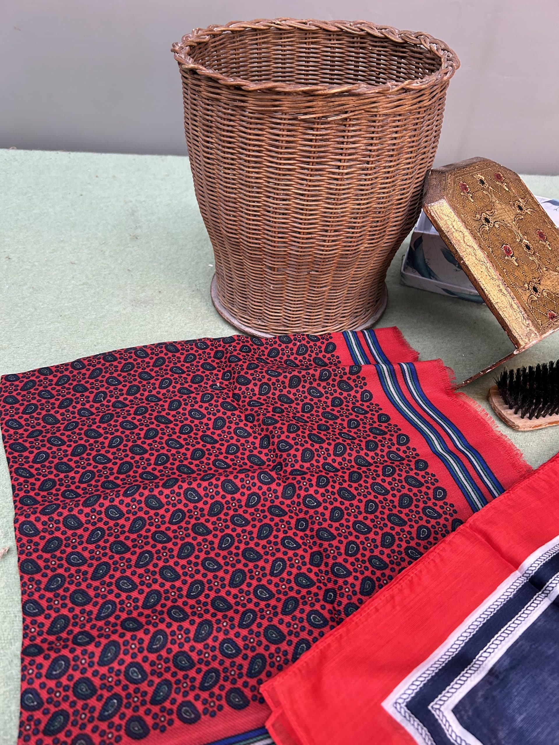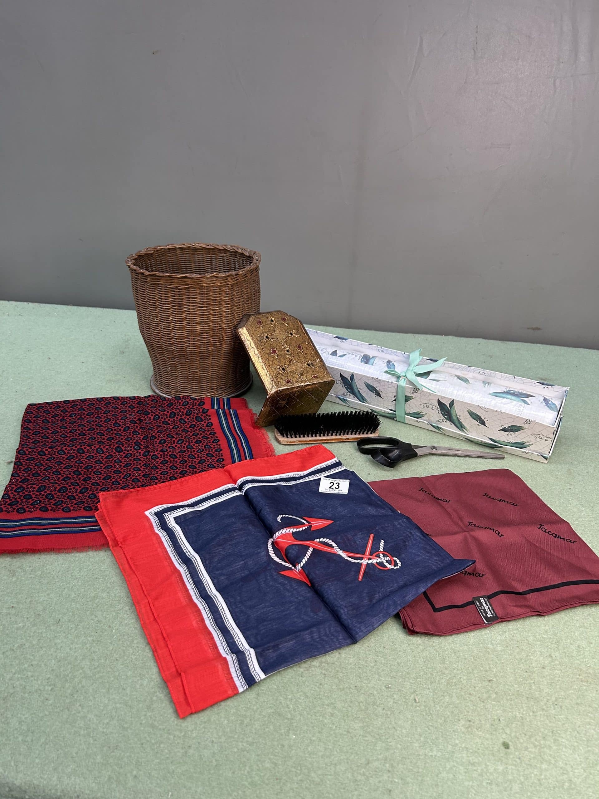 Mixed Lot including three head scarves, clothes brush, scissors, drawer liners, wicker basket
